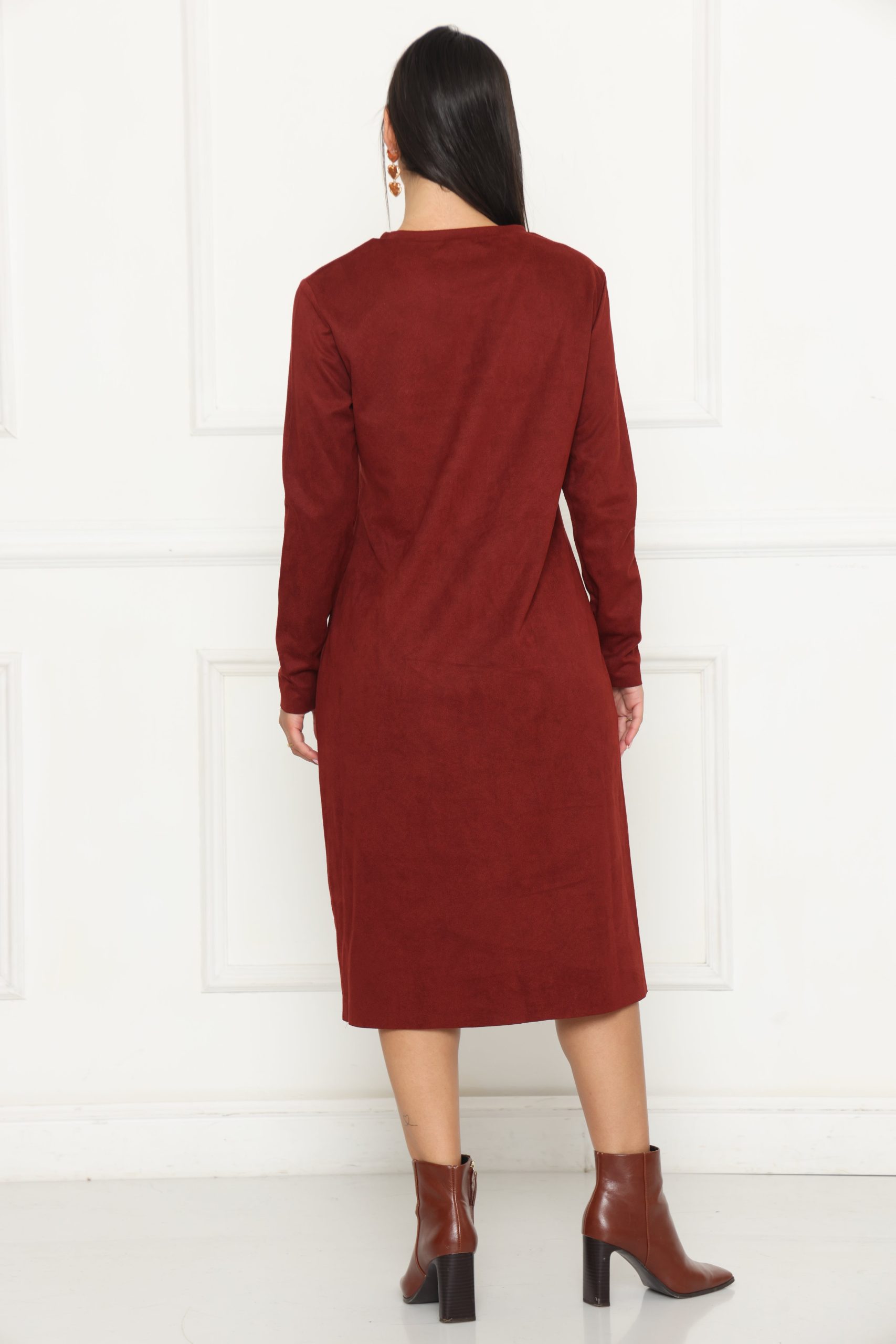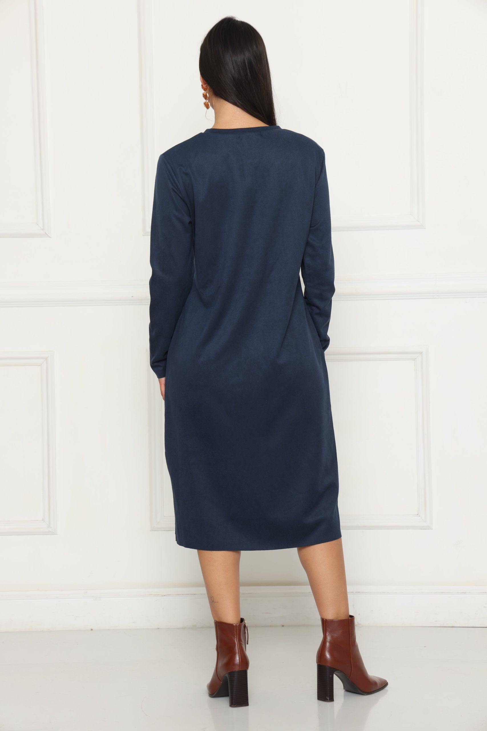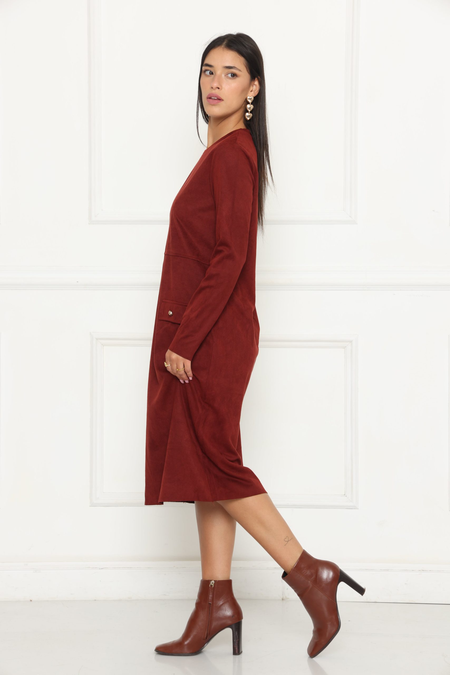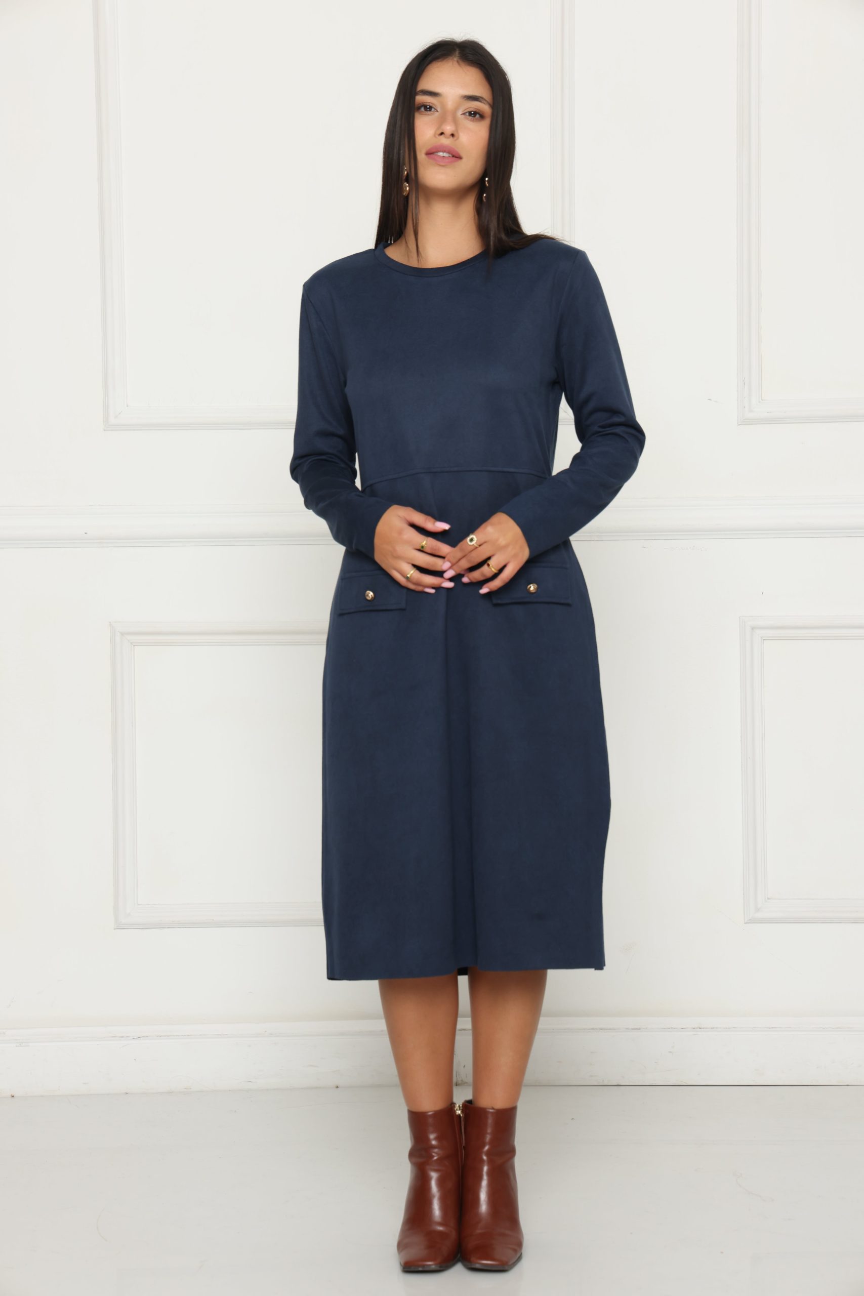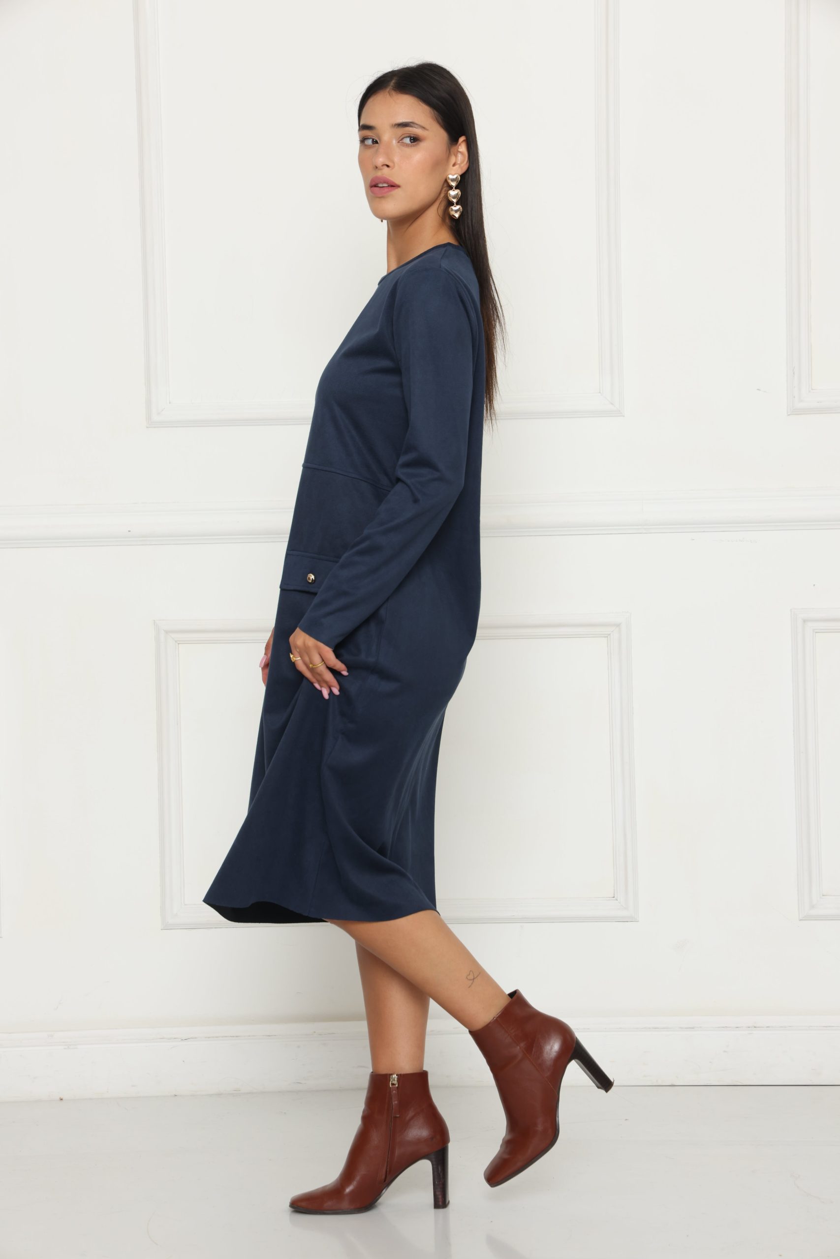 שמלת ג'מש רכה עם כיסים קדמיים, בגזרה נוחה ומחמיאה, מושלמת למראה יומיומי עם טאץ’ אלגנטי.