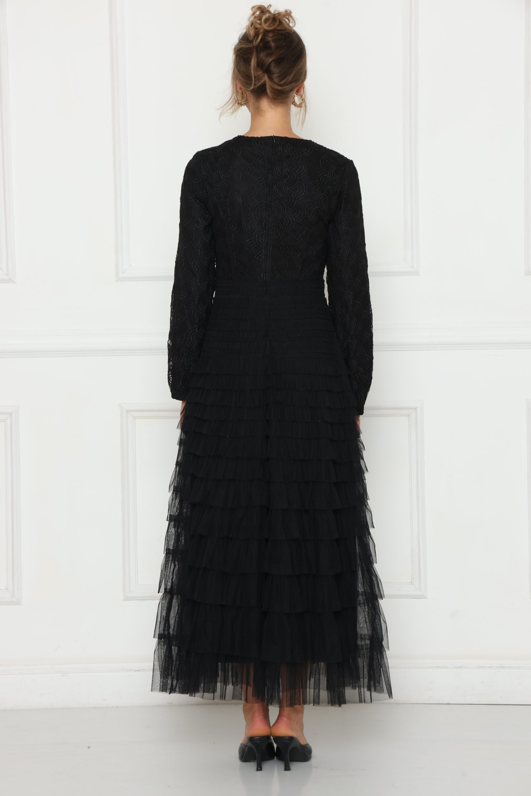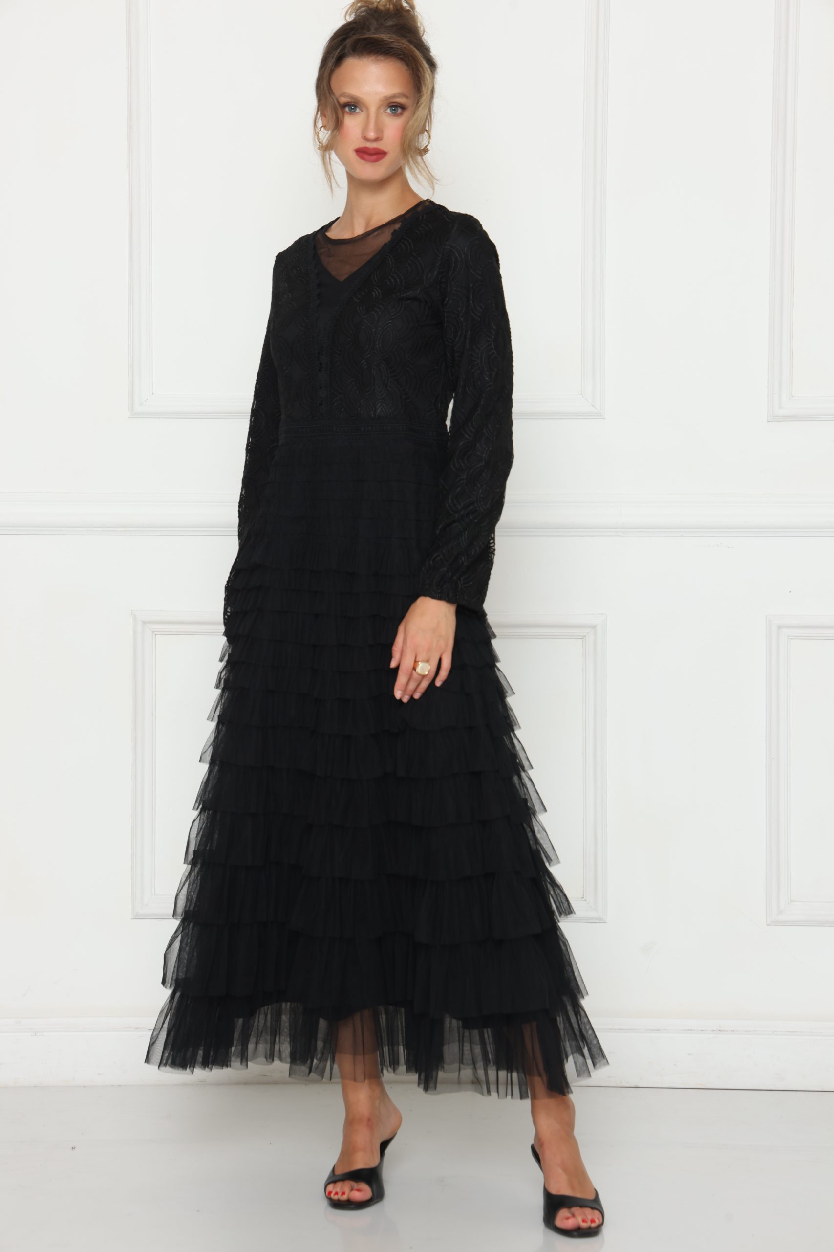 שמלת ערב צנועה ומרשימה באורך מקסי, המעניקה מראה אלגנטי ונשי לכל אירוע רשמי או חגיגי.