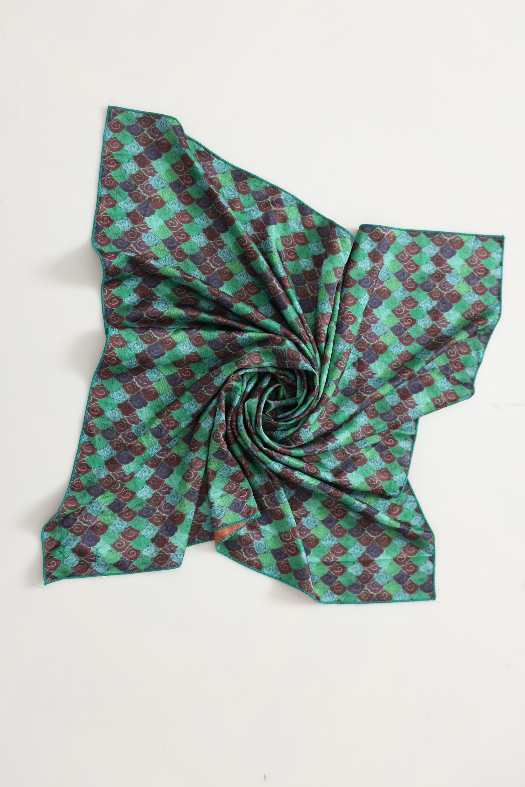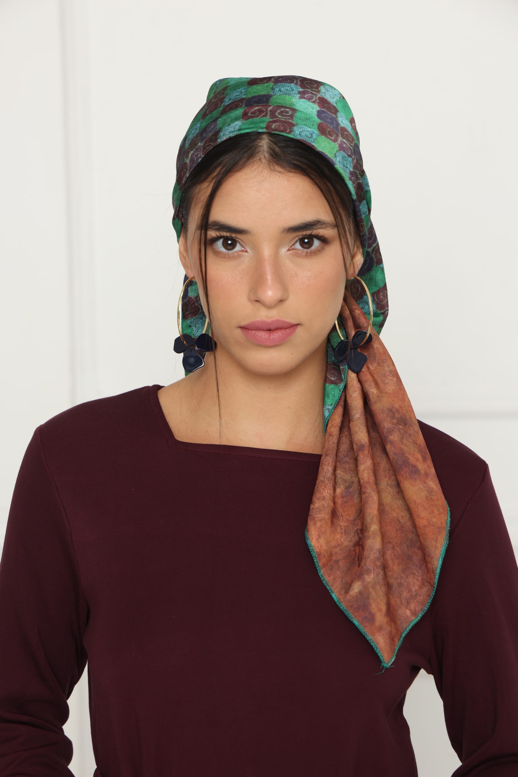 בנדנה סאטן ירוק חום, מושלם כצעיף קליל, כיסוי אופנתי או כתוספת ייחודית ללוק יומיומי וחגיגי.