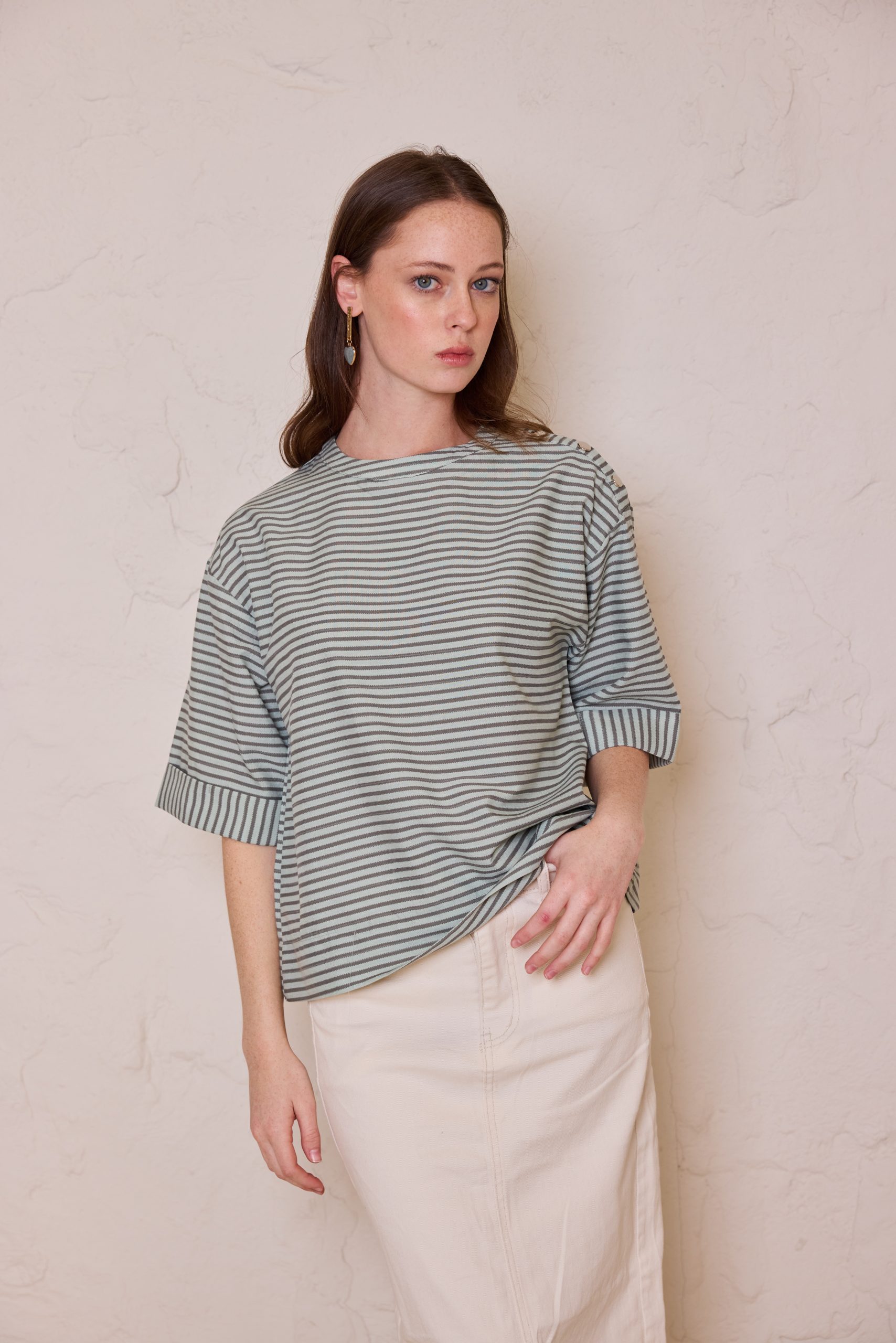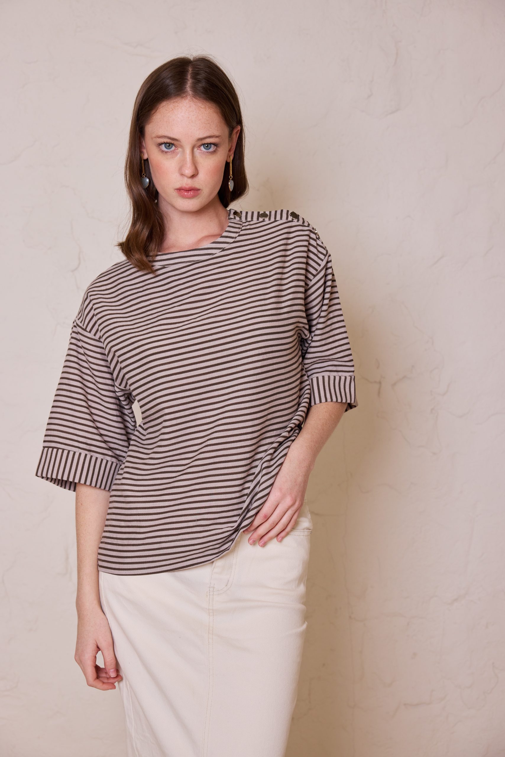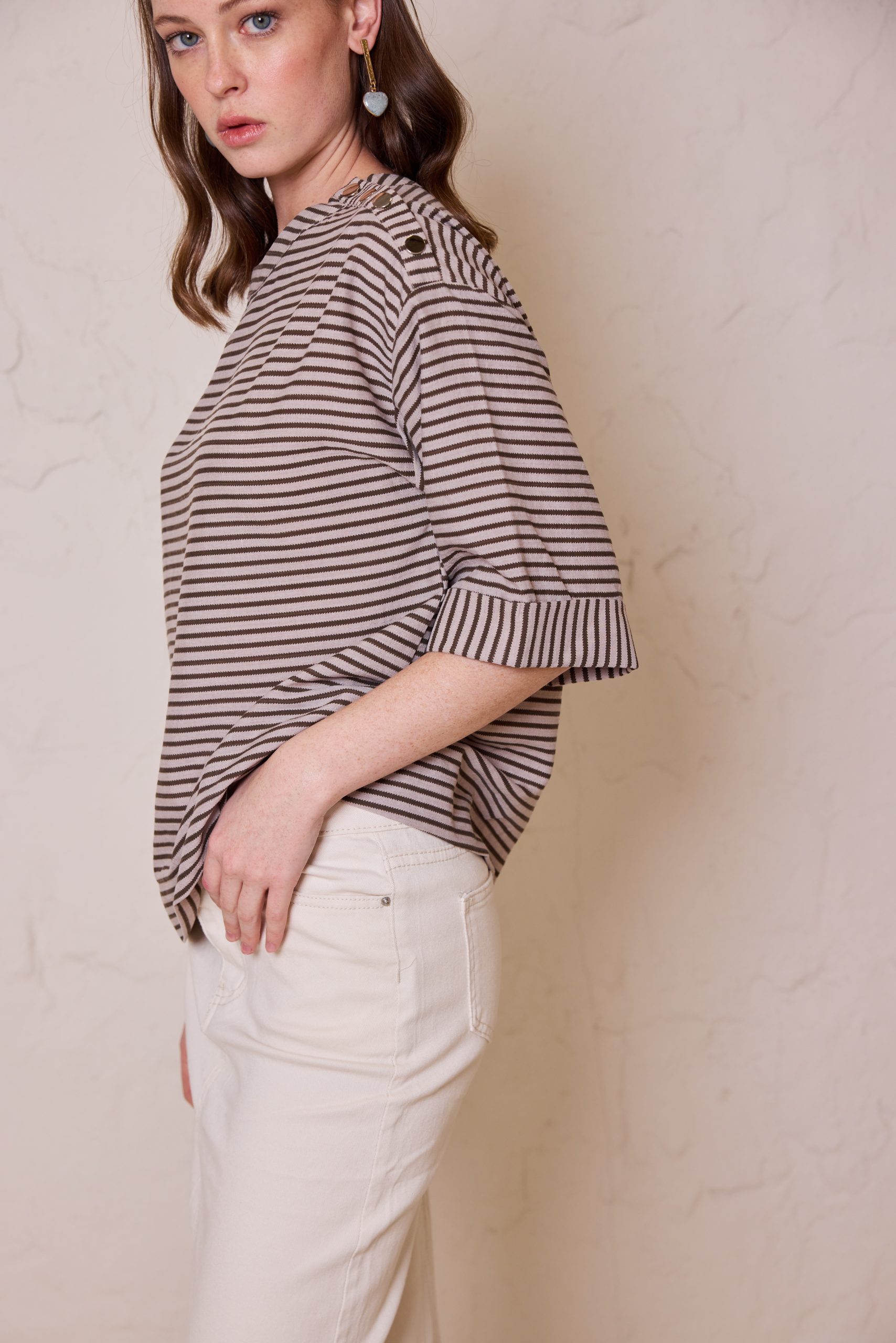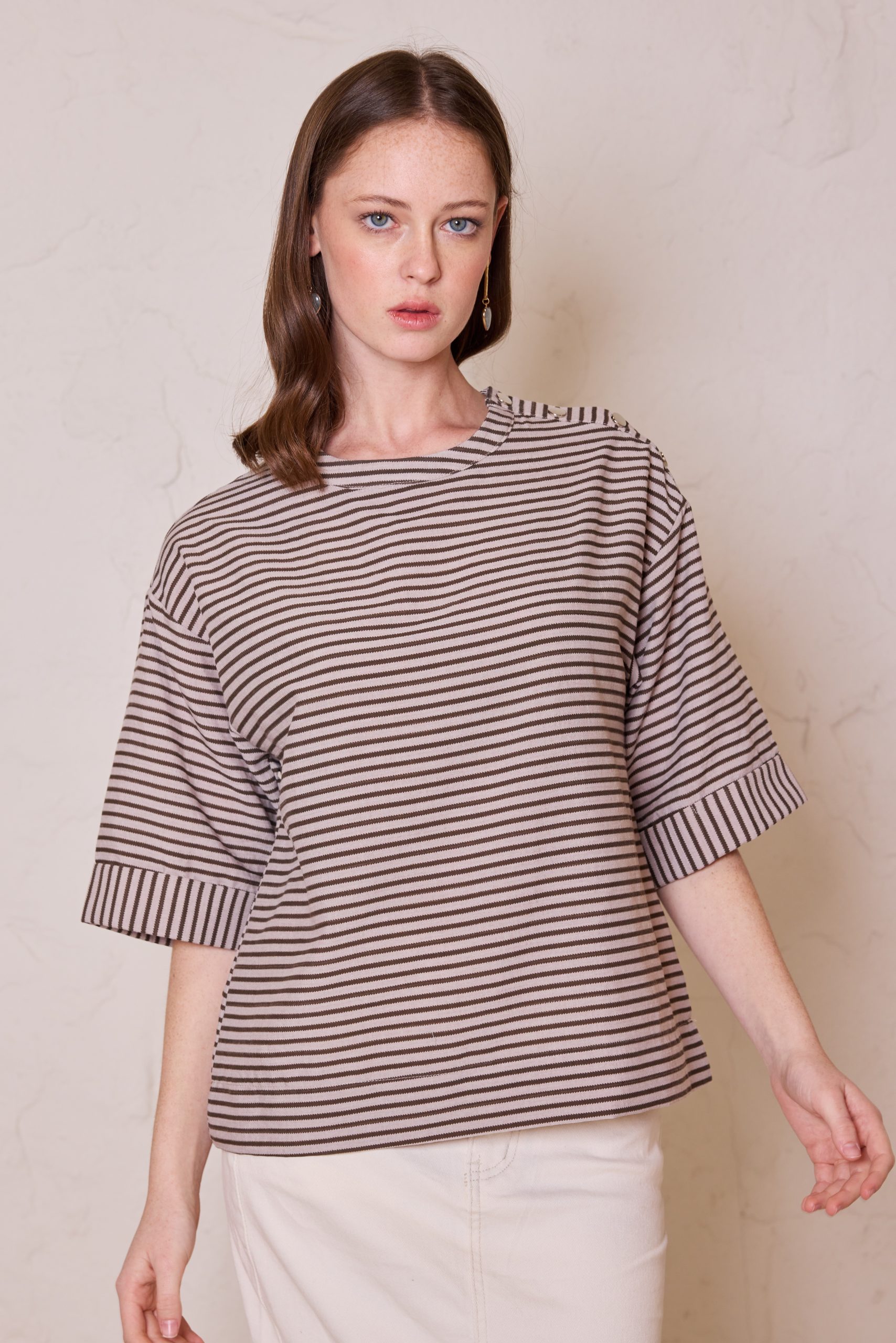 חולצה מעוצבת המשלבת הדפס פסים קלאסי עם דיטייל ייחודי של כפל בשרוול, המעניק לה נפח עדין ומראה מודרני.