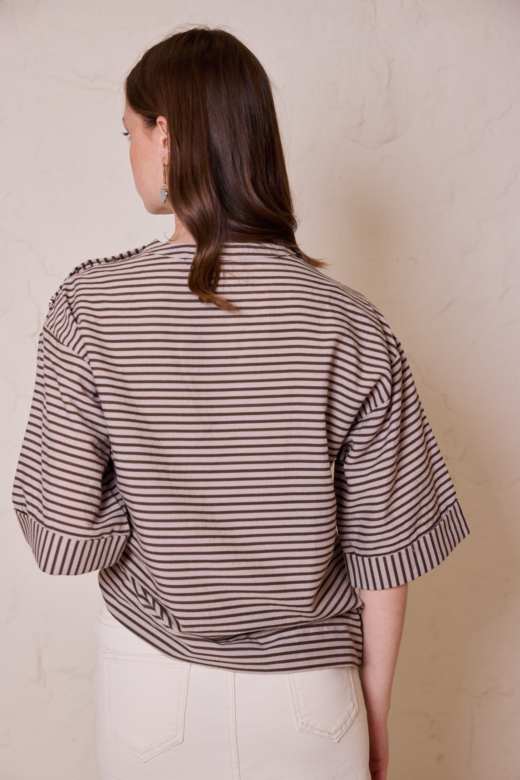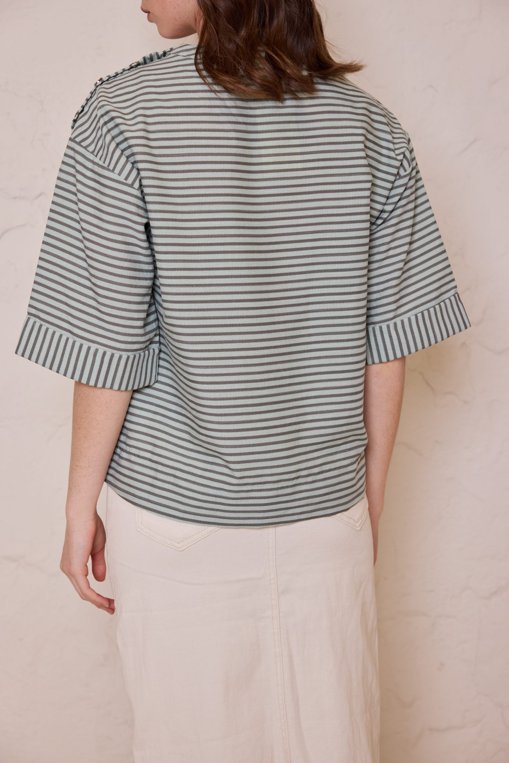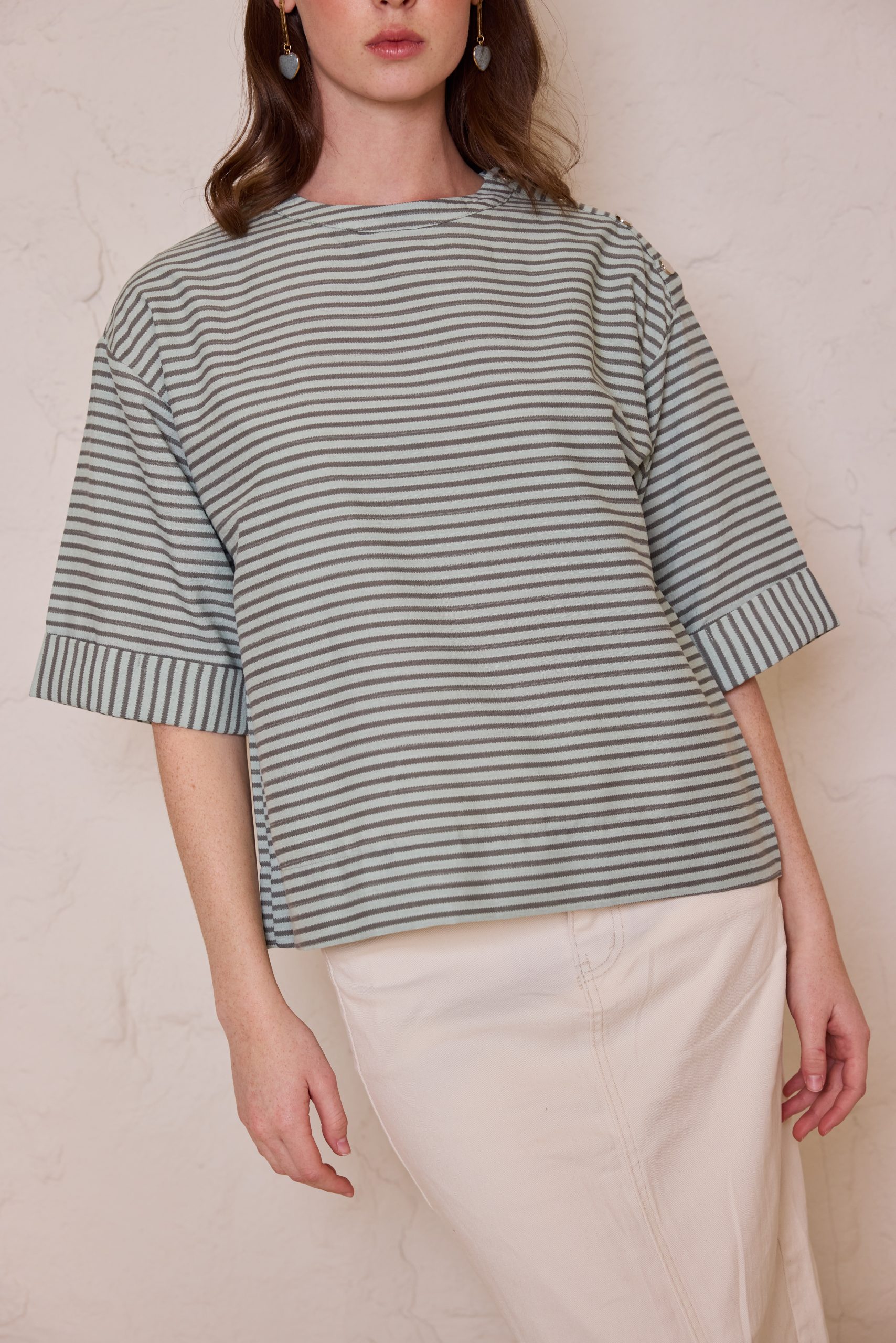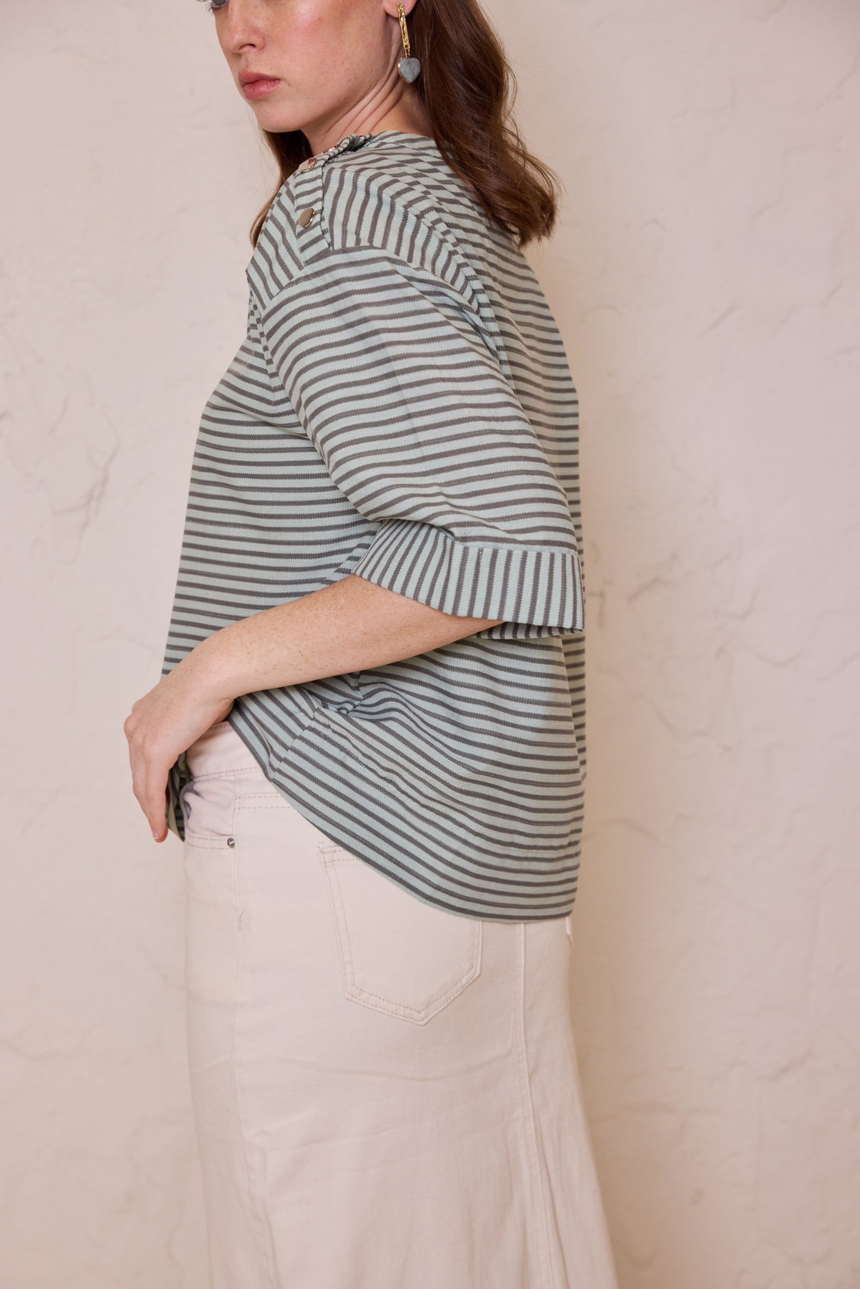 חולצה מעוצבת המשלבת הדפס פסים קלאסי עם דיטייל ייחודי של כפל בשרוול, המעניק לה נפח עדין ומראה מודרני.