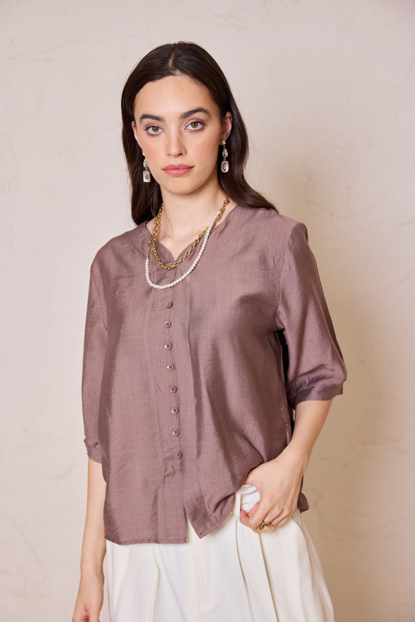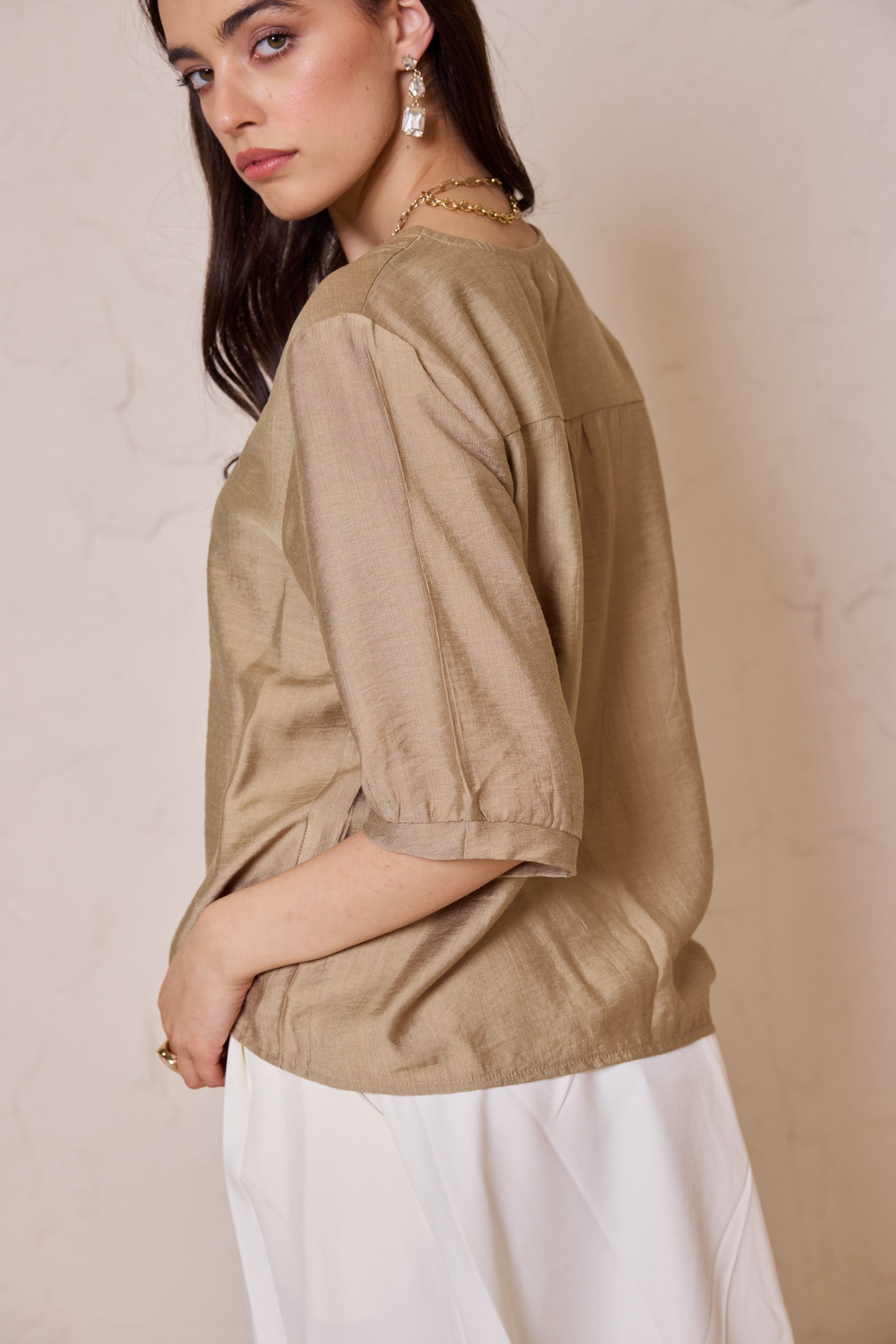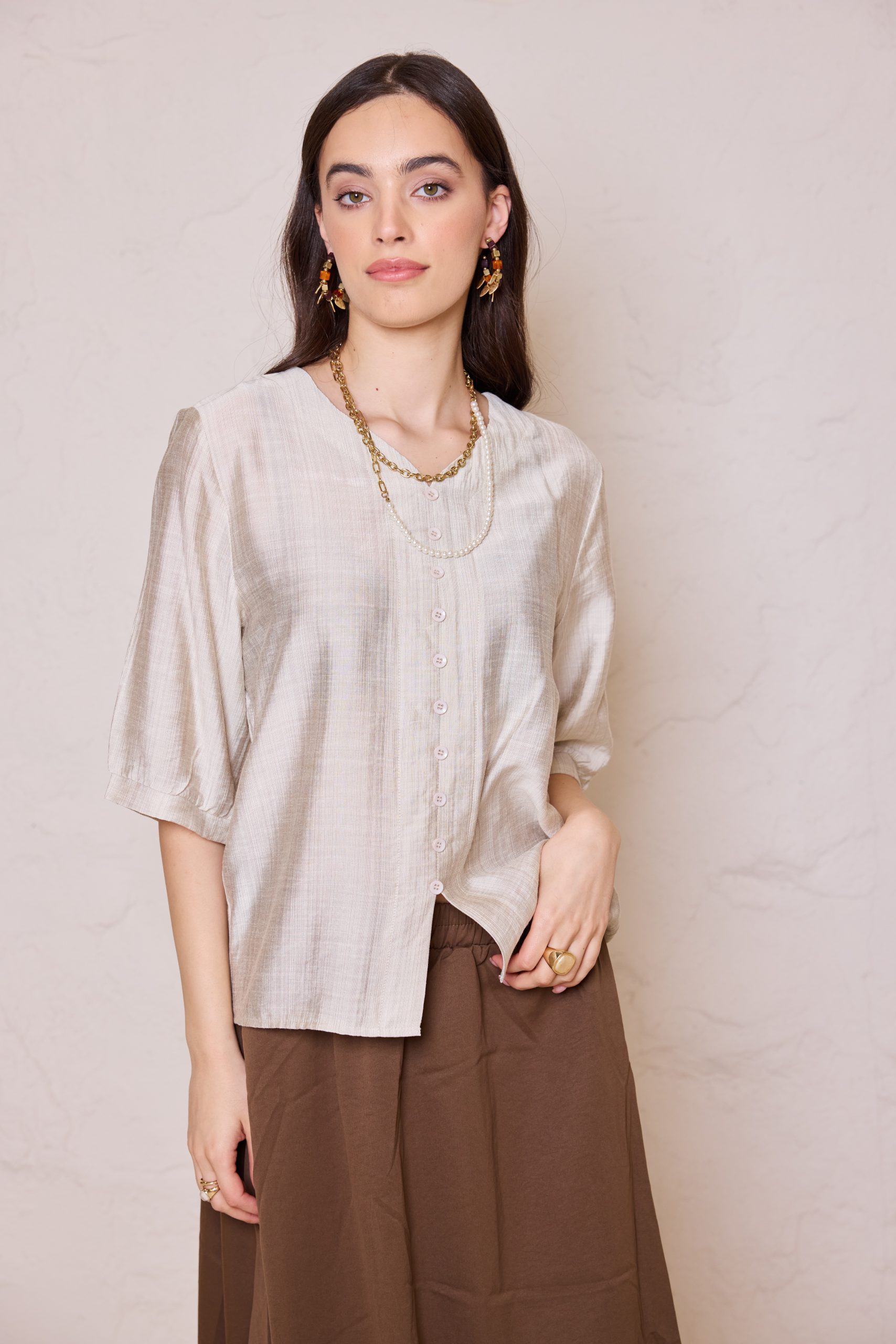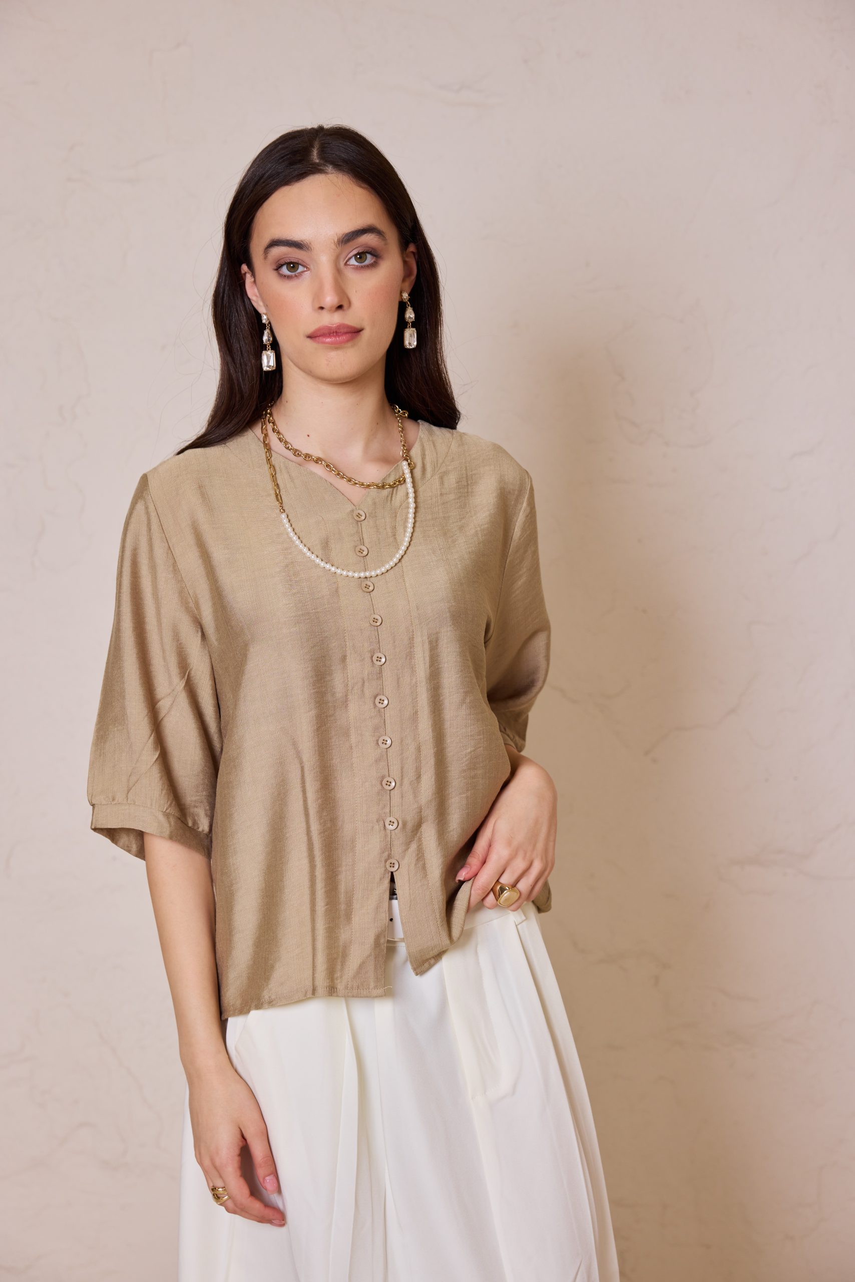 חולצת כפתורים קלאסית מבד פשתן איכותי, אוורירי ונושם, המשלבת מראה יוקרתי ונינוחות מרבית.