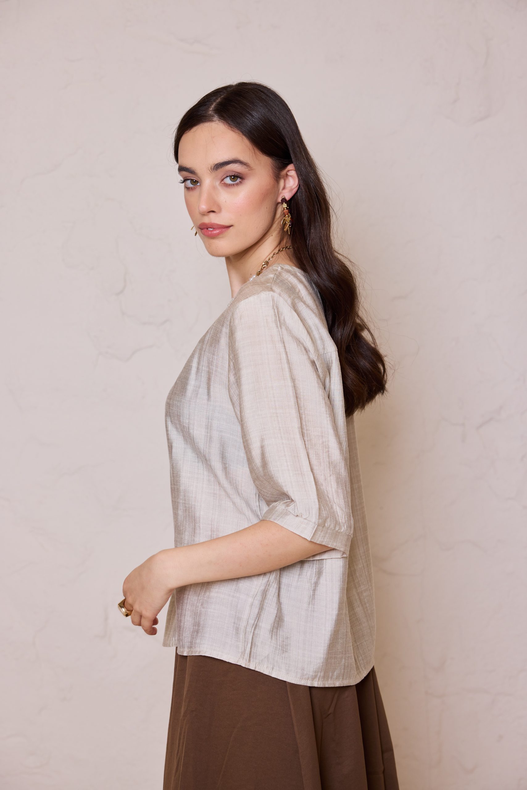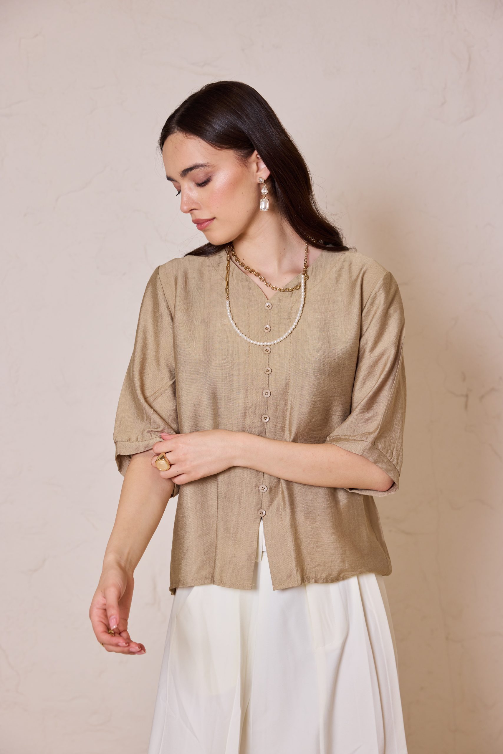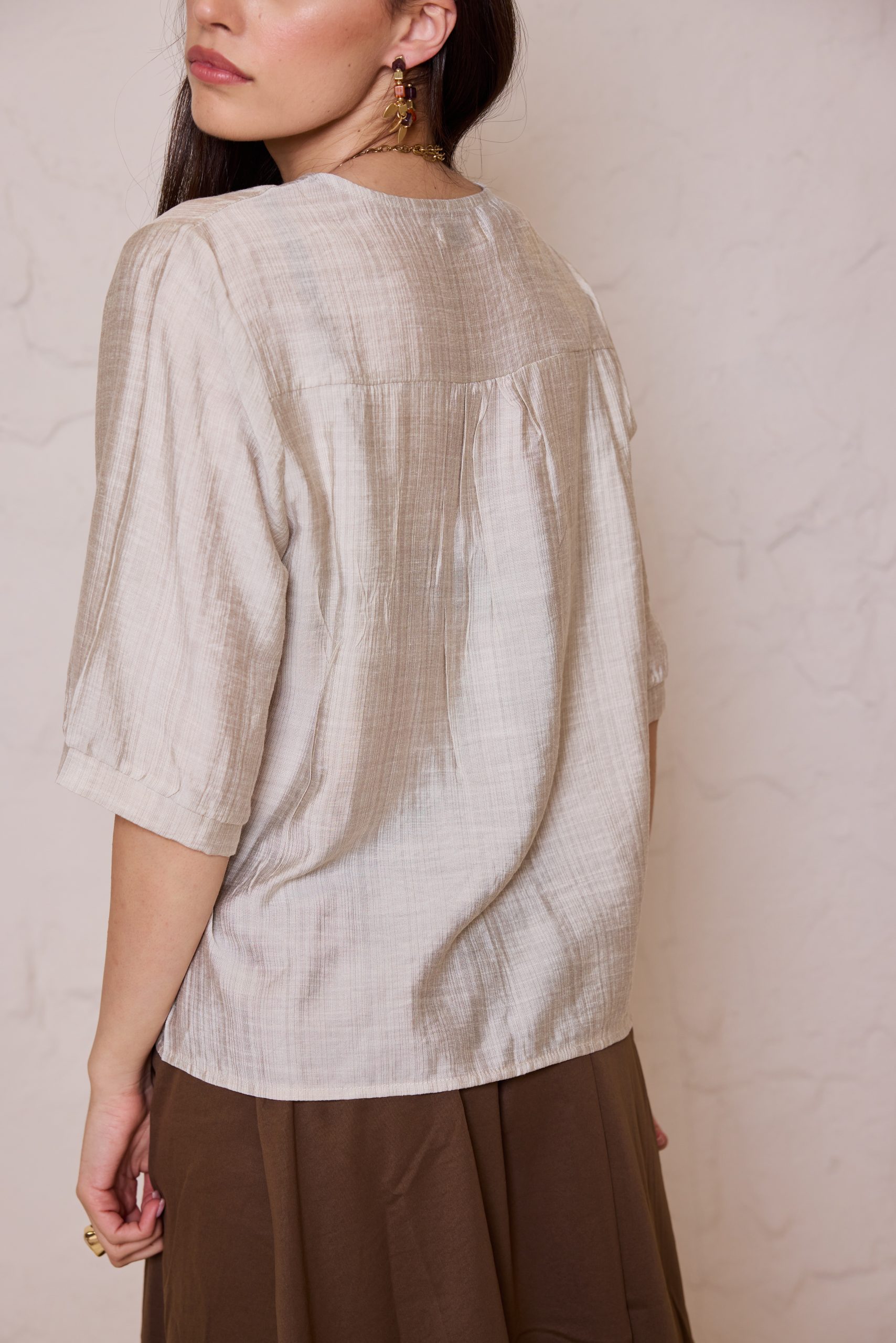 חולצת כפתורים קלאסית מבד פשתן איכותי, אוורירי ונושם, המשלבת מראה יוקרתי ונינוחות מרבית.
