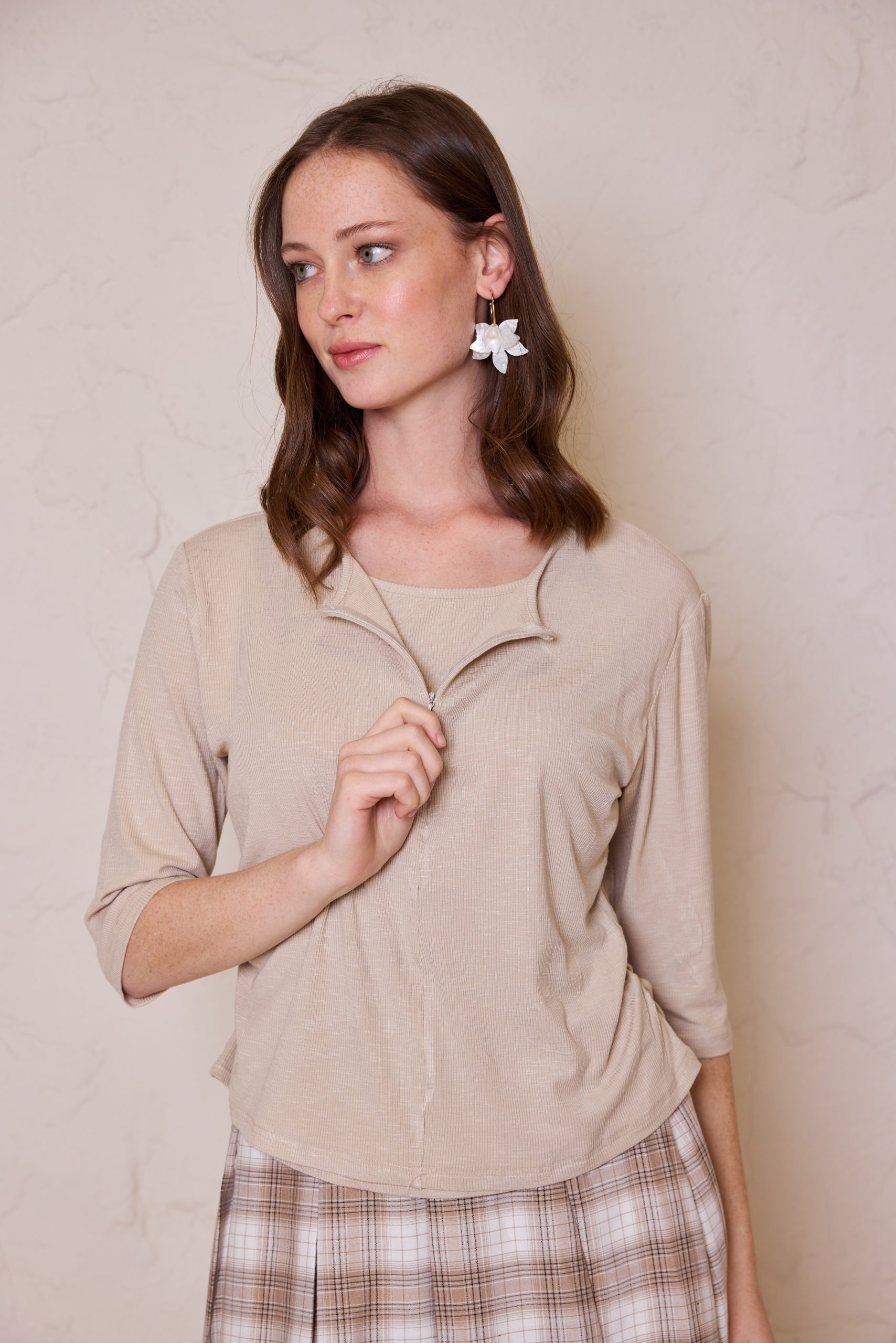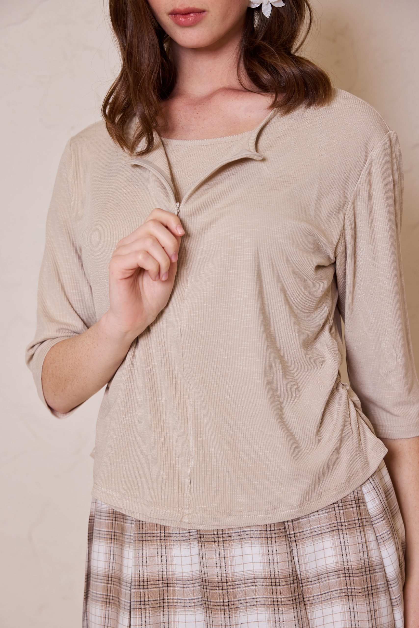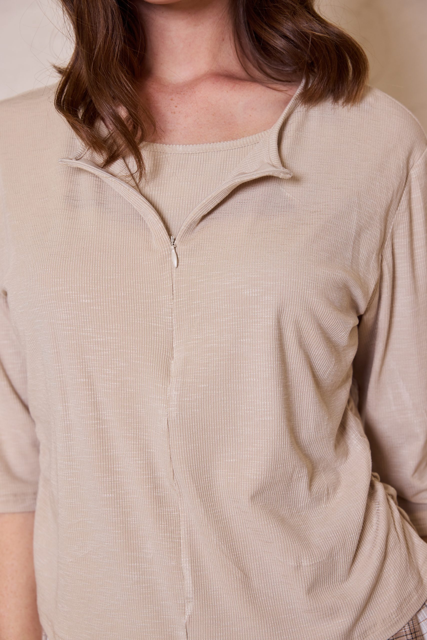 חולצת לייקרה מעוצבת מבד גמיש ואיכותי, המשלבת רוכסן אלגנטי בחזית למראה מודרני ונוחות לבישה מרבית.