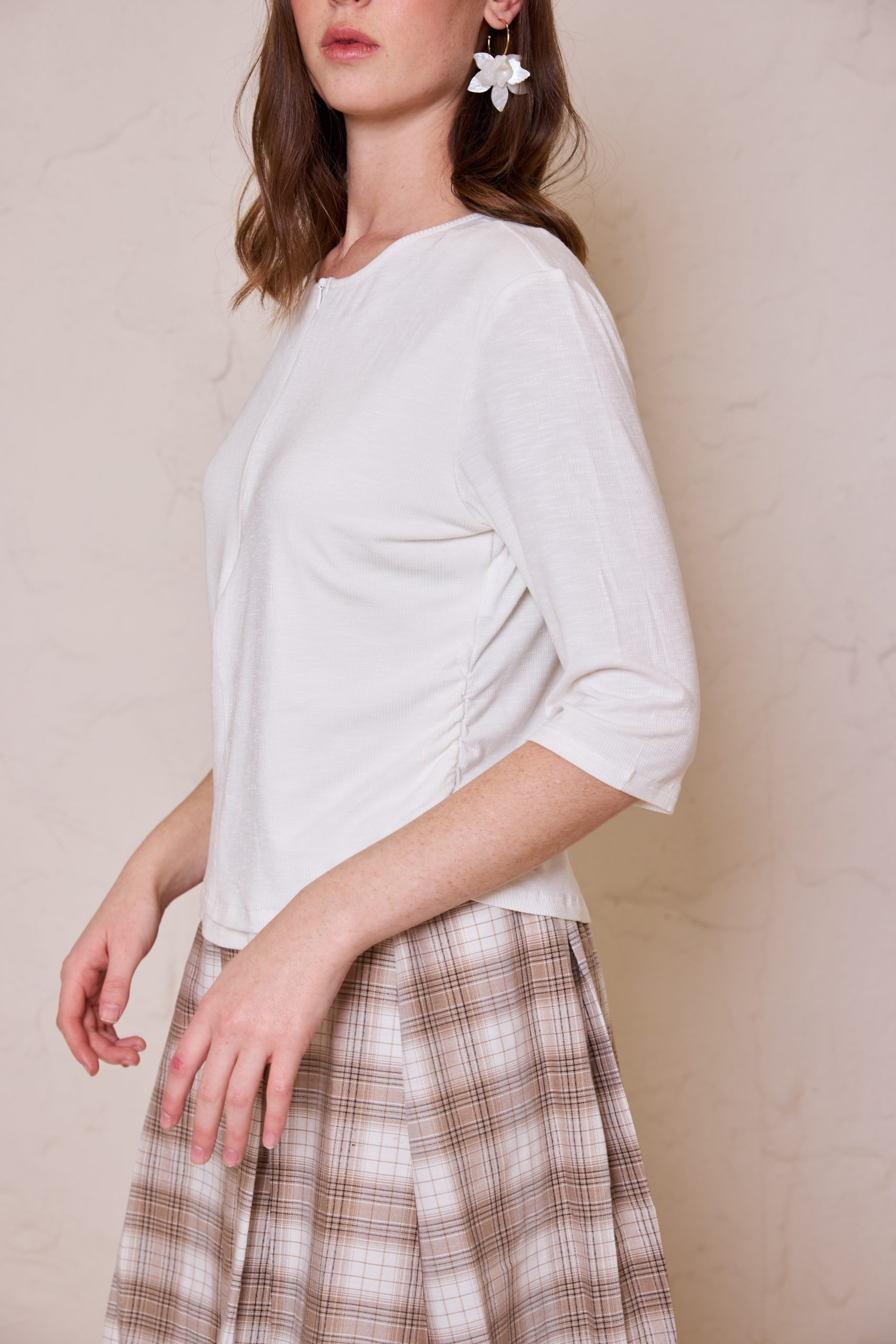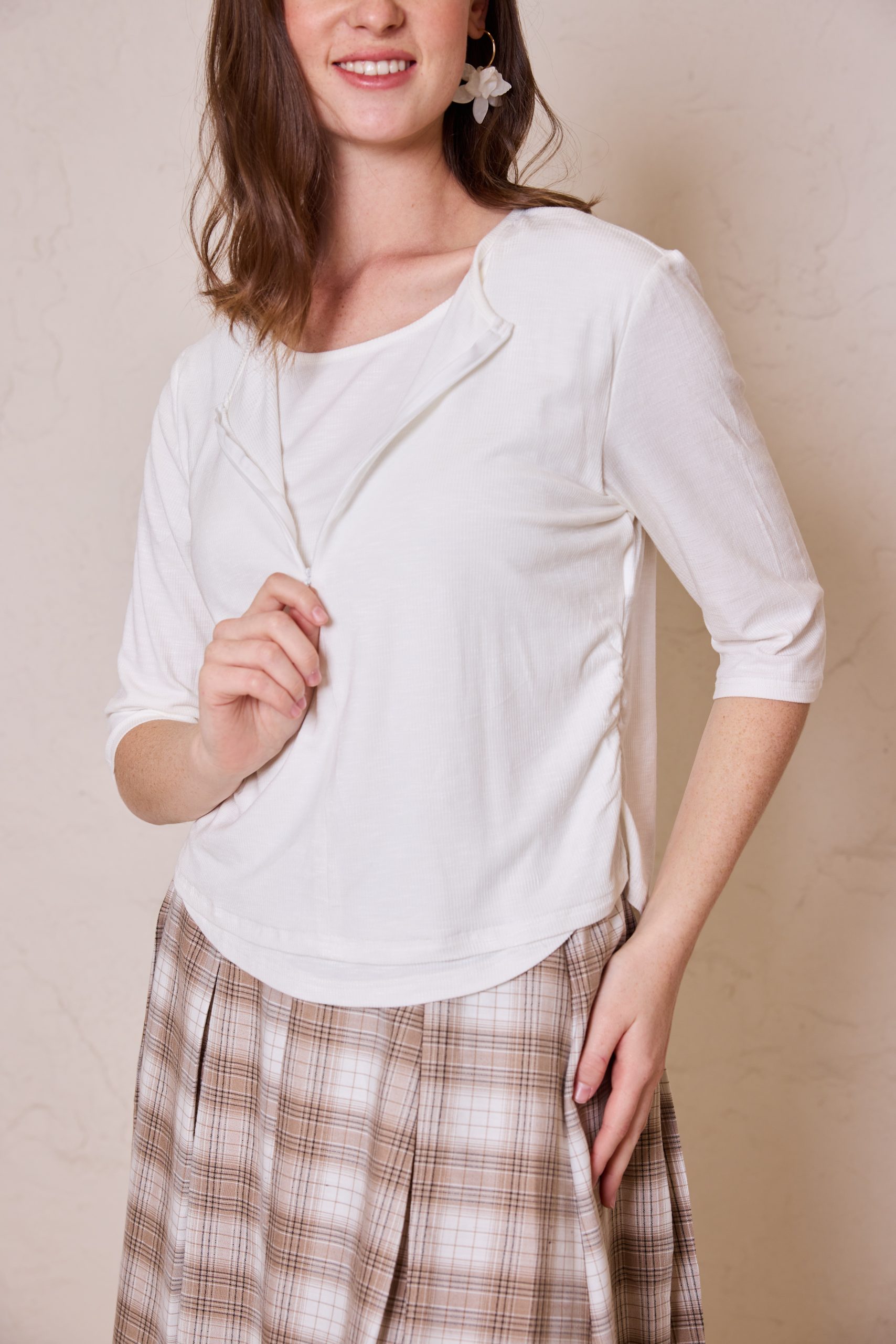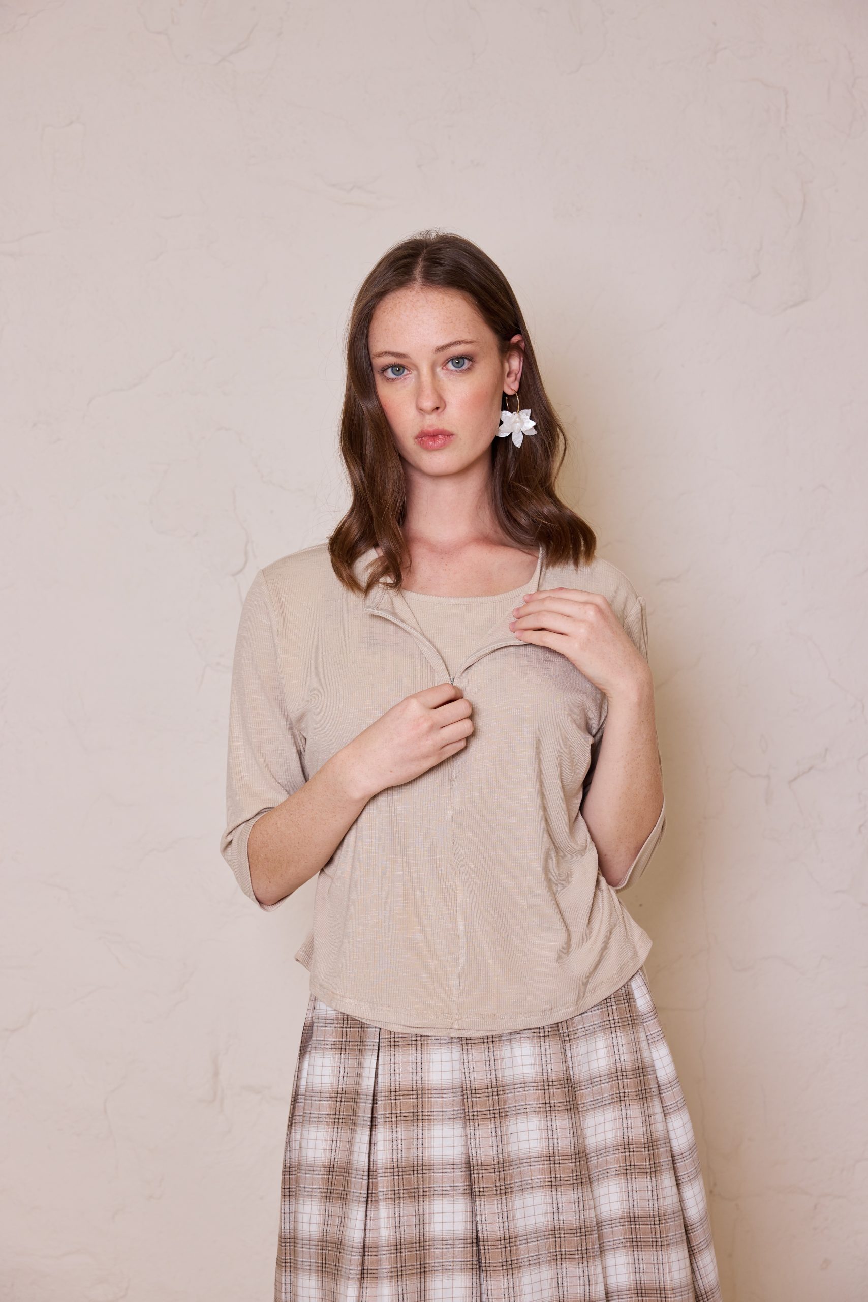 חולצת לייקרה מעוצבת מבד גמיש ואיכותי, המשלבת רוכסן אלגנטי בחזית למראה מודרני ונוחות לבישה מרבית.