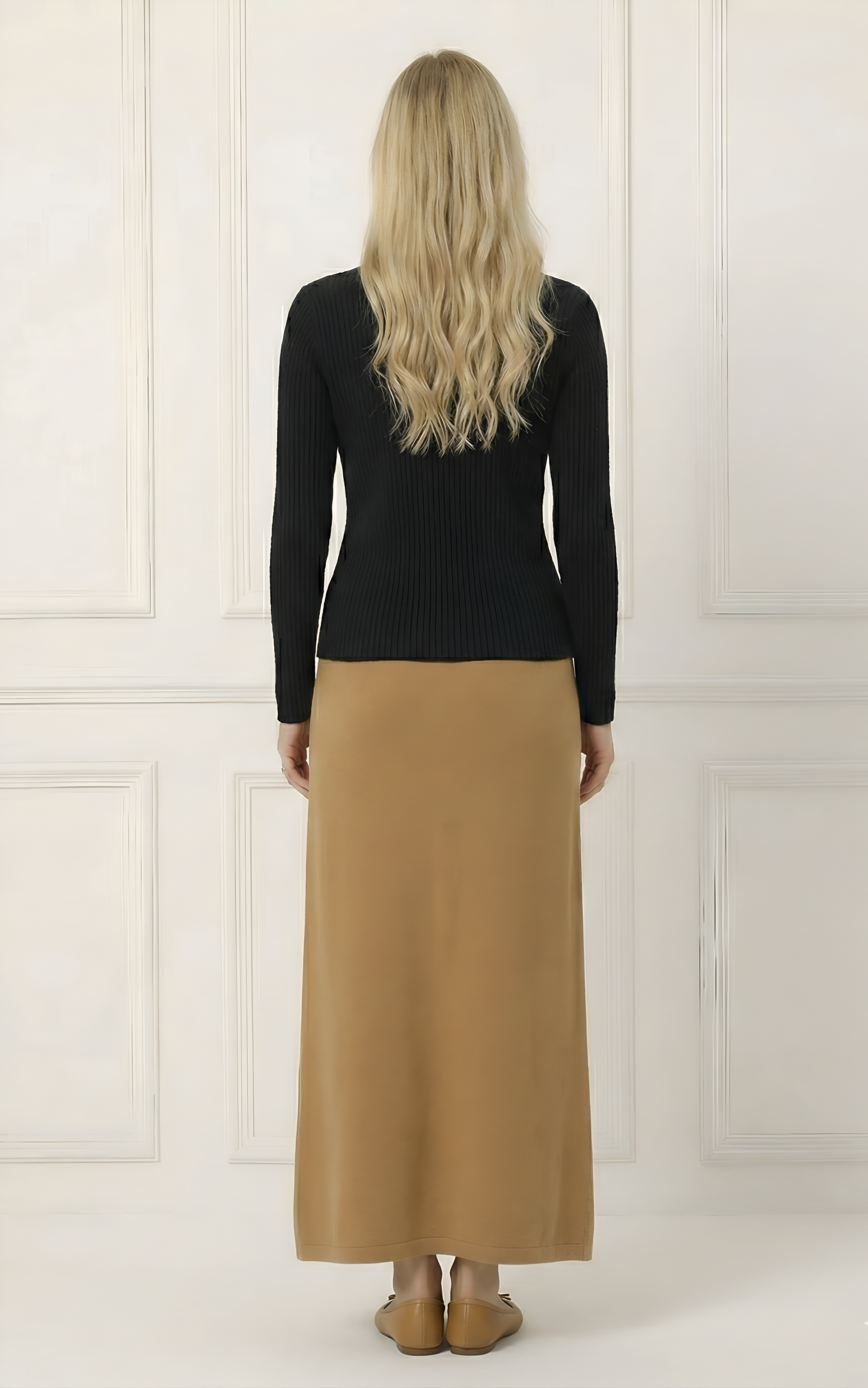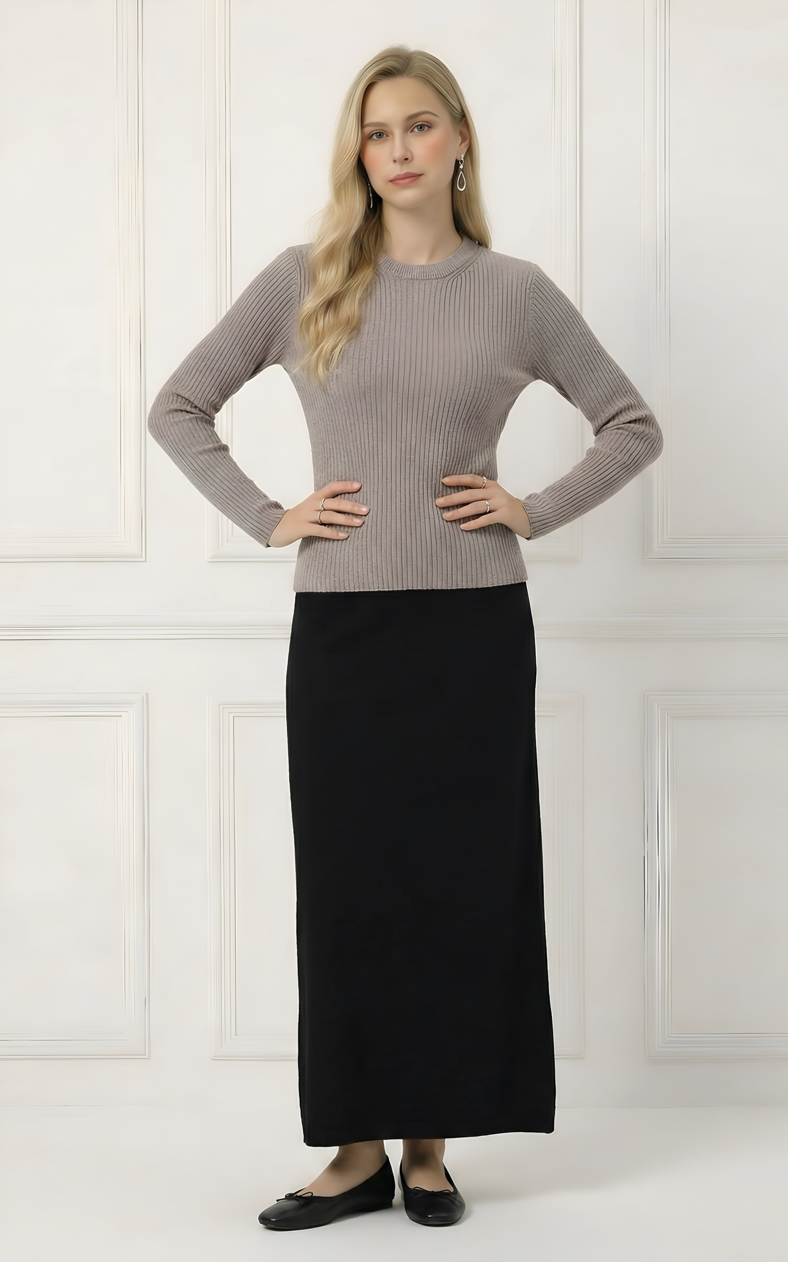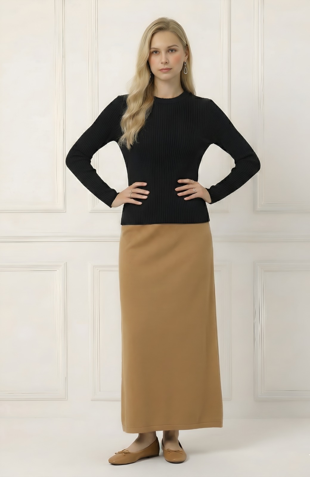 חולצת סריג עם צווארון עגול, רכה ונוחה, פריט בייסיק שמוסיף נגיעה אלגנטית לכל לוק יומיומי.