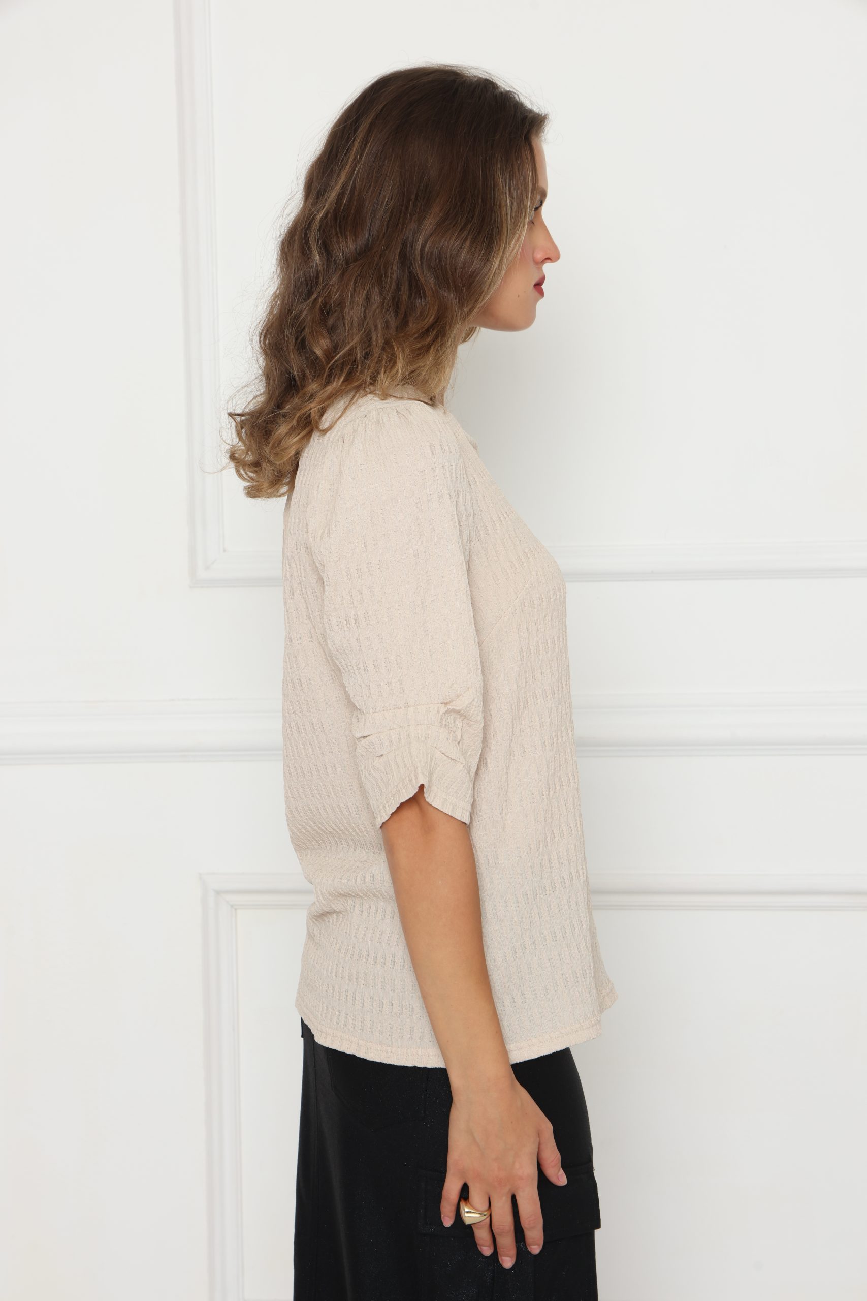 חולצת סריג המציעה שילוב אידיאלי בין נוחות ומראה אלגנטי. המפתח העגול שמתפתח למפתח V מוסיף עניין ואלגנטיות למראה הכללי, ומאפשר התאמה לשימוש יומיומי או לערב.