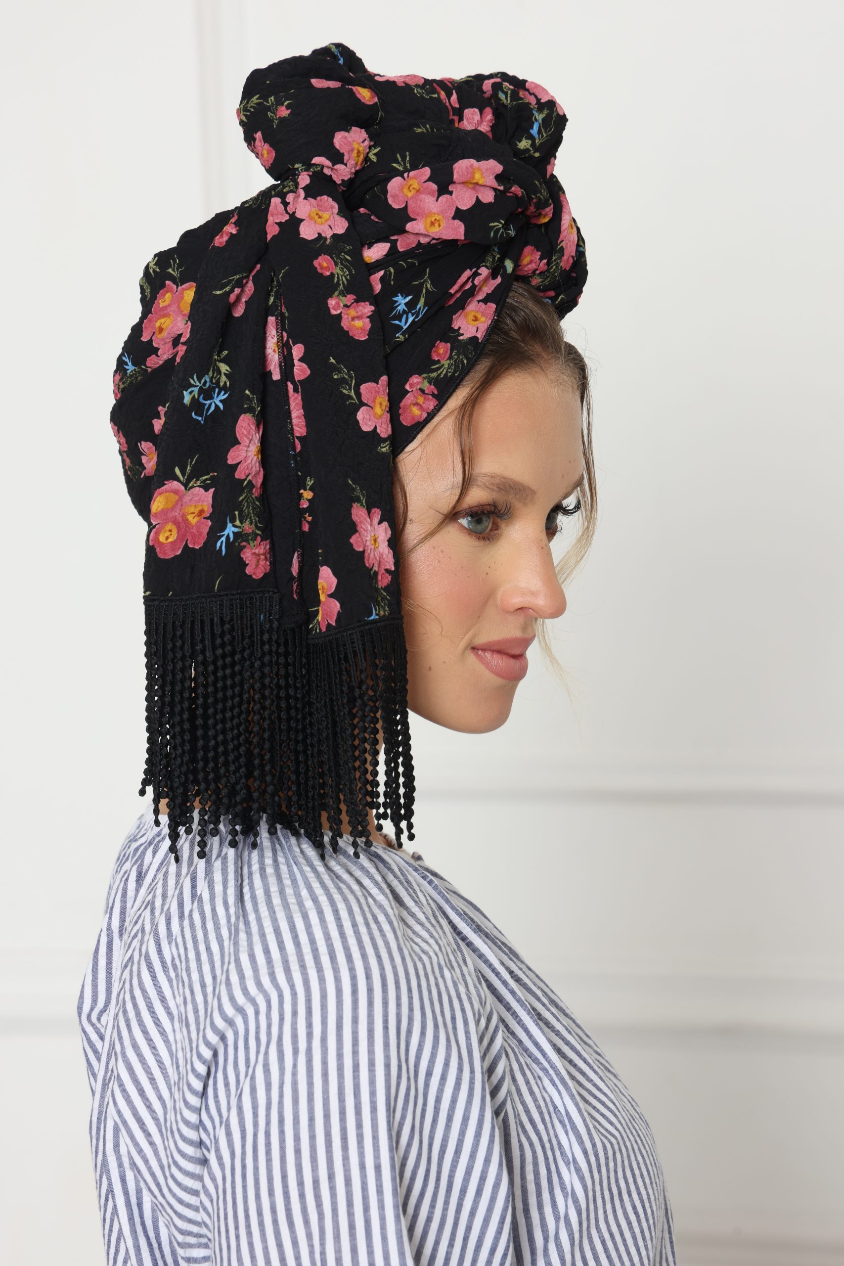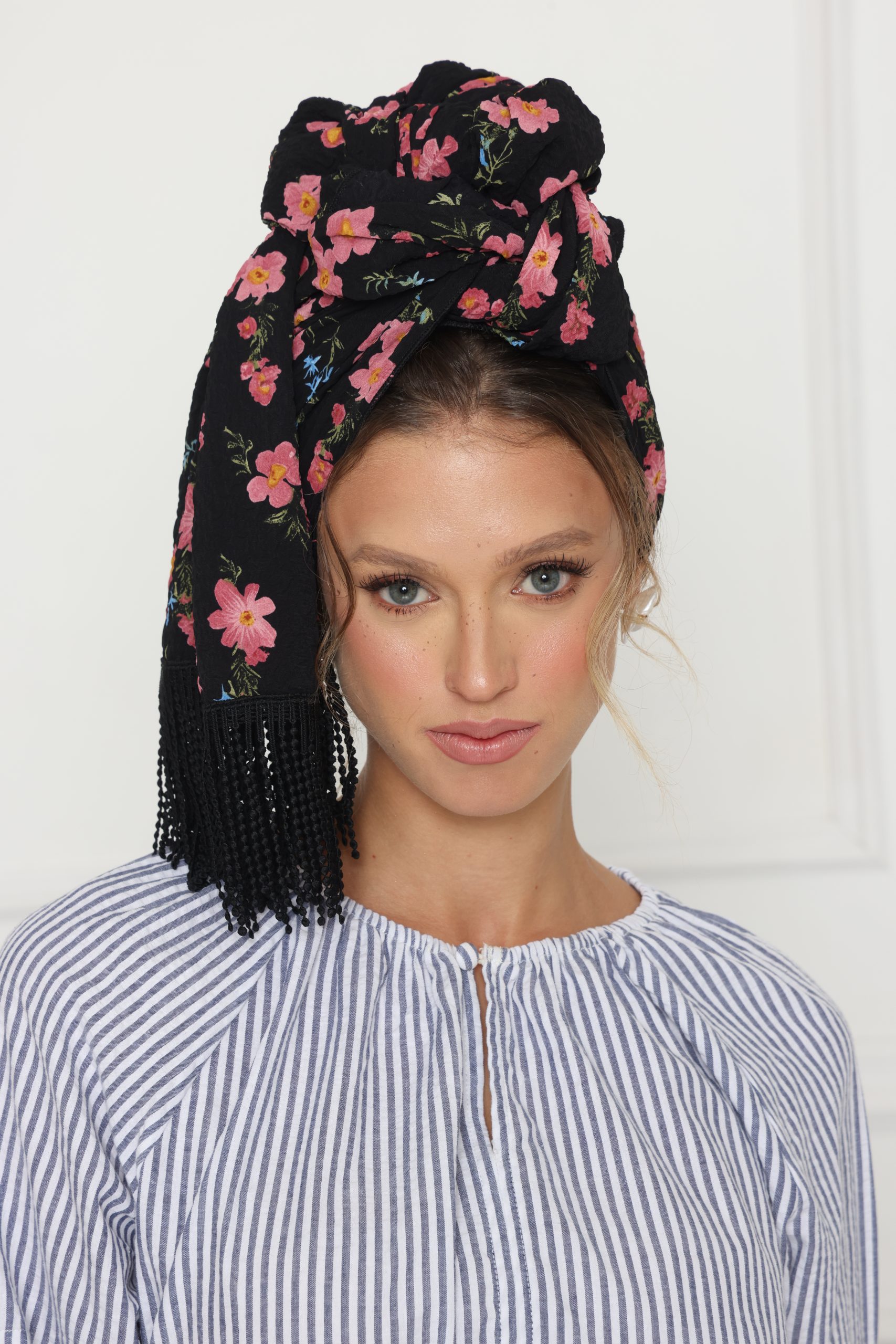 לונג אלגנטי בגוון שחור עם דוגמת פרחים ורודים עדינים בשילוב נגיעות צבע נוספות, היוצרים מראה רומנטי ומיוחד. הבד האיכותי והנעים למגע מאפשר קשירה קלה ונוחה במגוון סגנונות – החל ממראה קלאסי ועד טורבן חגיגי. הקצוות מעוטרים בפרנזים שחורים דקים המוסיפים טאצ’ אופנתי ויוקרתי. מושלם לאירועים, לחגים או לשדרוג המראה היומיומי שלך.