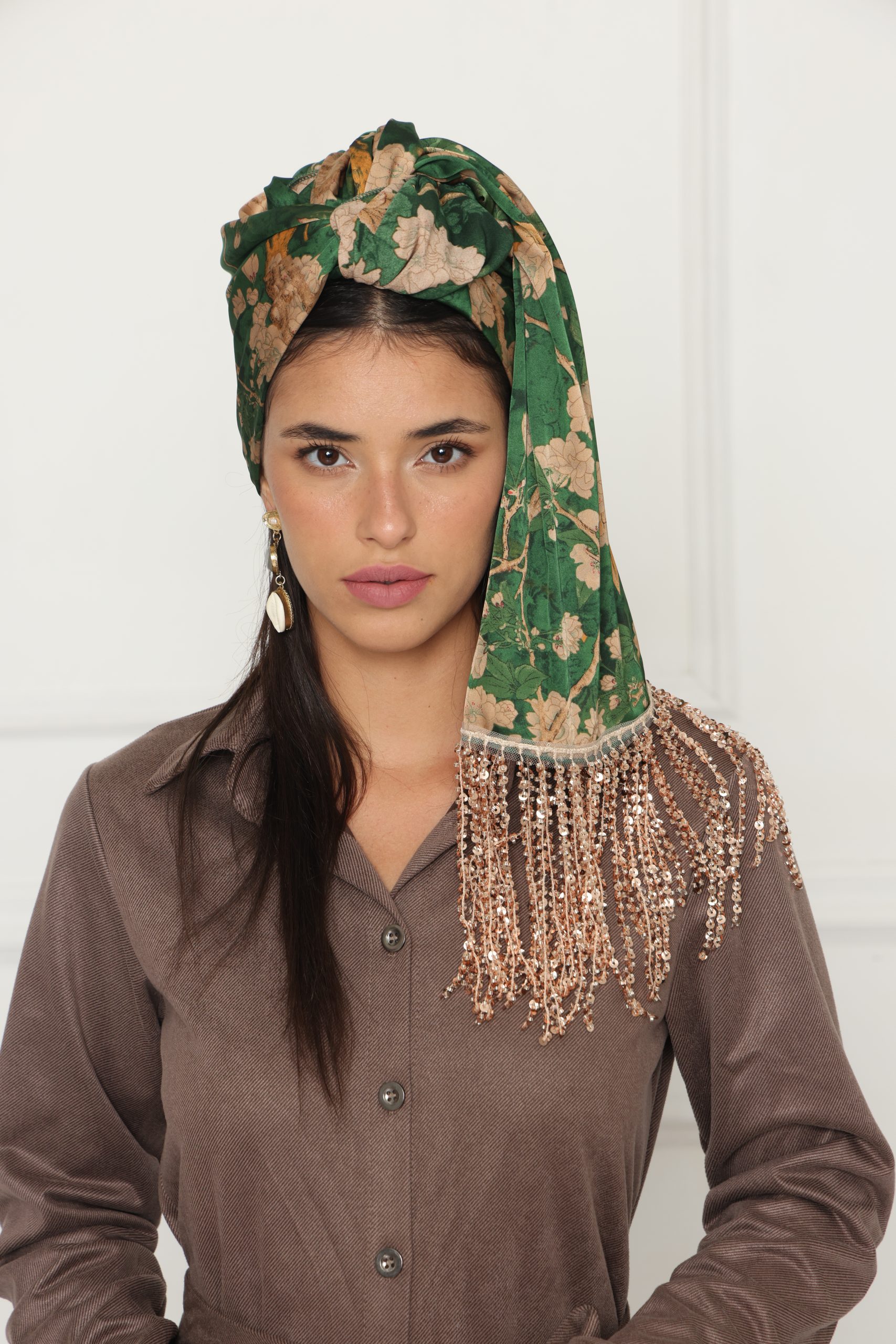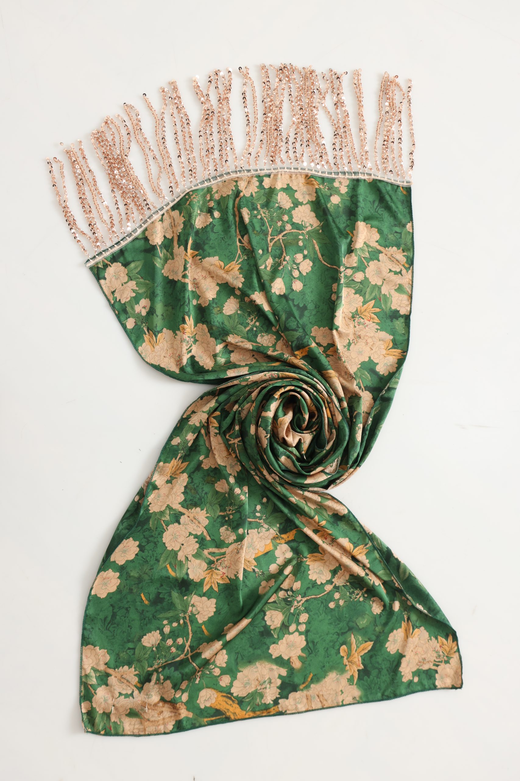 לונג סאטן צבע ירוק, מושלם כצעיף קליל, כיסוי אופנתי או כתוספת ייחודית ללוק יומיומי וחגיגי.