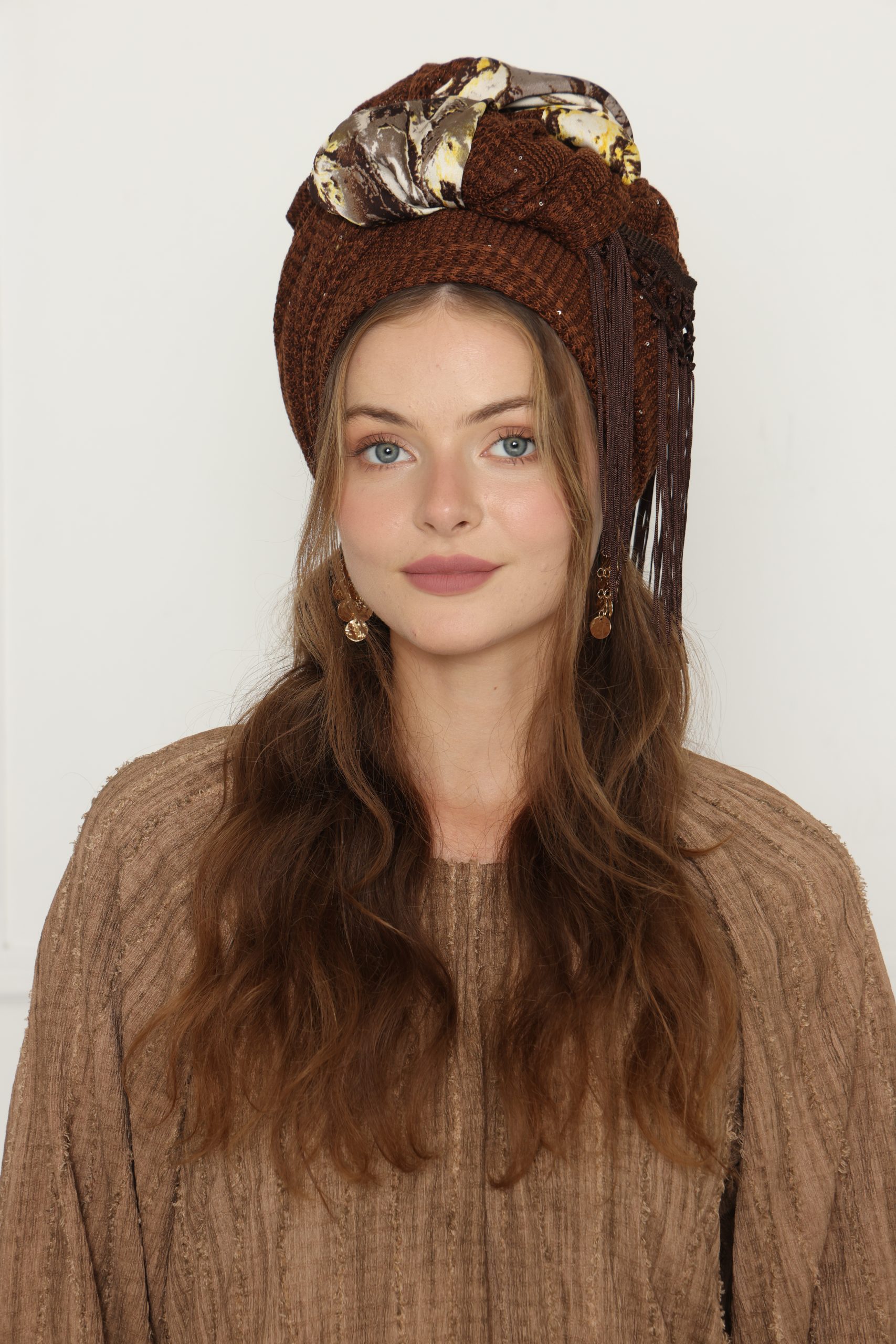 לונג סריג משולב שיפון חום/צהוב, מושלם כצעיף קליל, כיסוי אופנתי או כתוספת ייחודית ללוק יומיומי וחגיגי.