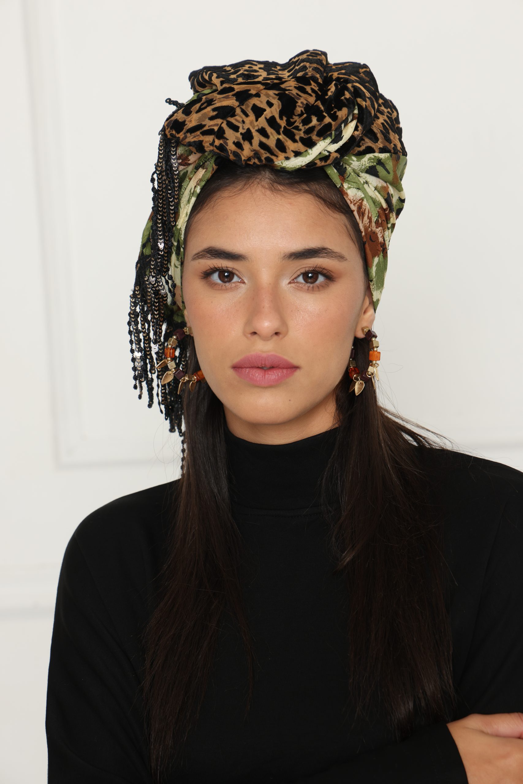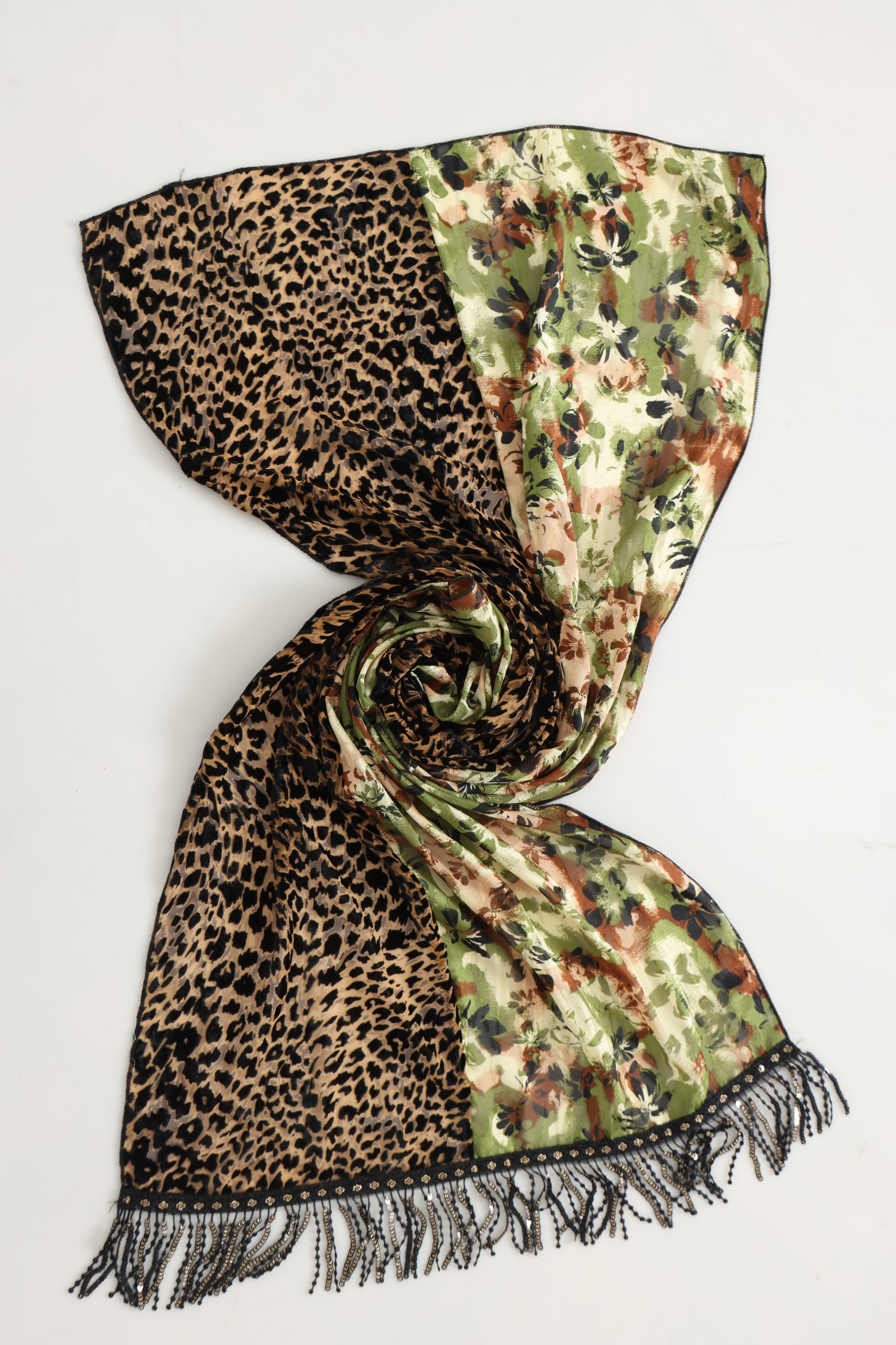 לונג קטיפה צרובה מנומר חום/ירוק, מושלם כצעיף קליל, כיסוי אופנתי או כתוספת ייחודית ללוק יומיומי וחגיגי.