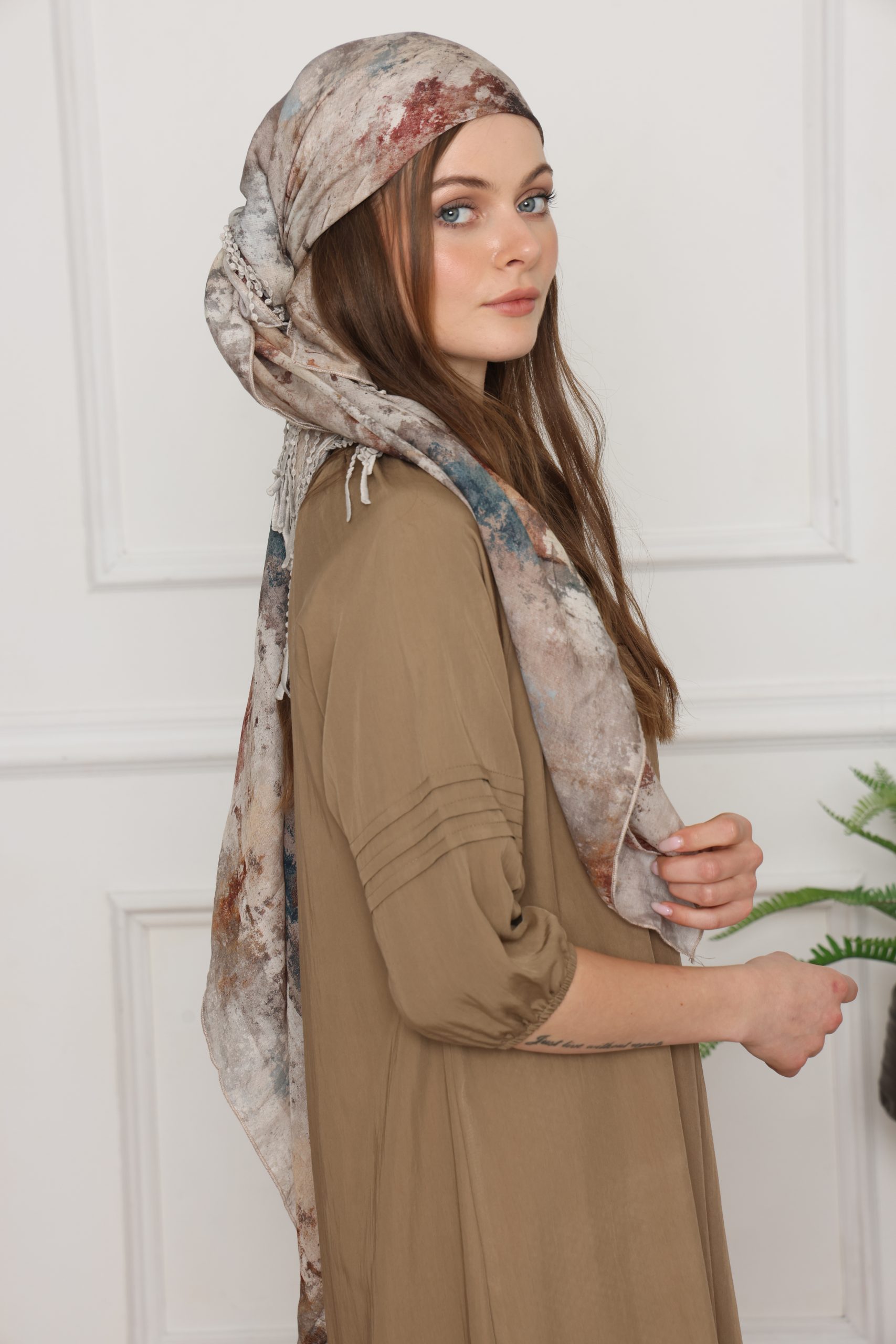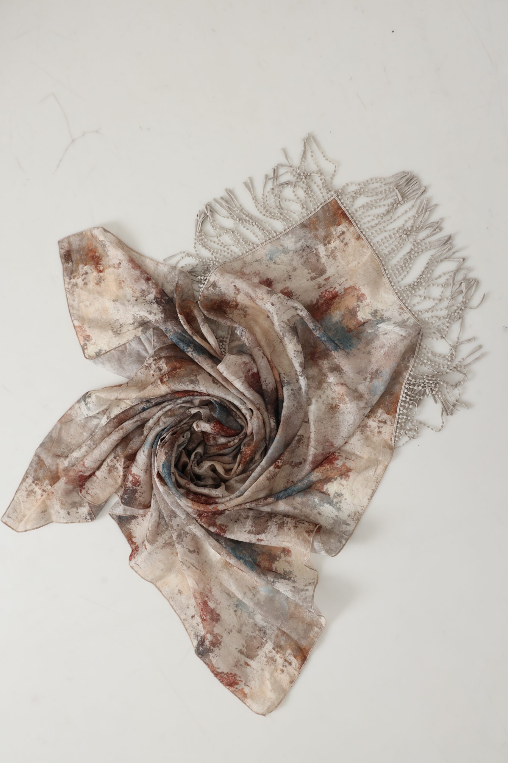 מרובעת מנוצנצת בייג בעיצוב על זמני ובטקסטורה נעימה, מושלמת כצעיף קליל, כיסוי אופנתי או כתוספת ייחודית ללוק יומיומי וחגיגי.