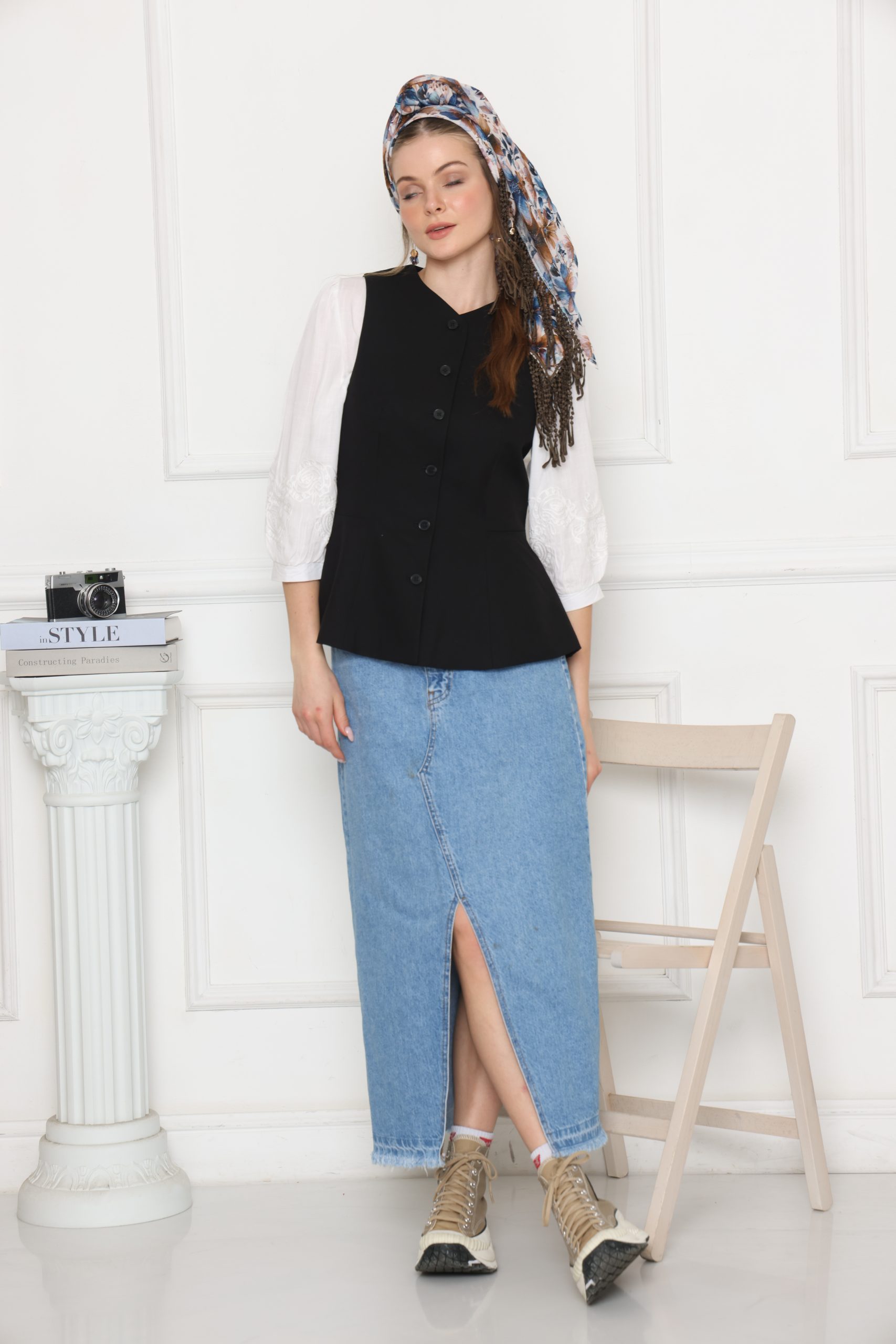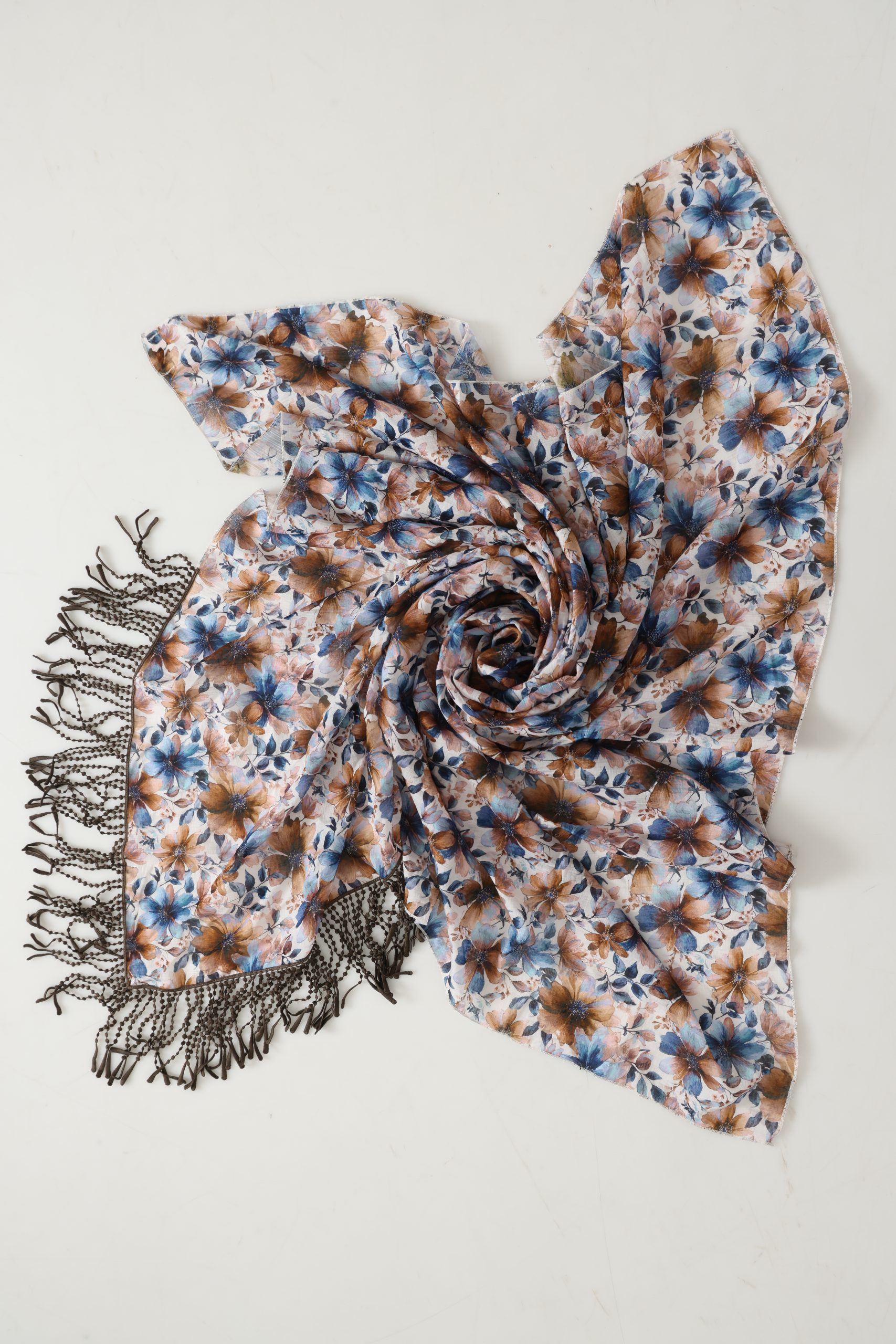 מרובעת פרחונית חום כחול בעיצוב על זמני ובטקסטורה נעימה, מושלמת כצעיף קליל, כיסוי אופנתי או כתוספת ייחודית ללוק יומיומי וחגיגי.