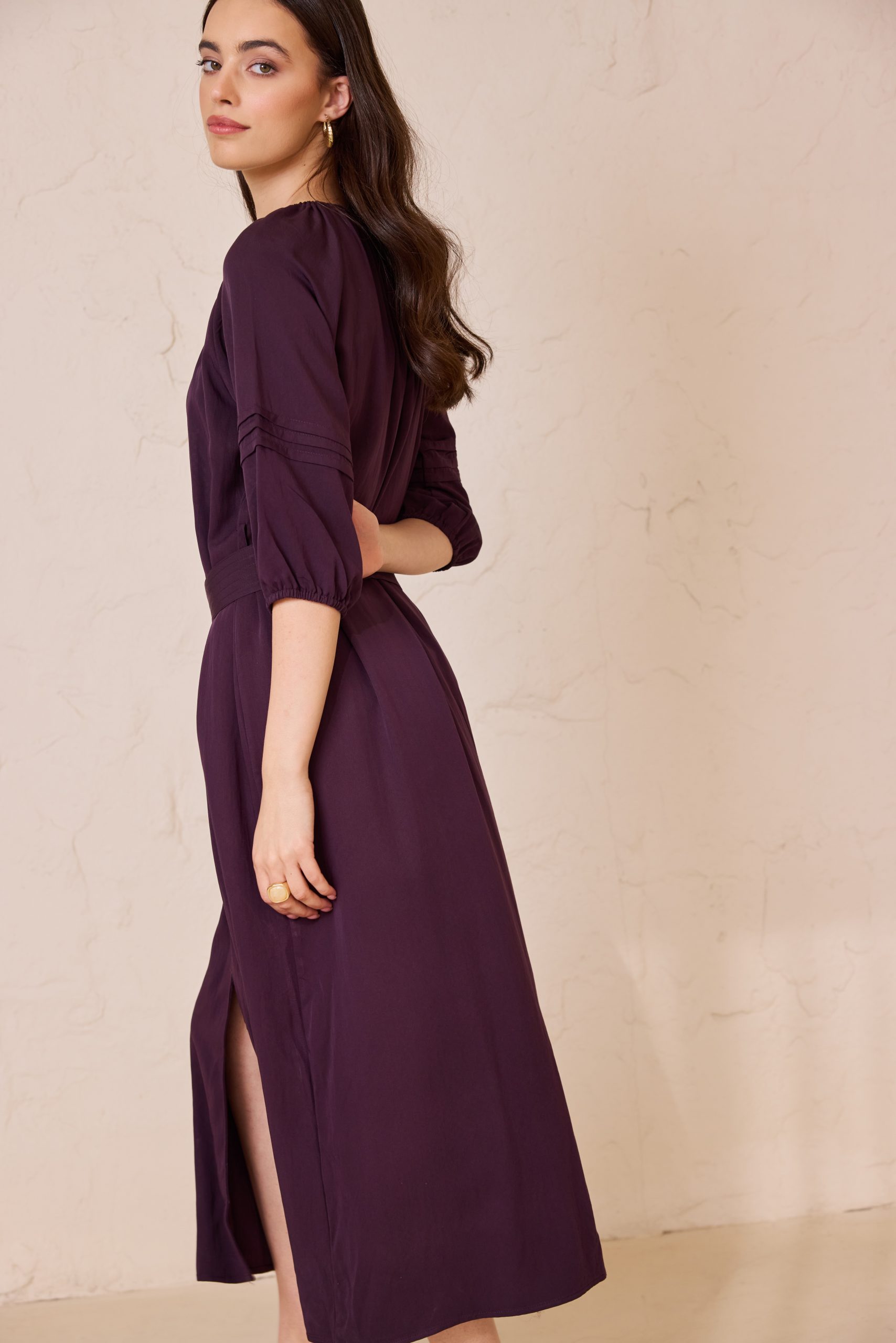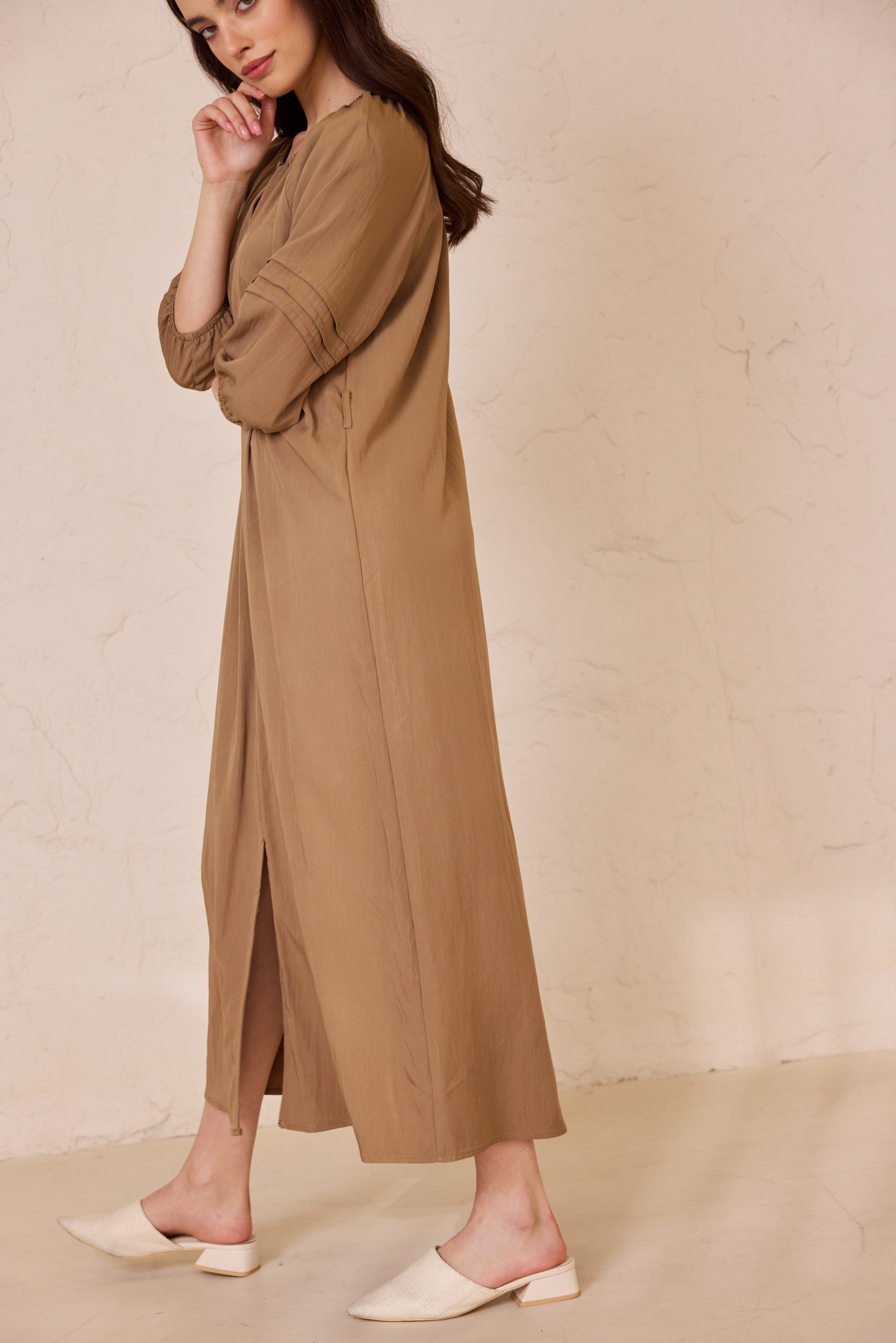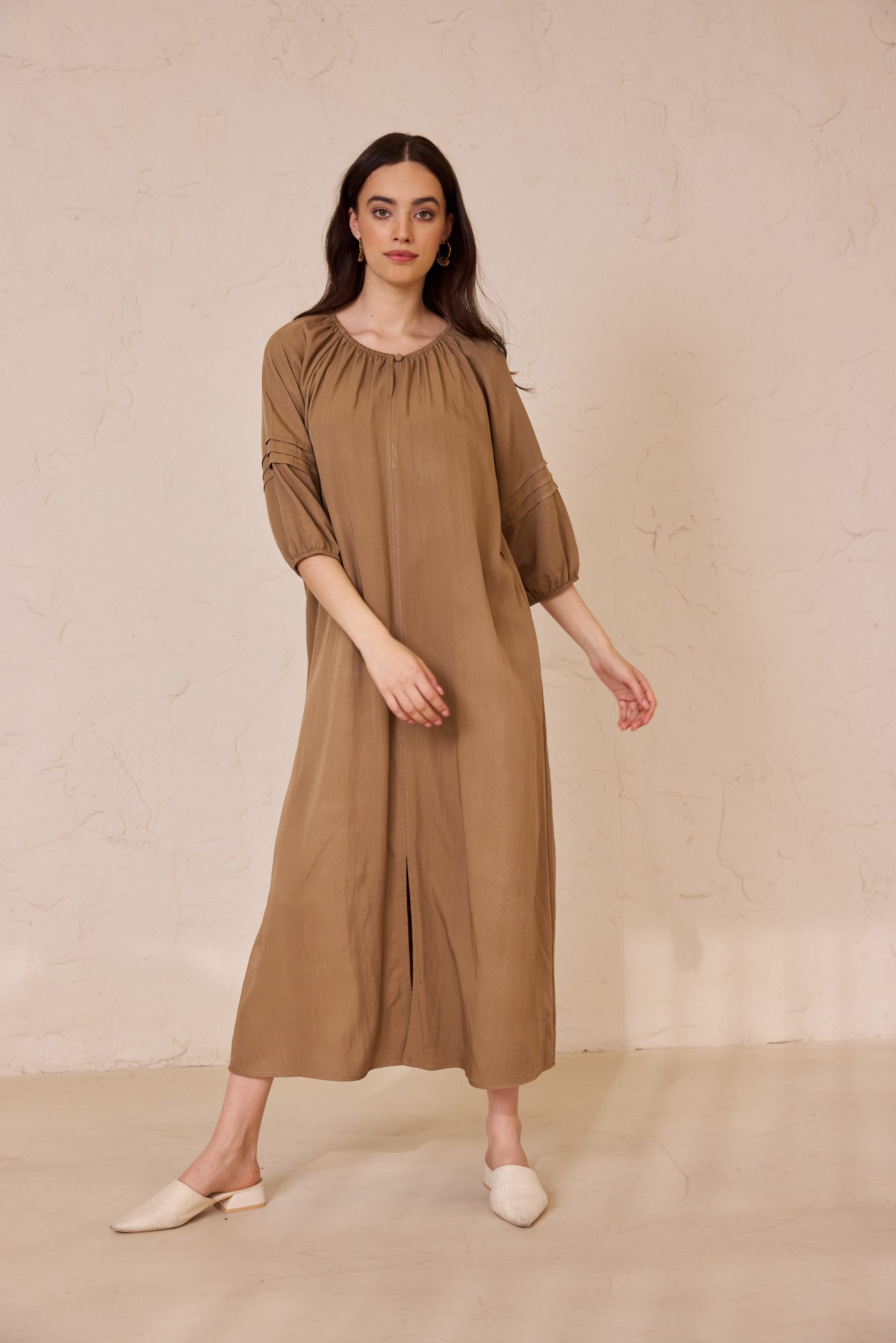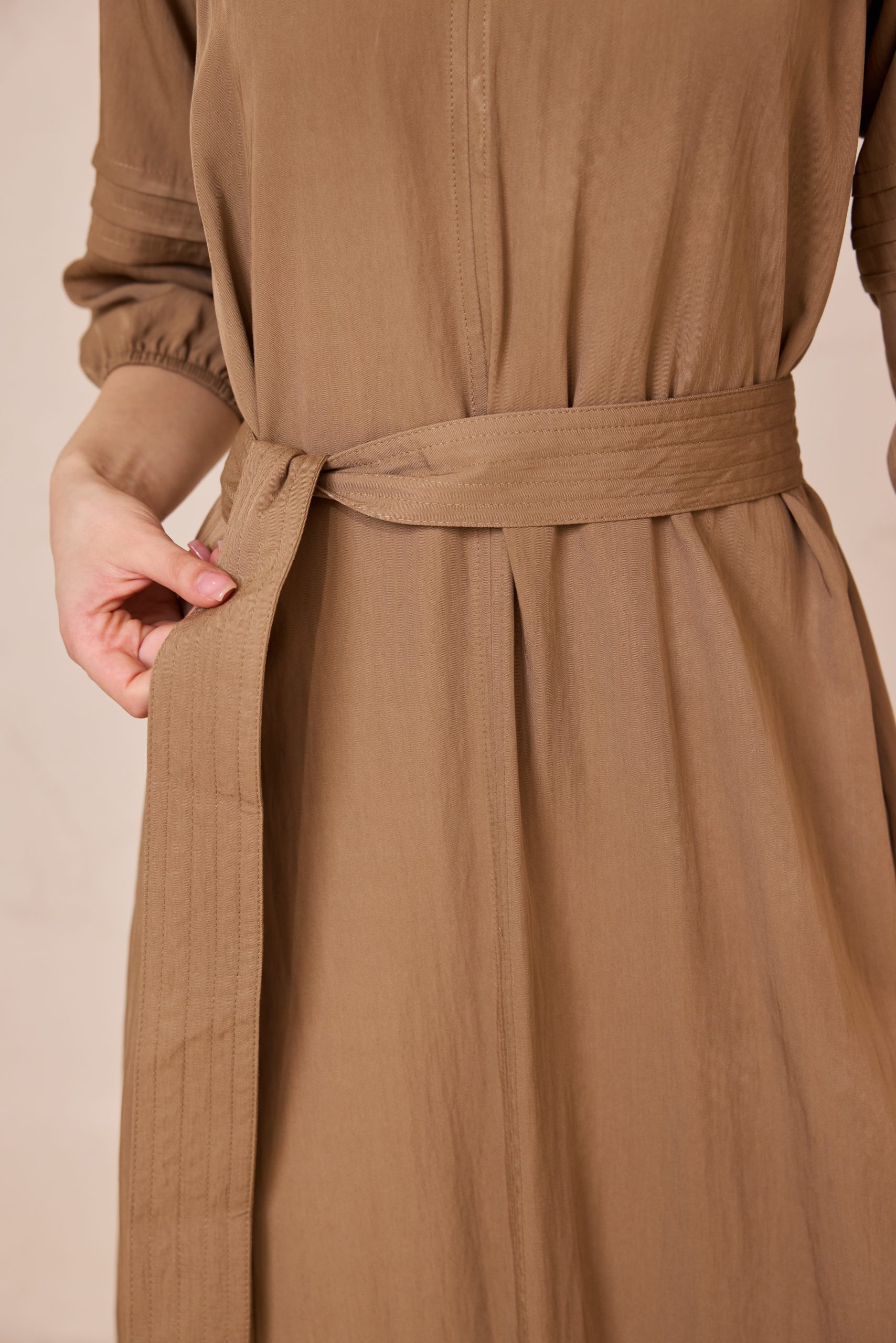 שמלת גלביה מבד גברדין עם חגורה המעניקה מראה אצילי.
