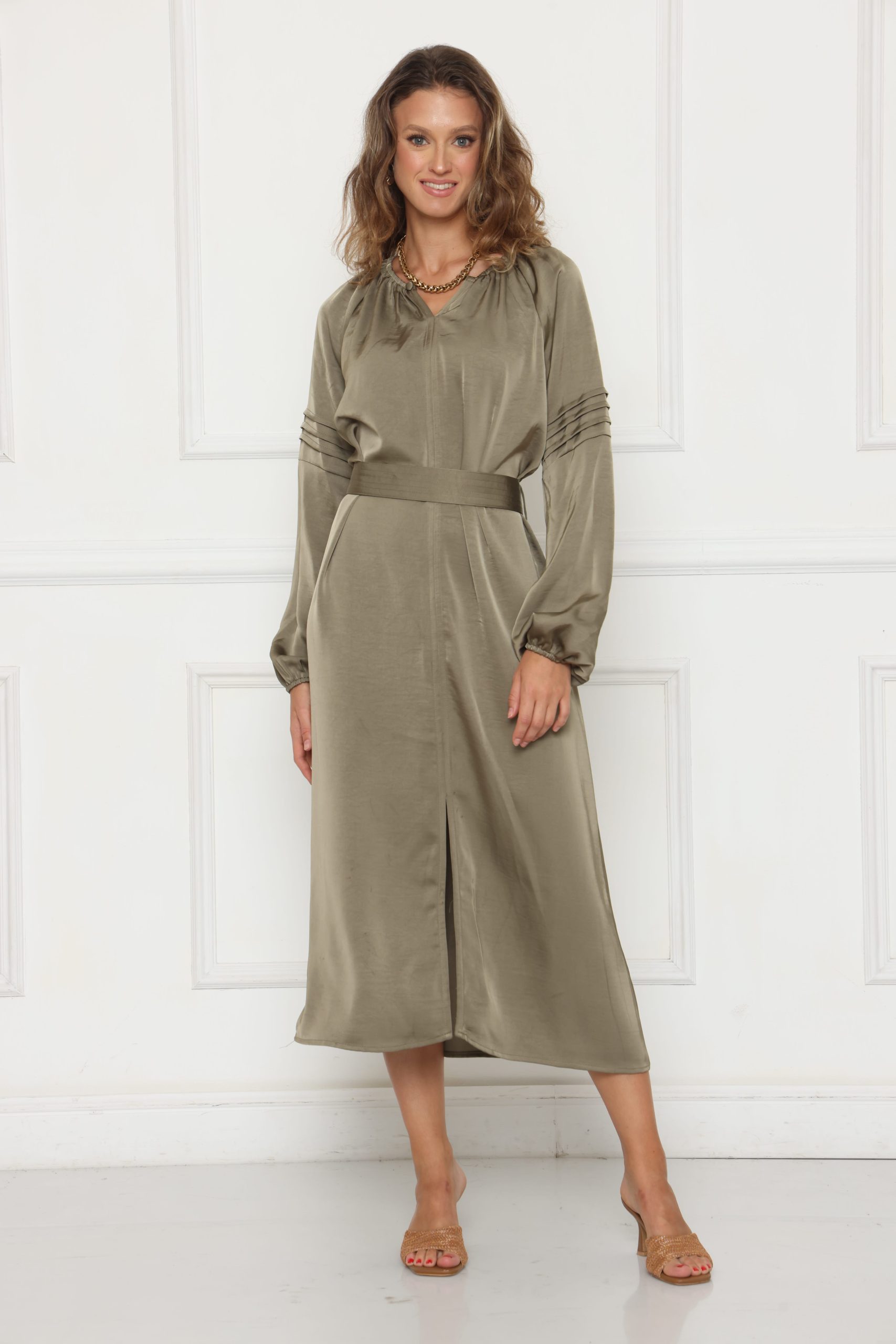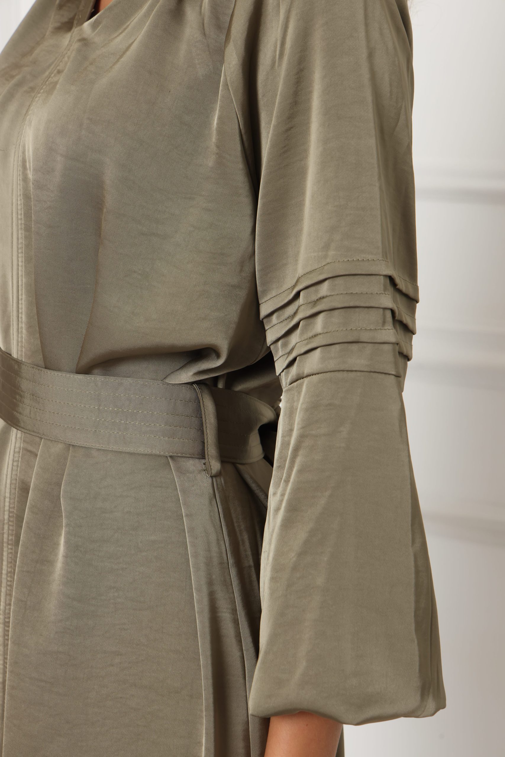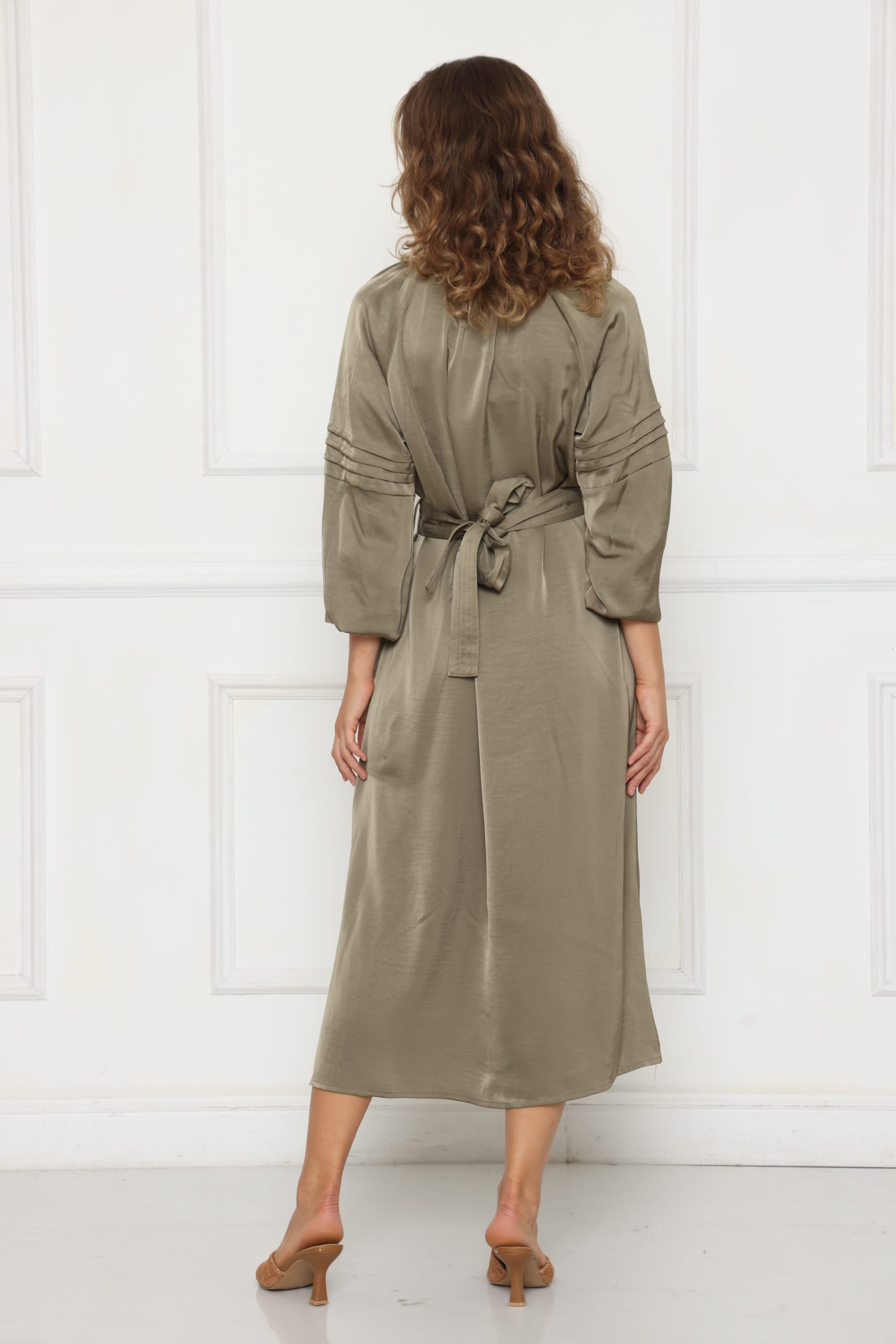 שמלת גלביה אלגנטית בגזרת מקסי עשויה מבד סאטן חלק עם ברק יוקרתי המעניק מראה נשי ומעודן. השרוולים הארוכים עם פרטים עדינים והחגורה במותן יוצרים שילוב מושלם בין נוחות לסגנון. מתאימה לאירועים מיוחדים, חגיגות או מראה ערב קלאסי.