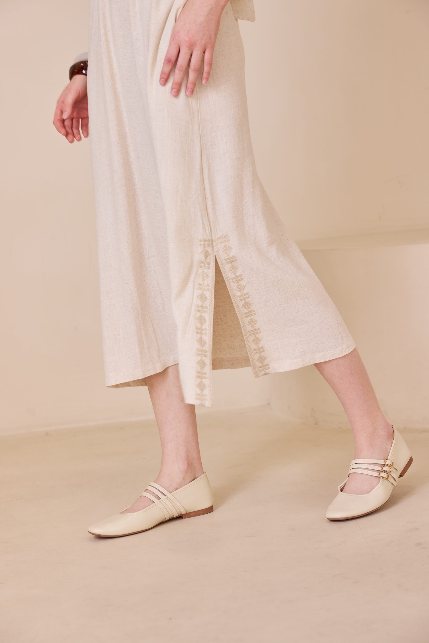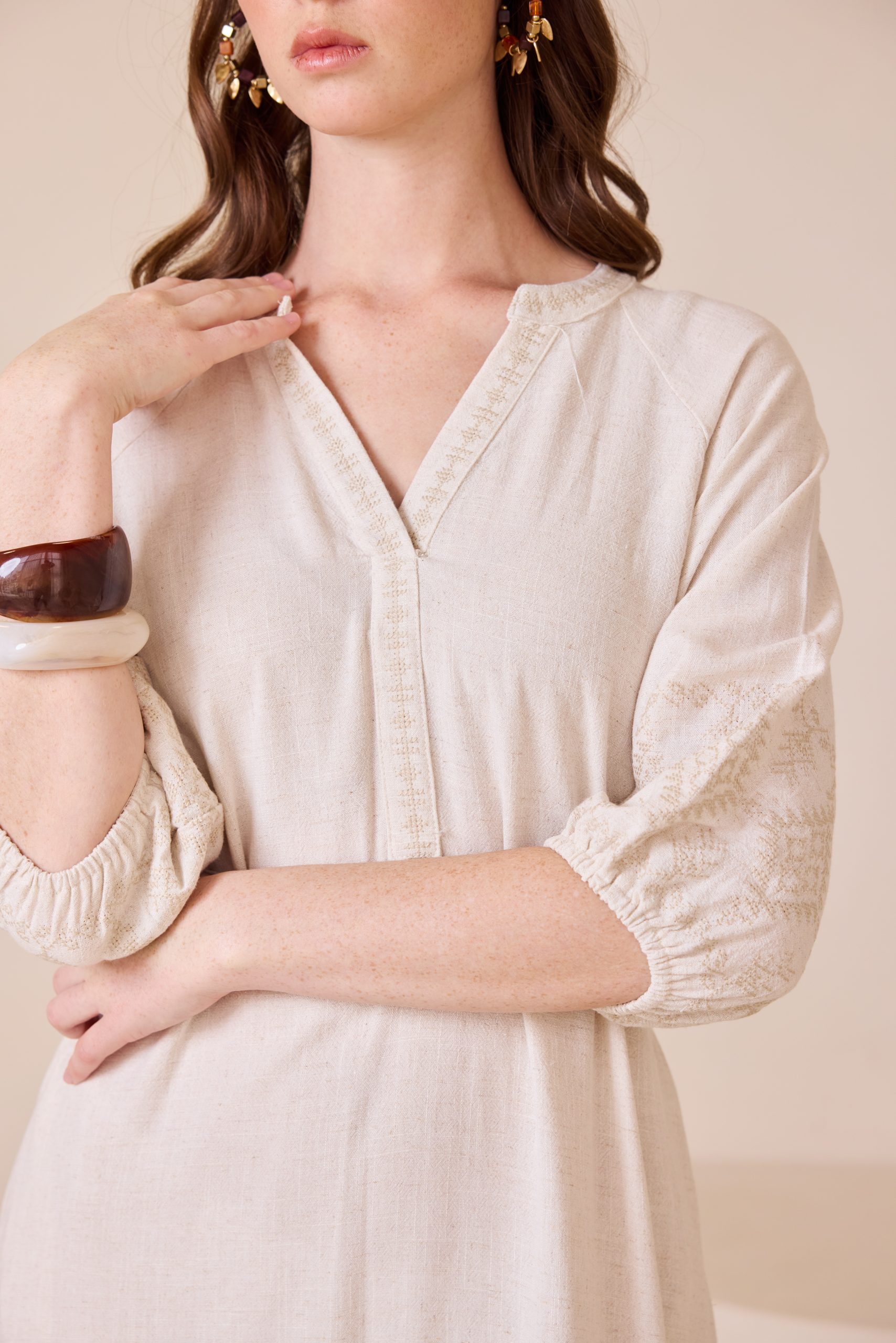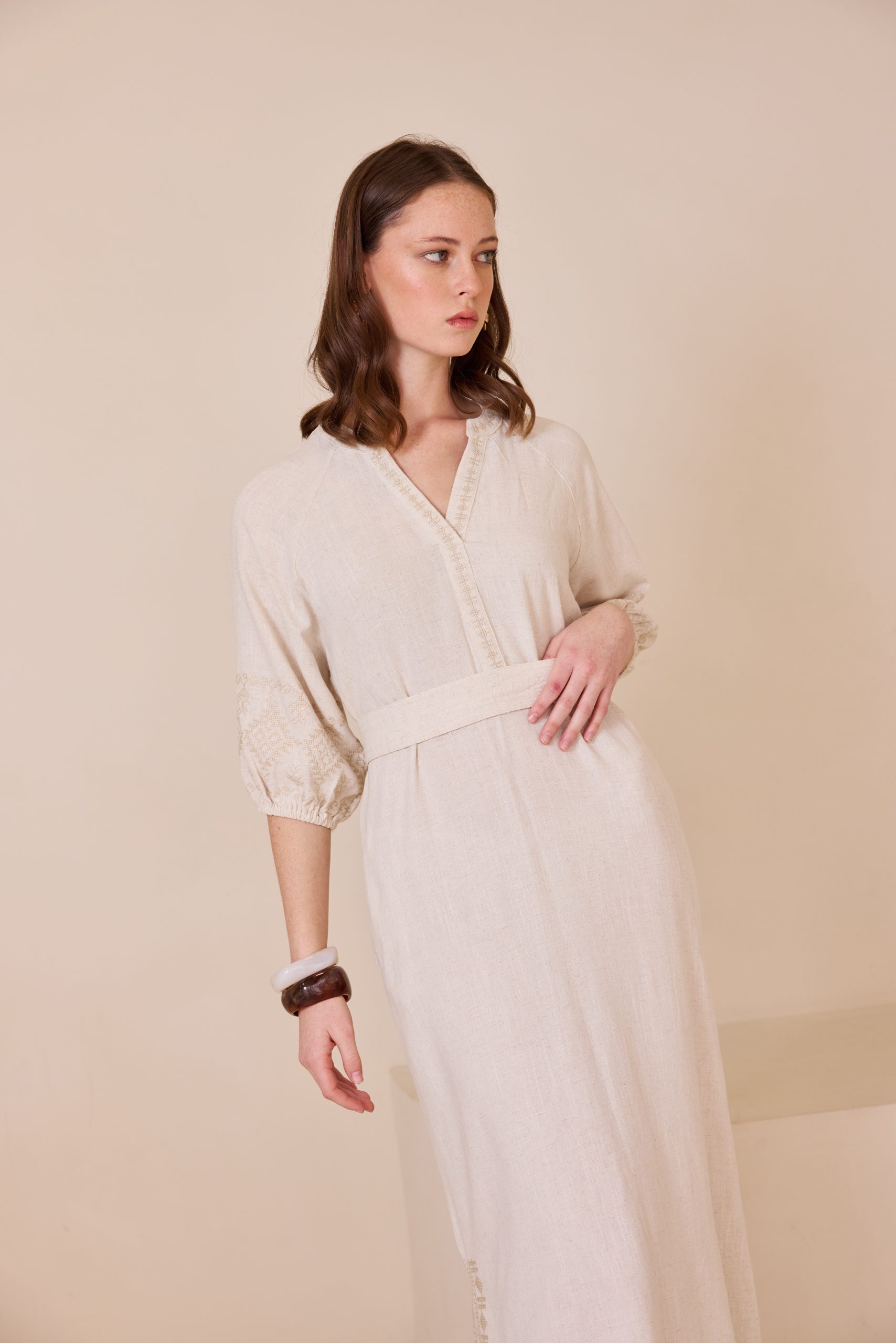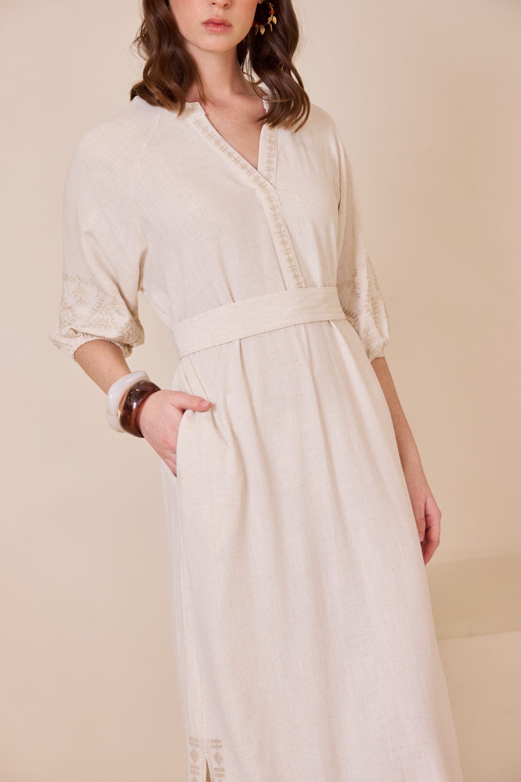 שמלת גלביה V רקומה , המשלבת גזרה נשפכת ואצילית עם בד דמוי פשתן קליל ונעים למגע.
