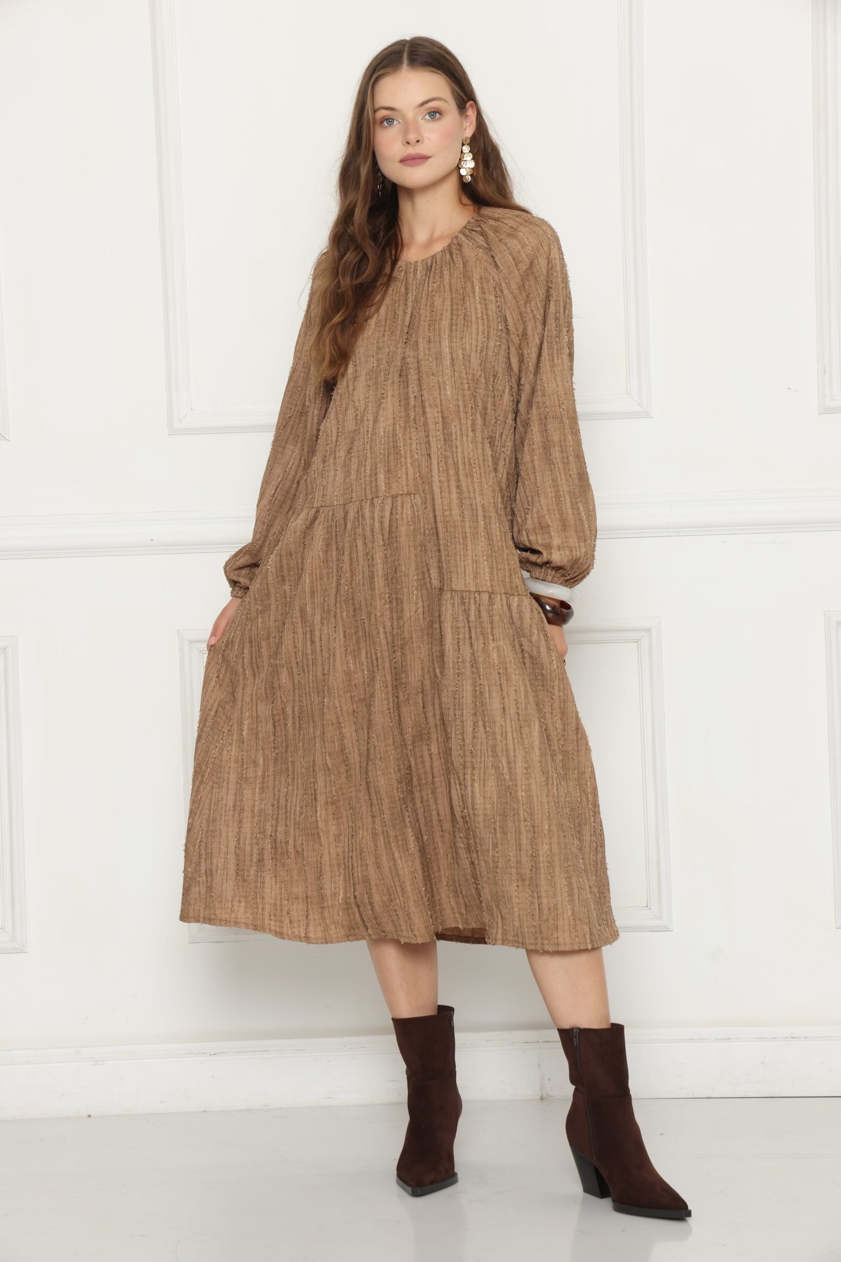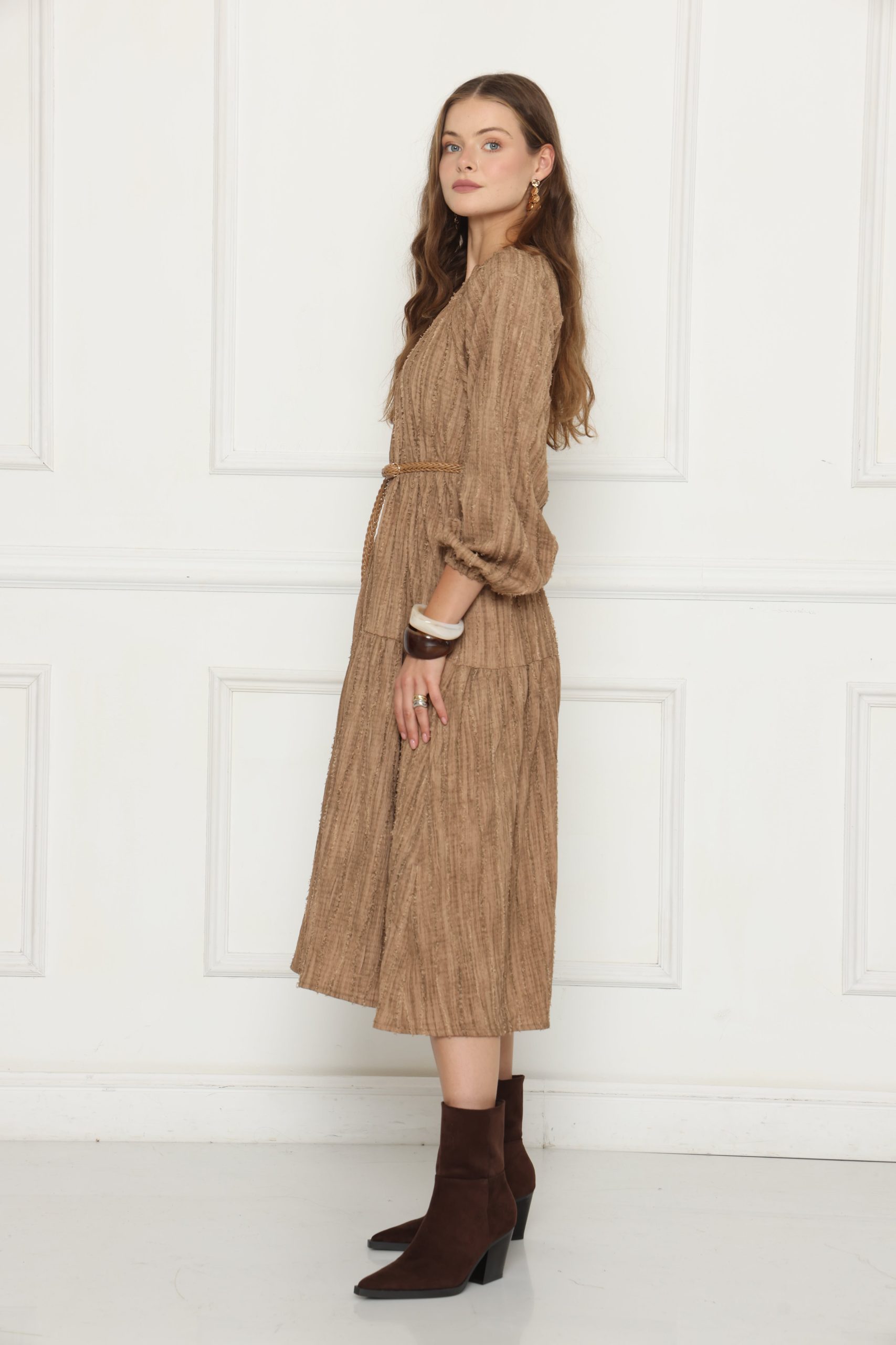 שמלת לוז בגזרה אסימטרית ייחודית, עשויה בד קליל ונעים, מעניקה מראה מודרני ומחמיא עם טאץ’ אופנתי ונשי.