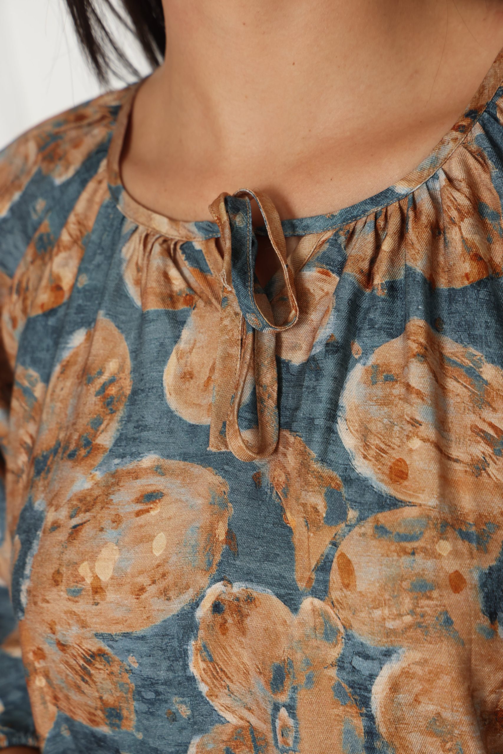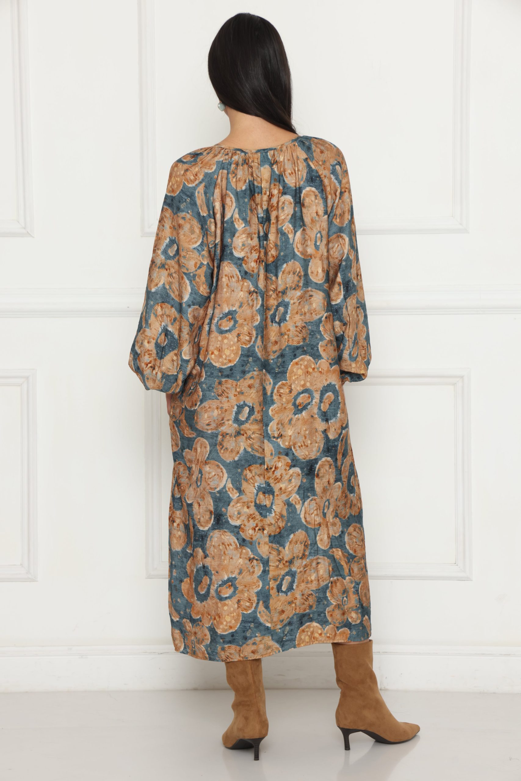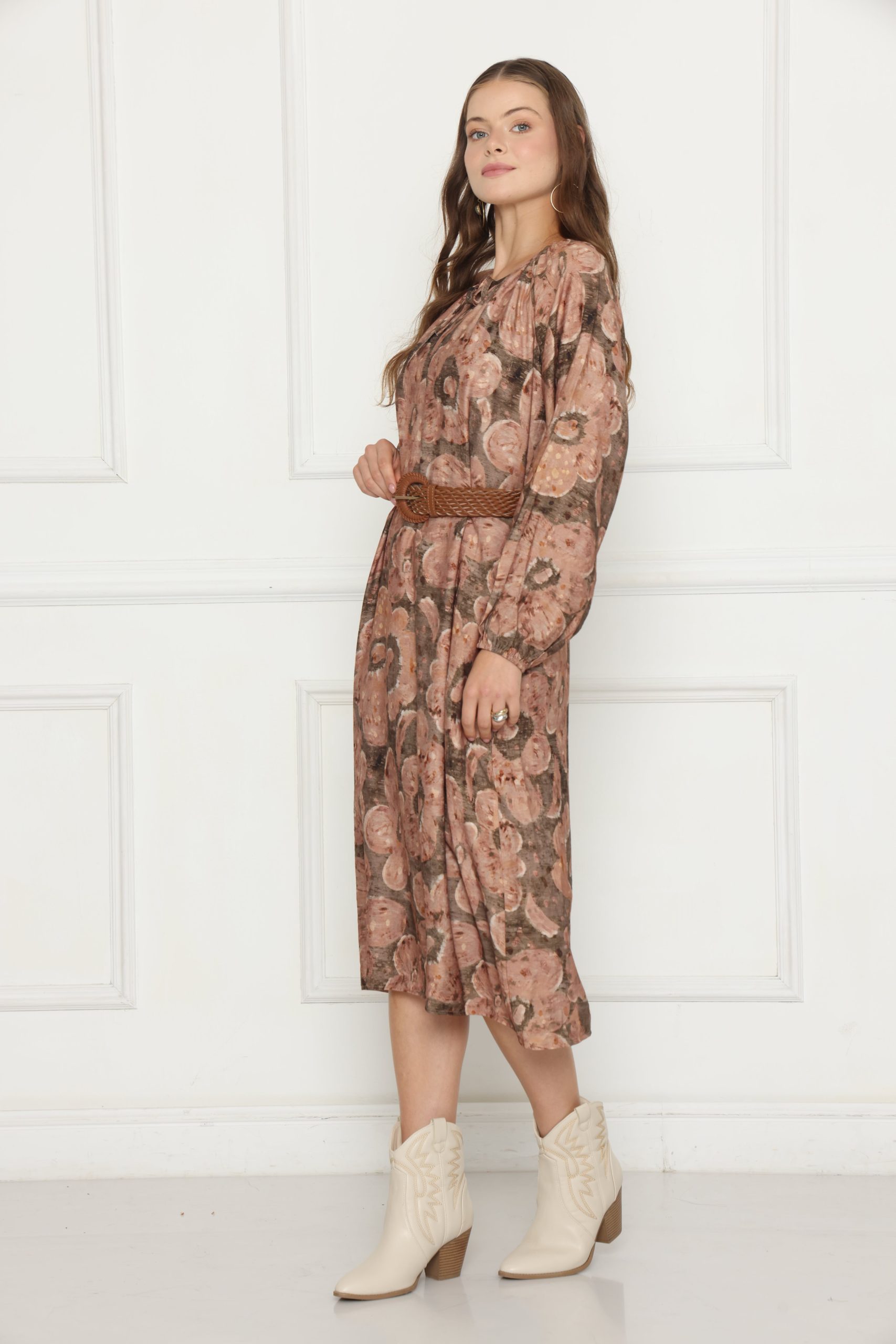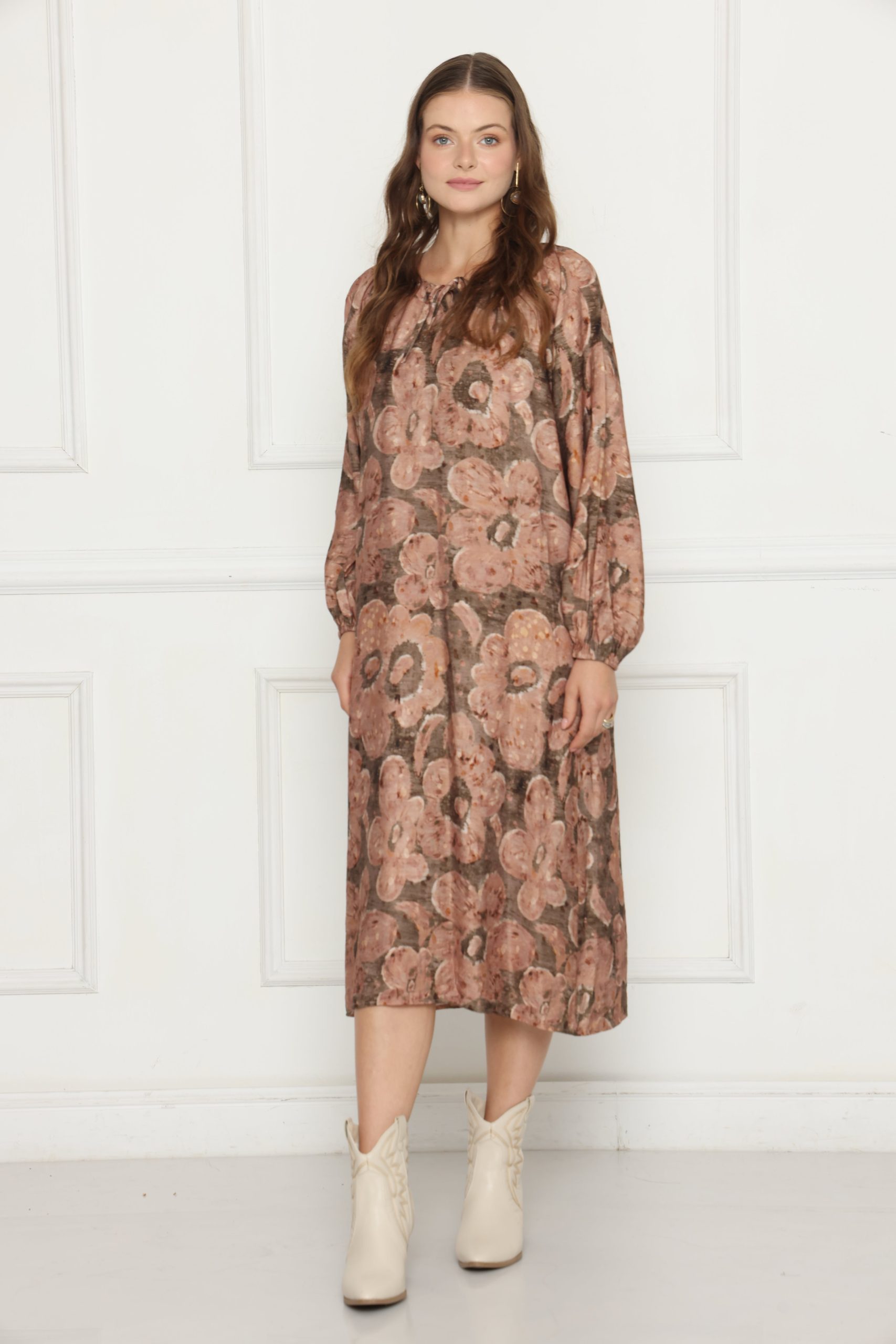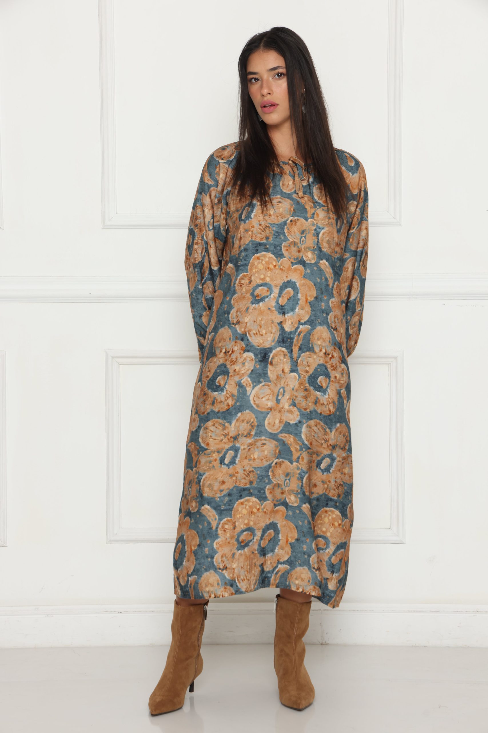 שמלת לוז עם דפוס מודפס, עשויה בד קליל ונעים, בגזרה נוחה ומחמיאה למראה יומיומי עם טאץ’ אופנתי.