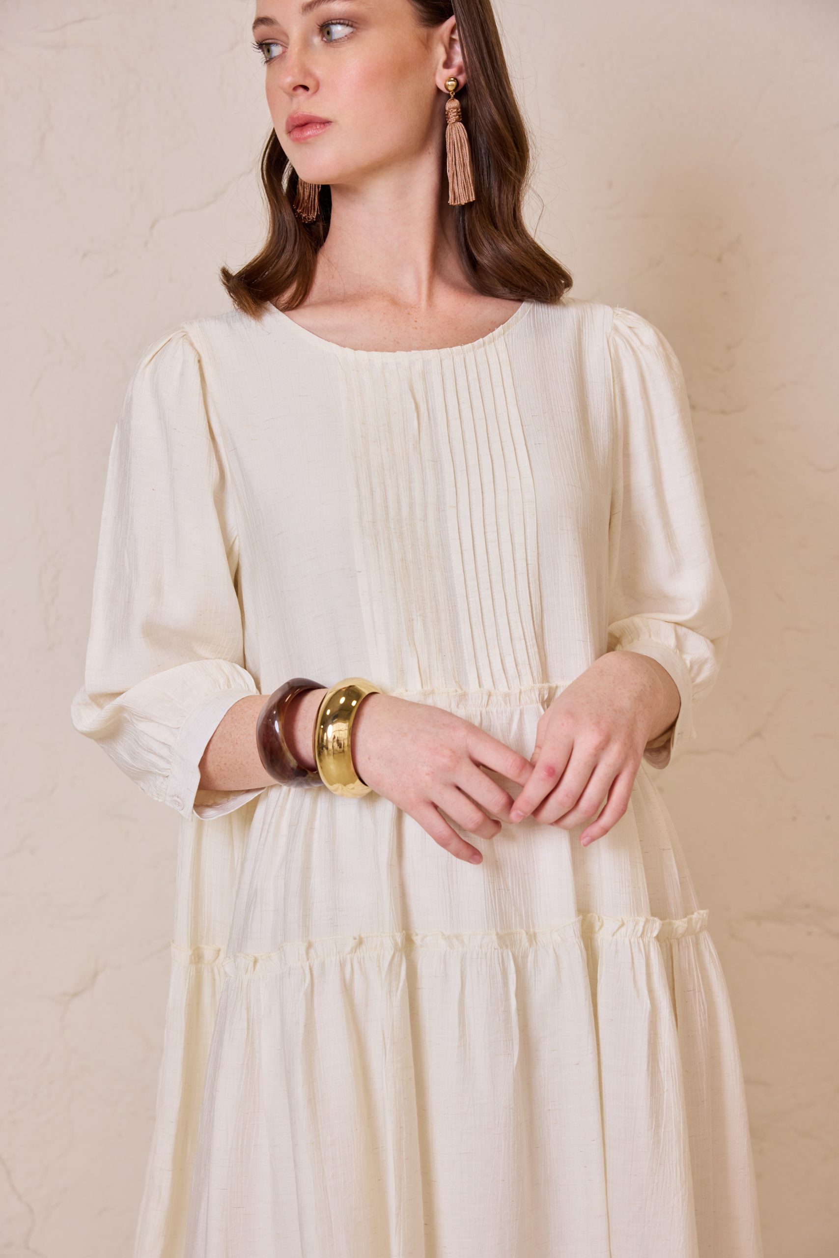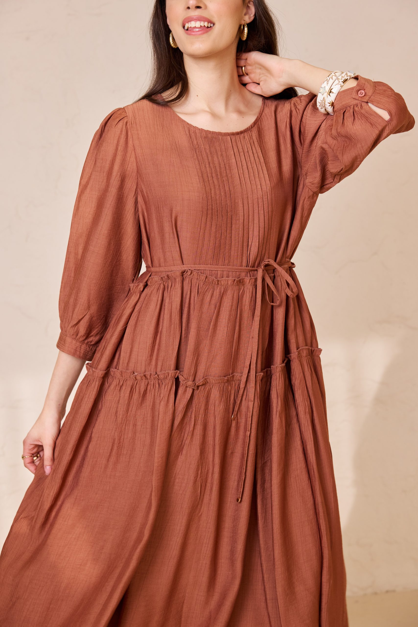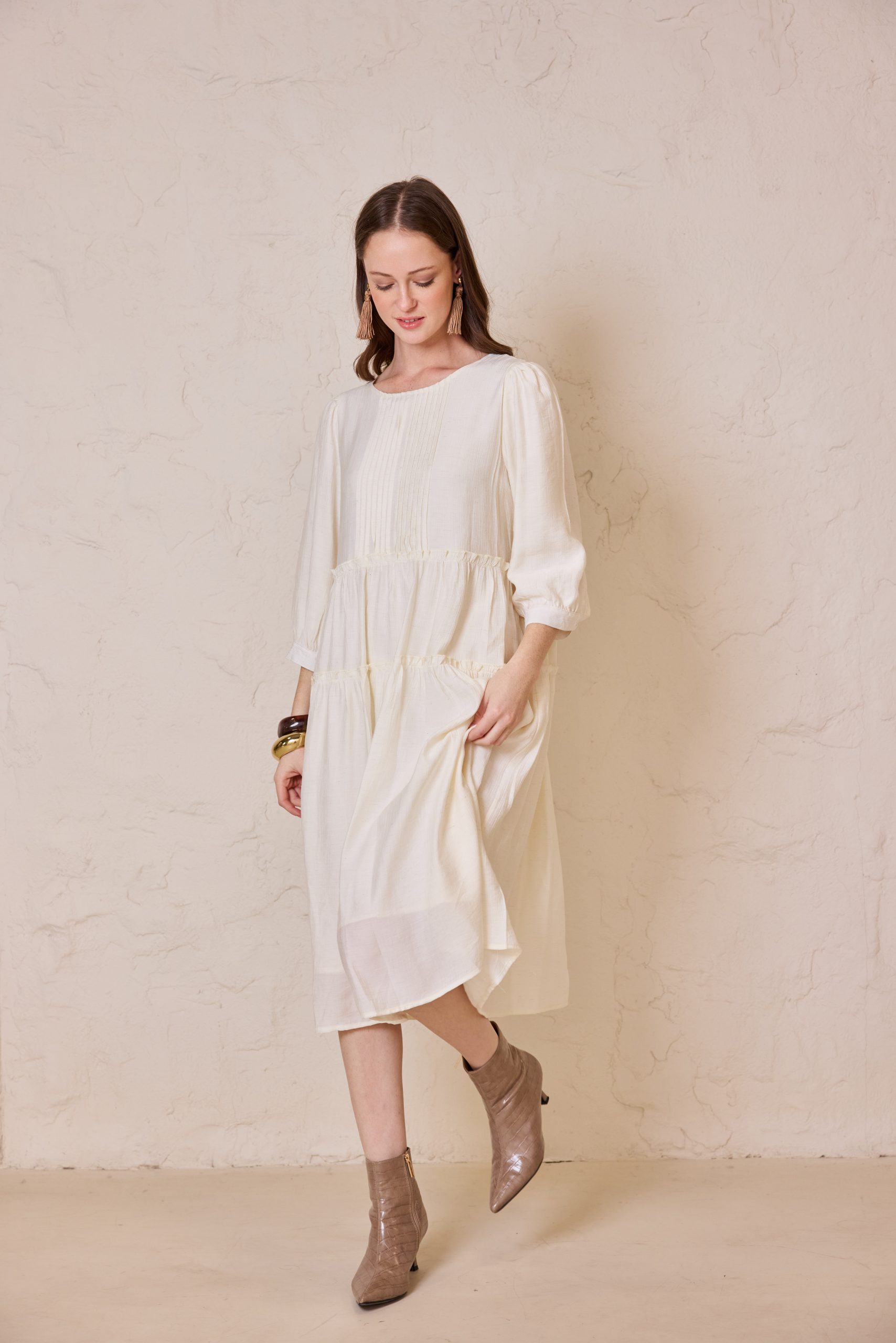 שמלה אצילית מדגם ‘לוז’ המשלבת חצאית קומות נשפכת עם עיבוד כיווצים ייחודי באזור האפוד, המעניק טקסטורה עשירה ומראה מתוחכם.