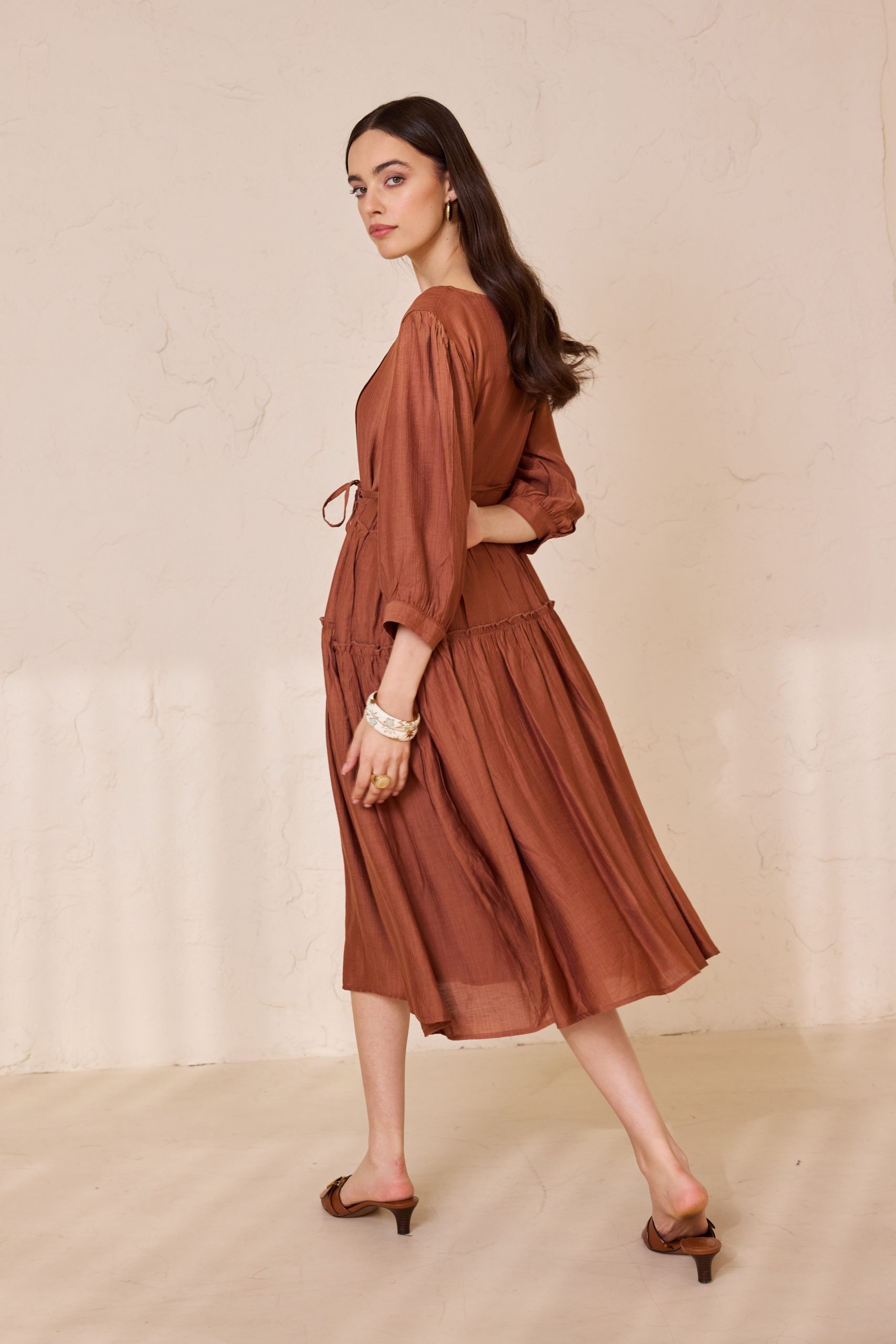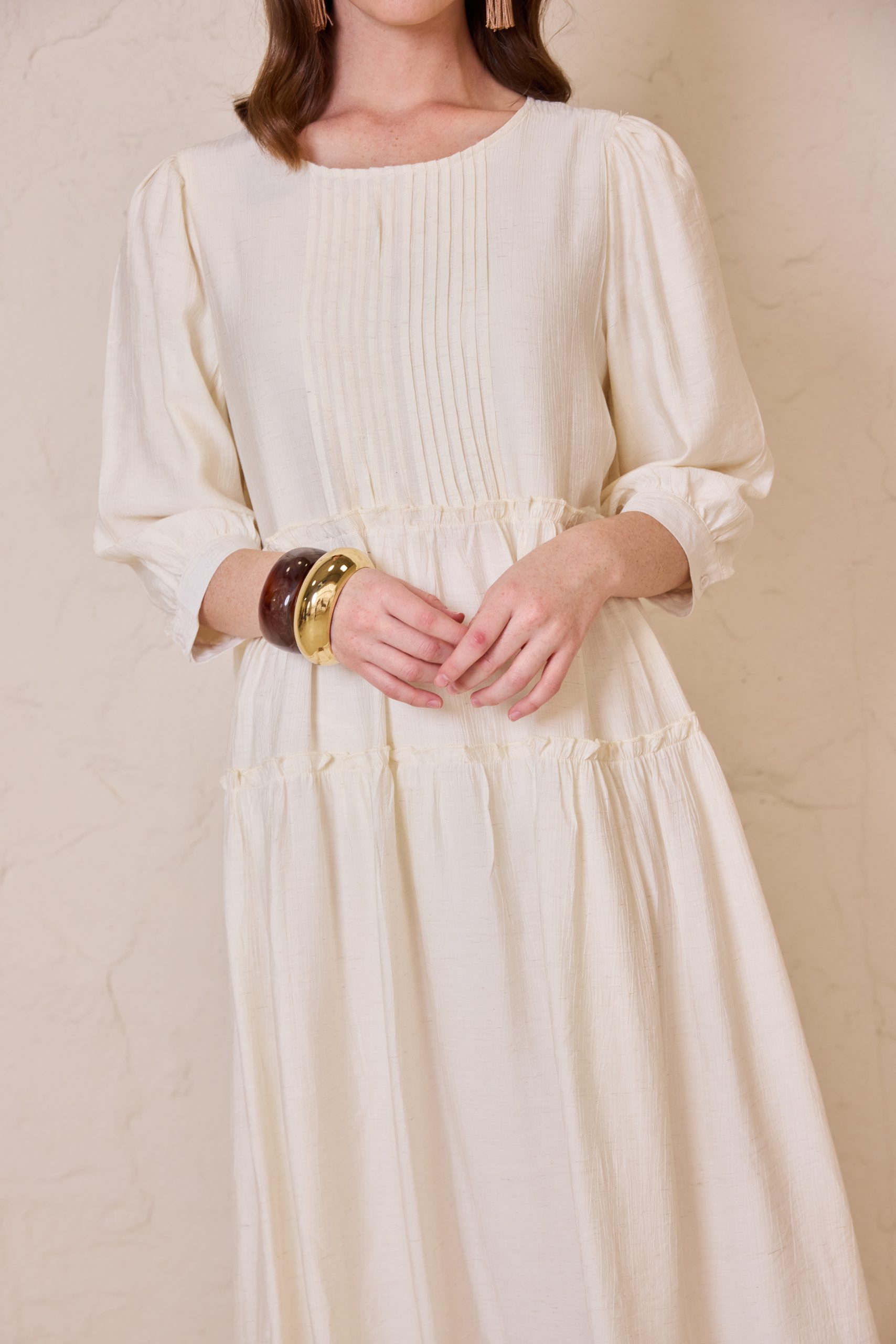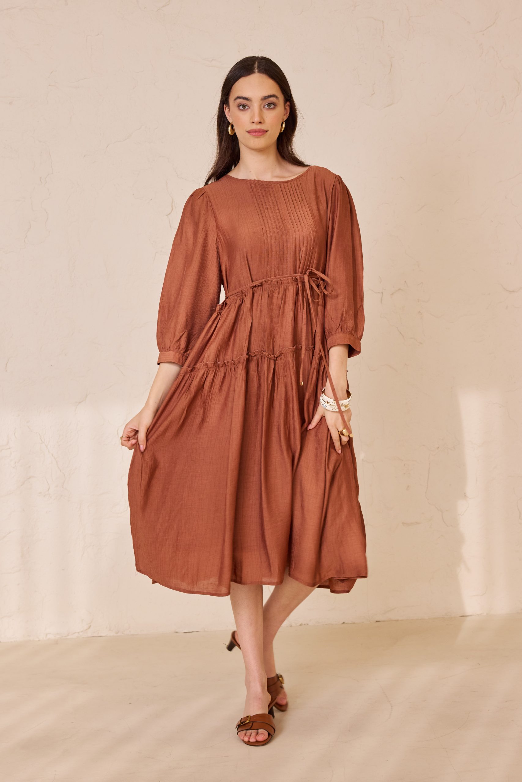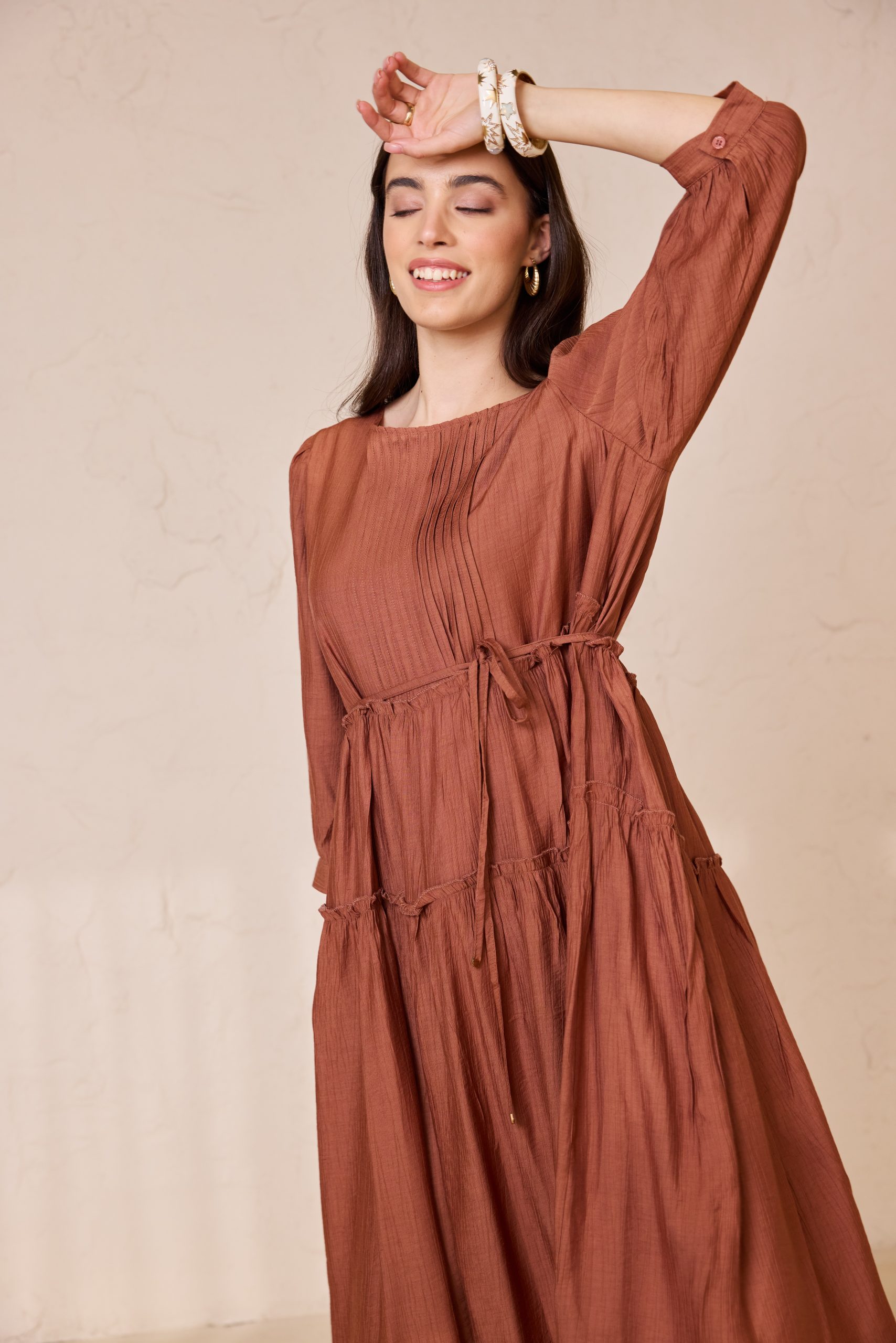 שמלה אצילית מדגם ‘לוז’ המשלבת חצאית קומות נשפכת עם עיבוד כיווצים ייחודי באזור האפוד, המעניק טקסטורה עשירה ומראה מתוחכם.