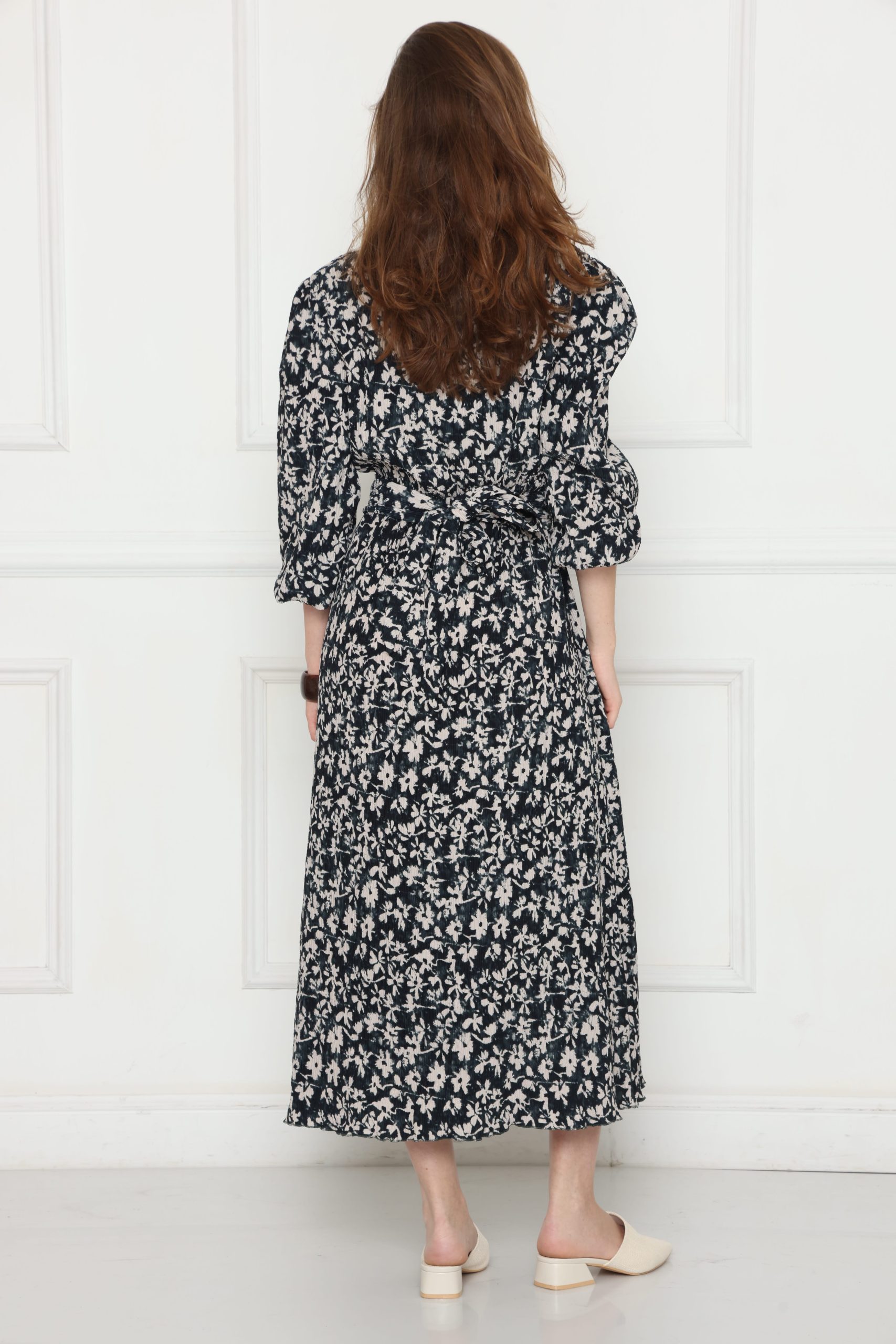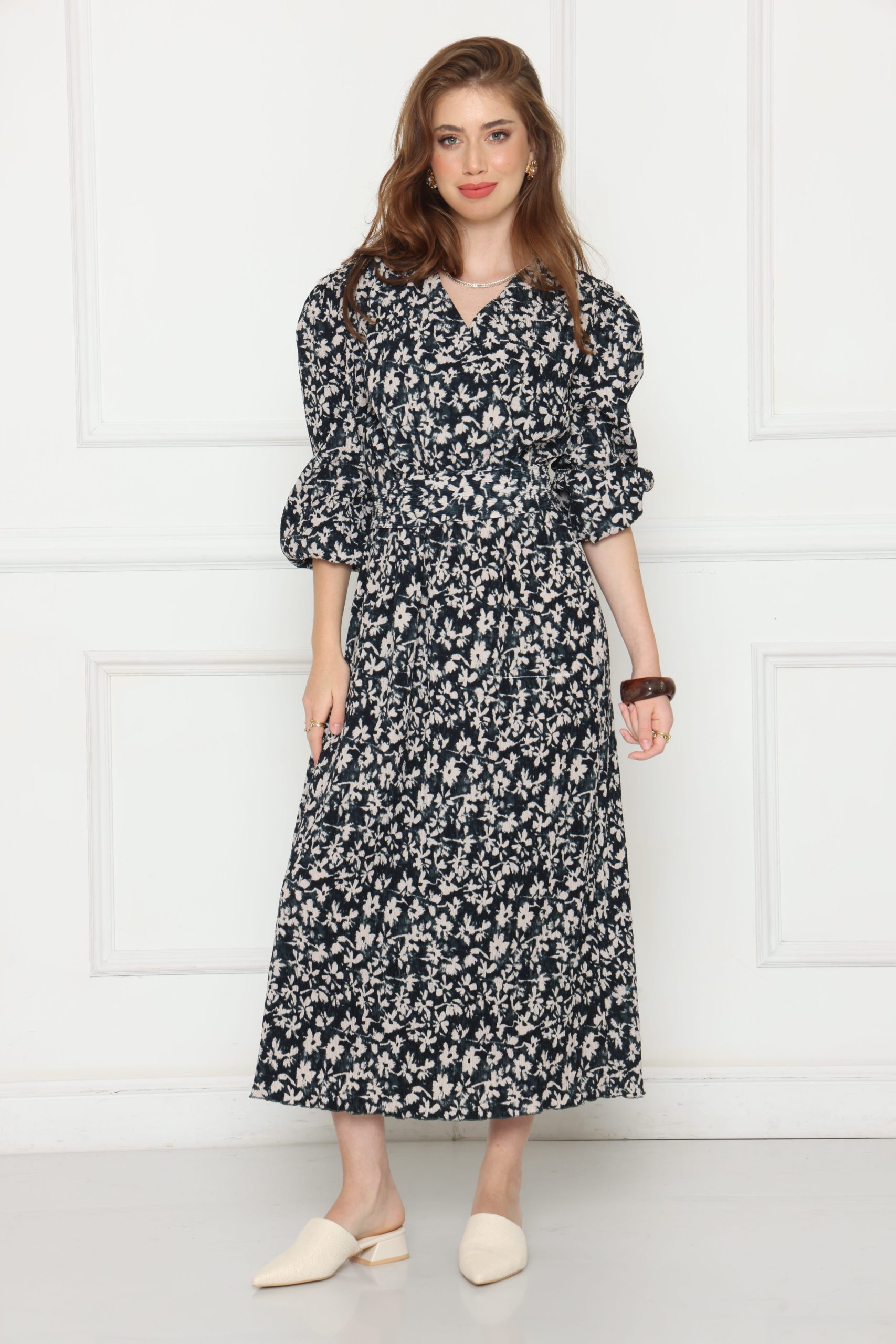 שמלה ארוכה ומחמיאה בגזרת מעטפת אלגנטית, עשויה בד פליסה עם דפוס פרחוני קלאסי. החגורה במותן מאפשרת התאמה אישית ומדגישה את קווי הגוף, בעוד שהבד הקליל והזורם יוצר תחושת נוחות ונשיות. מושלמת למראה יומיומי אלגנטי או לאירועים מיוחדים.