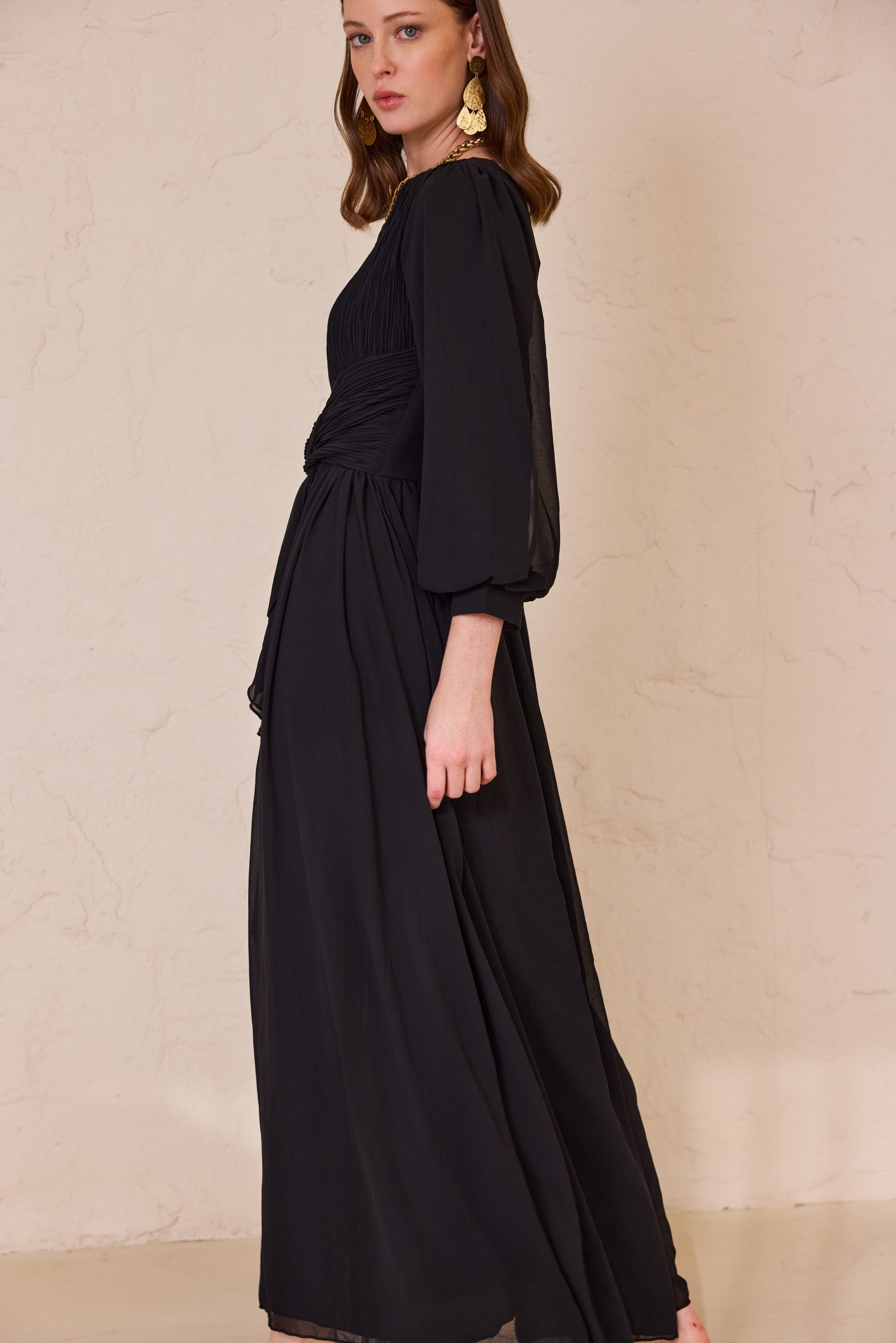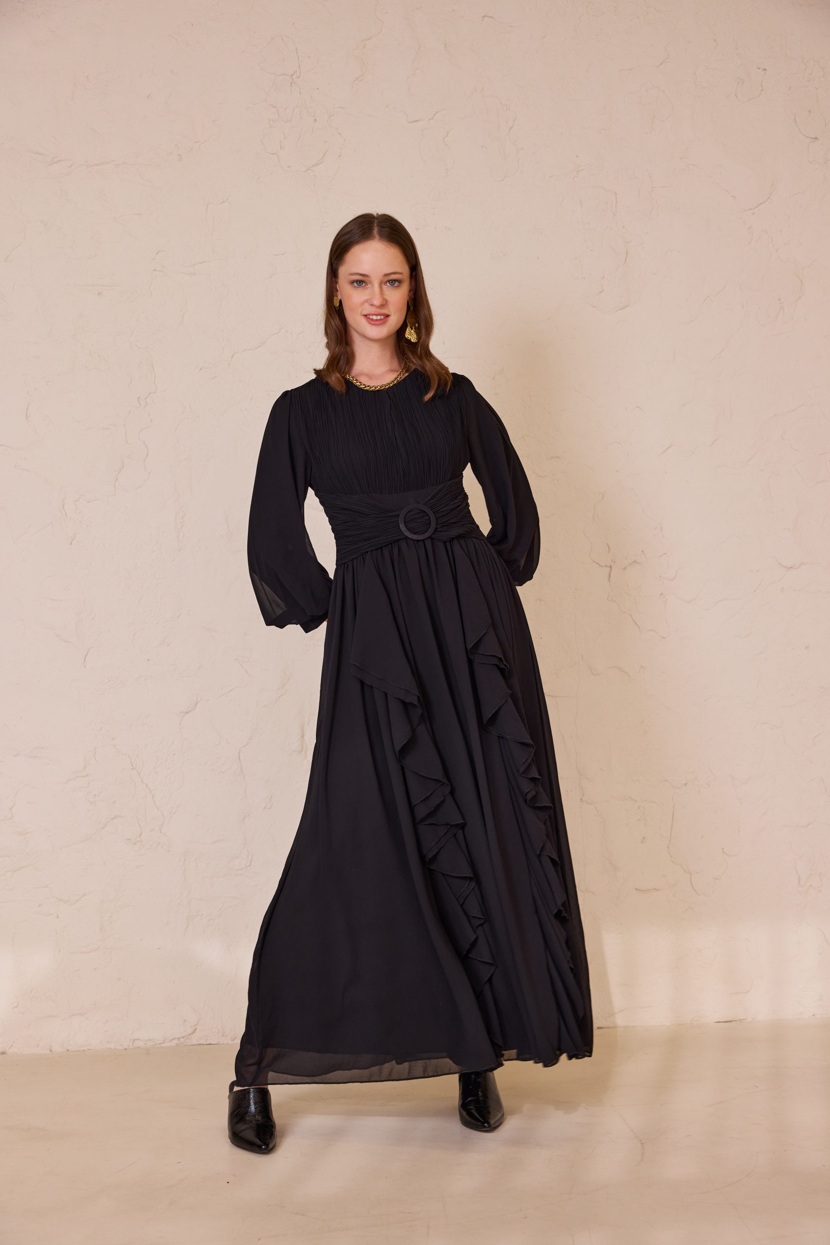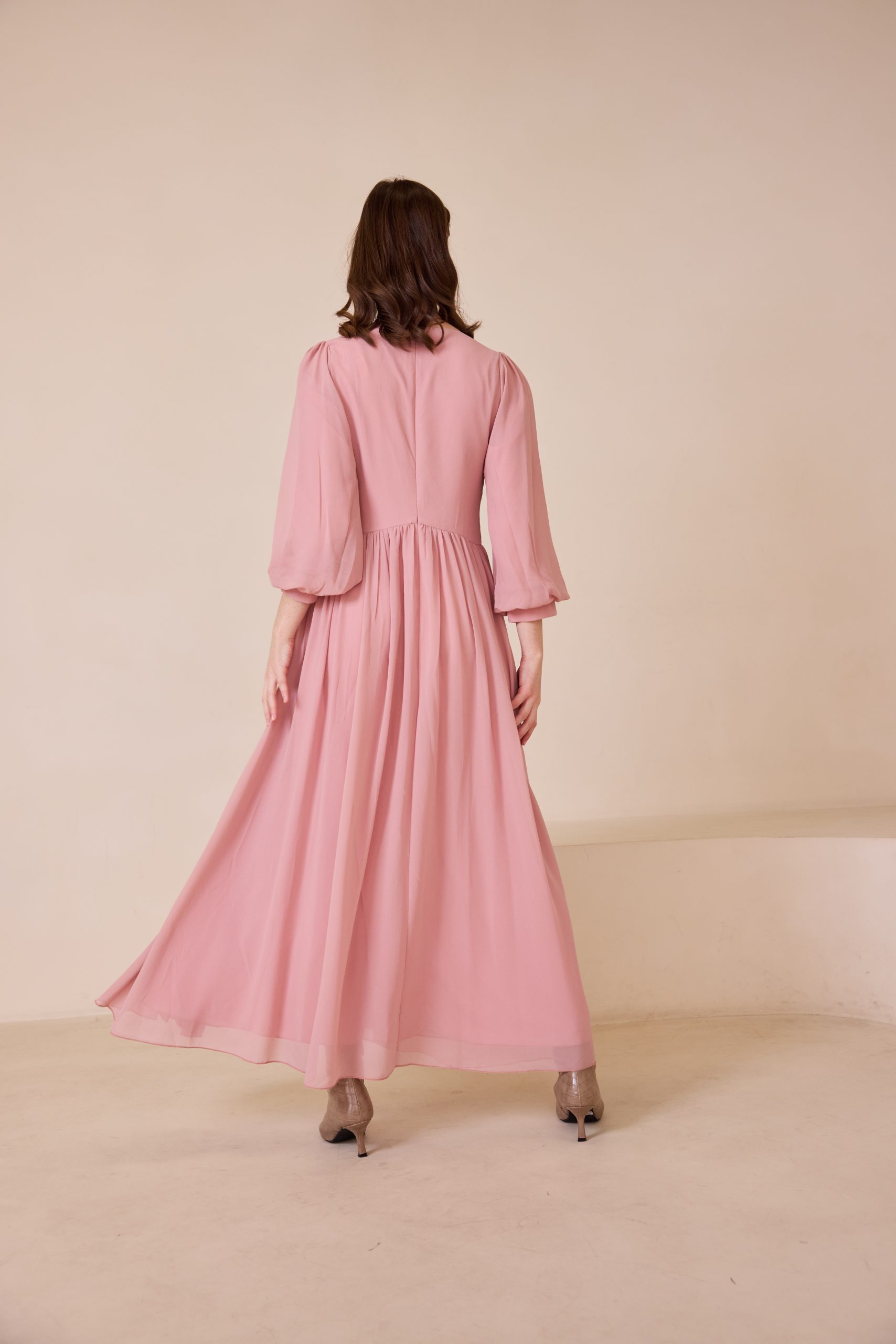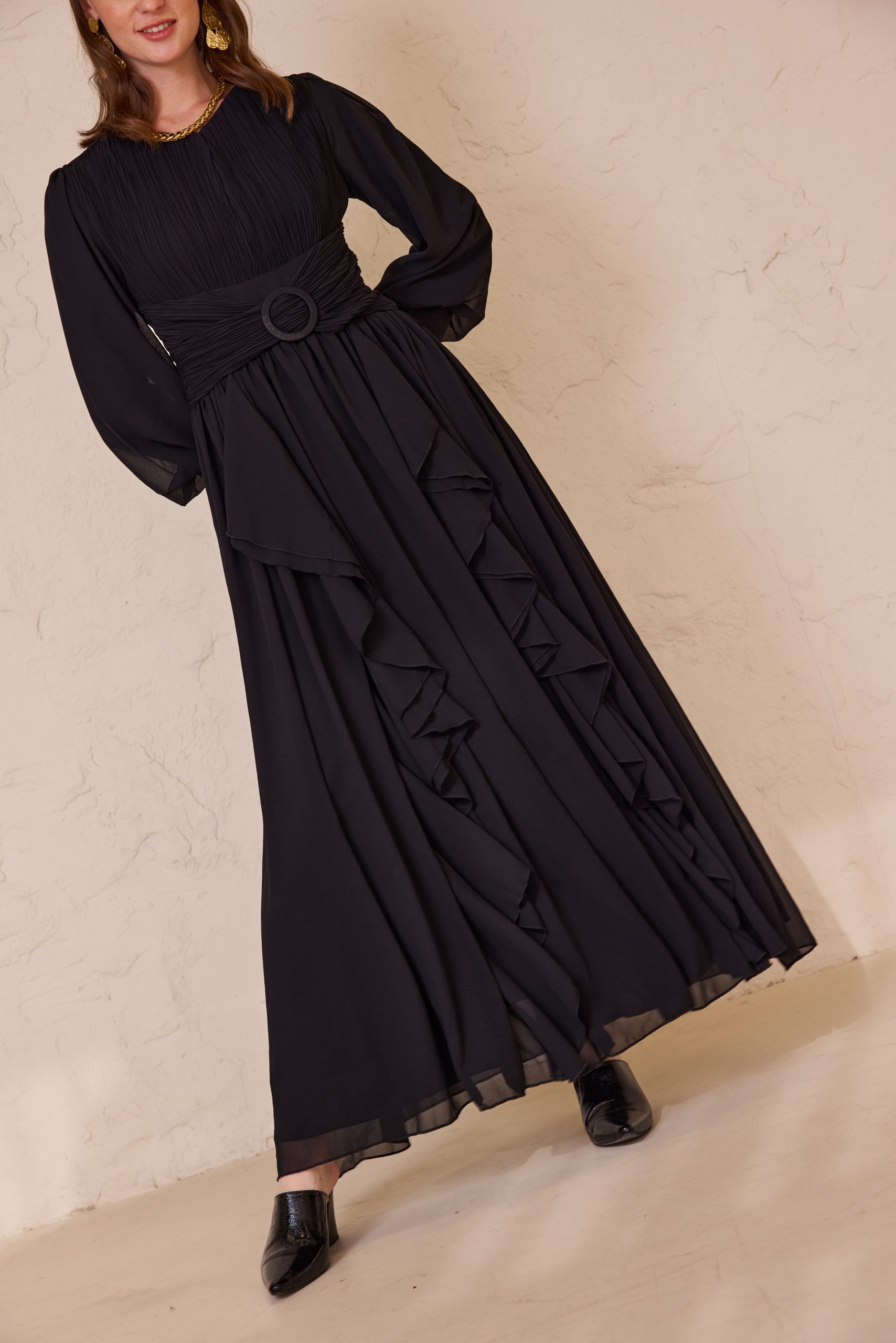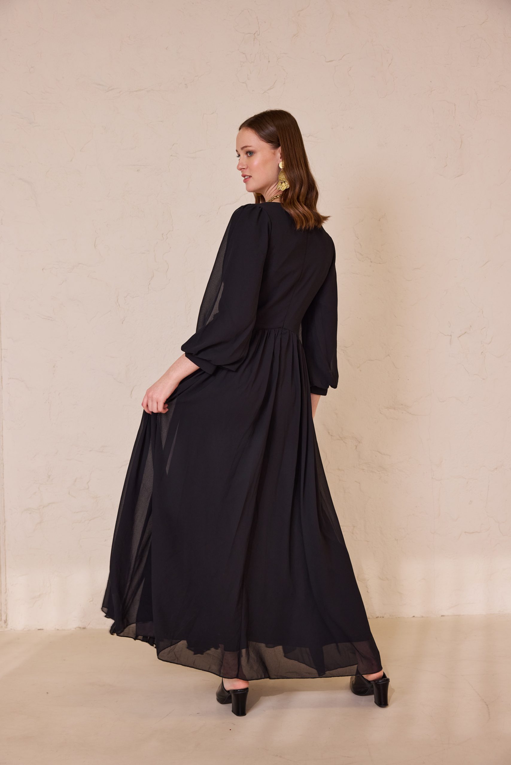 שמלת ערב מקסי מרשימה מבד שיפון איכותי, קליל ונשפך, המעניק תנועה רכה ומראה יוקרתי. בגזרה רחבה, נוחה ומכובדת.