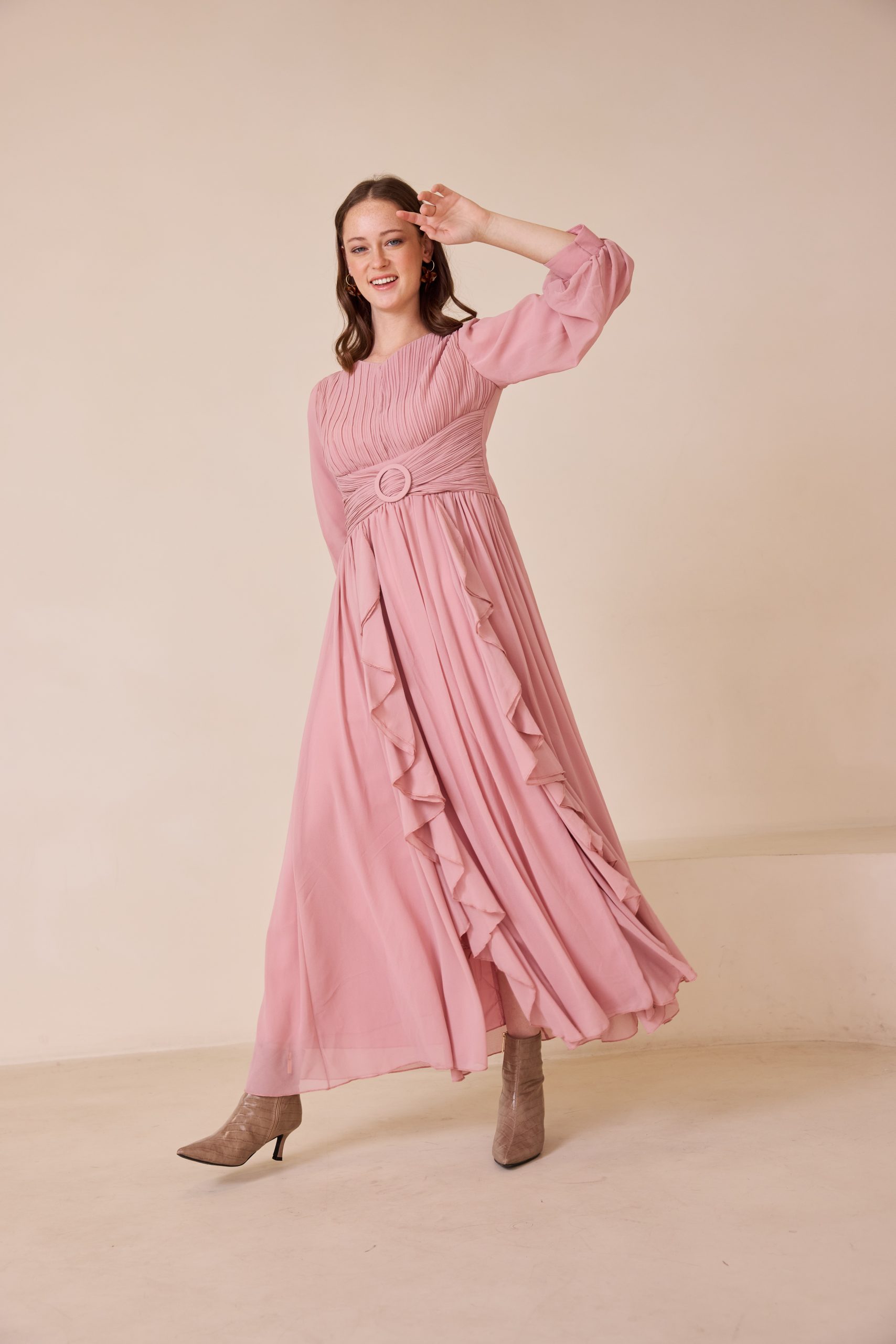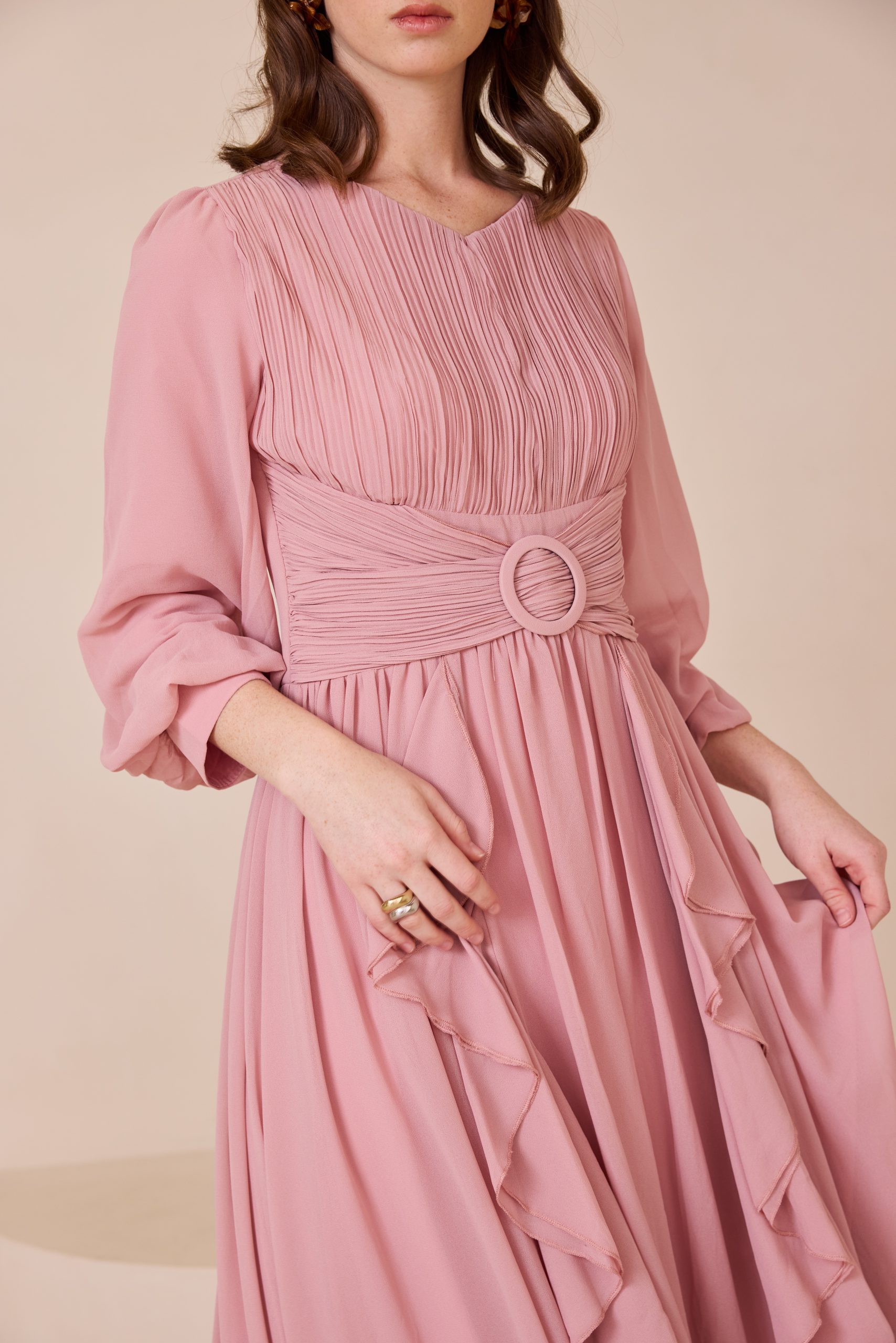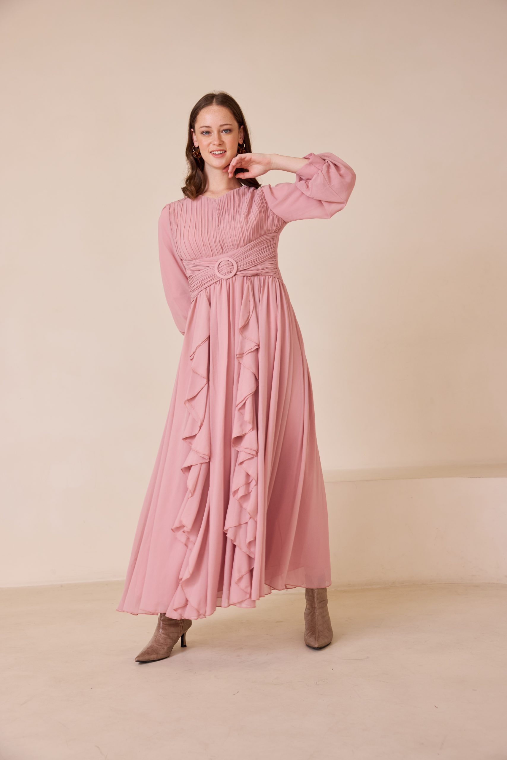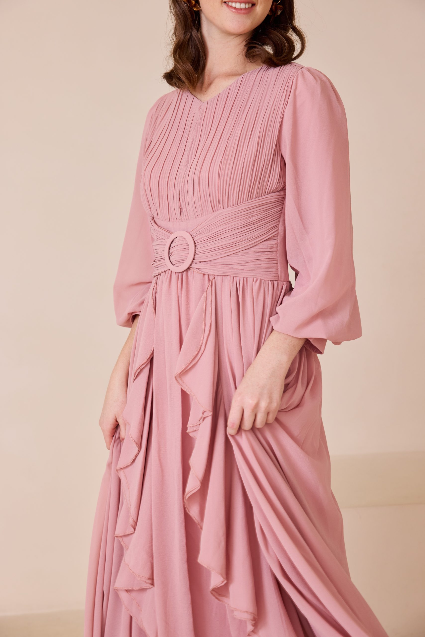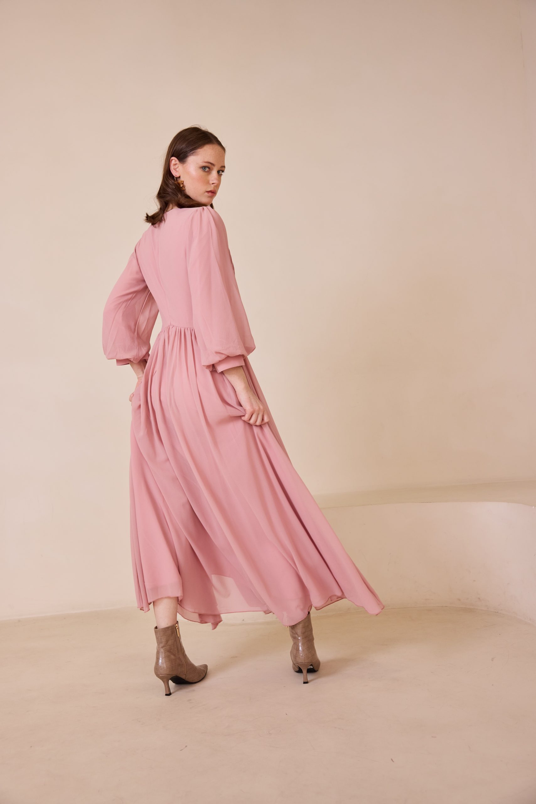 שמלת ערב מקסי מרשימה מבד שיפון איכותי, קליל ונשפך, המעניק תנועה רכה ומראה יוקרתי. בגזרה רחבה, נוחה ומכובדת.
