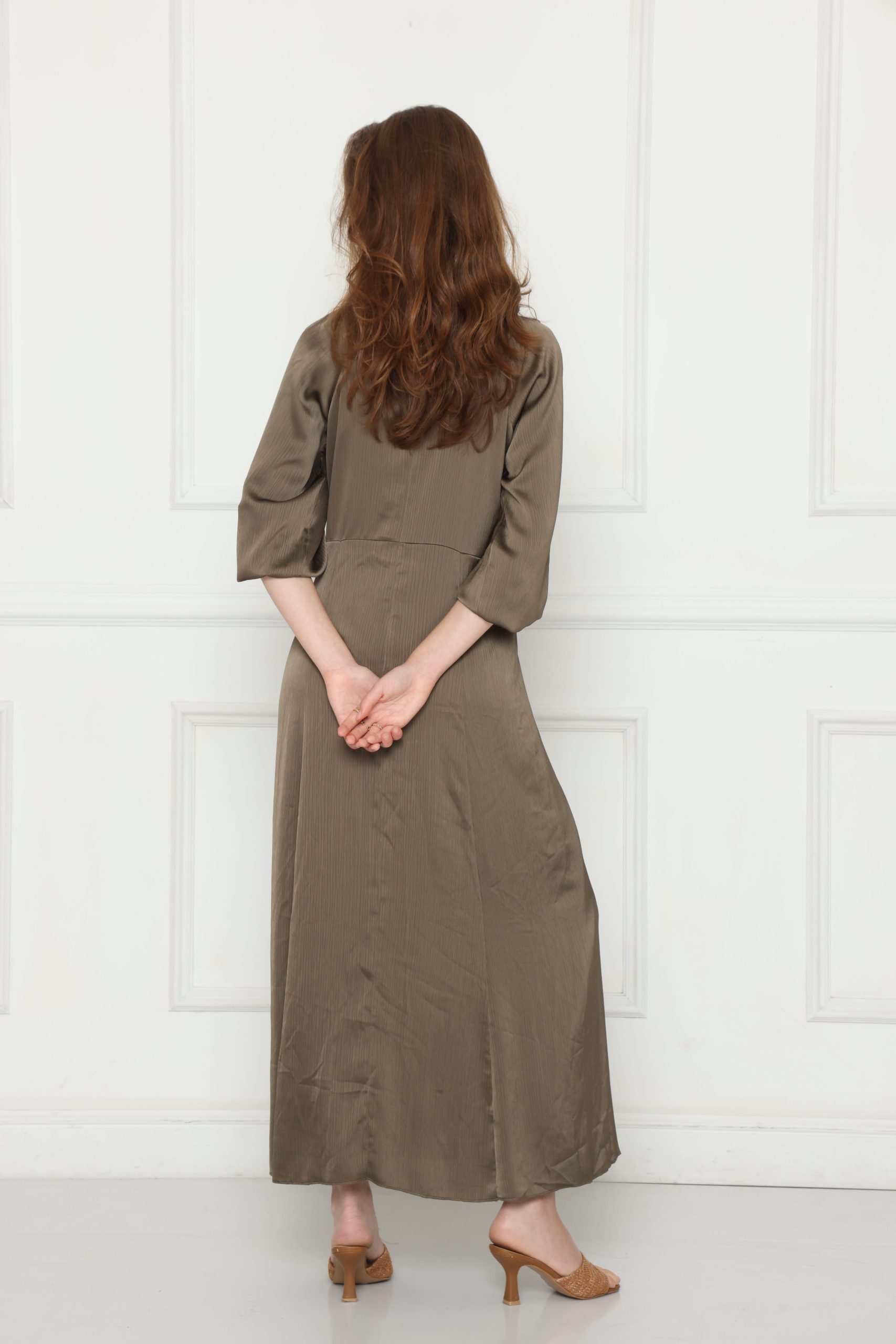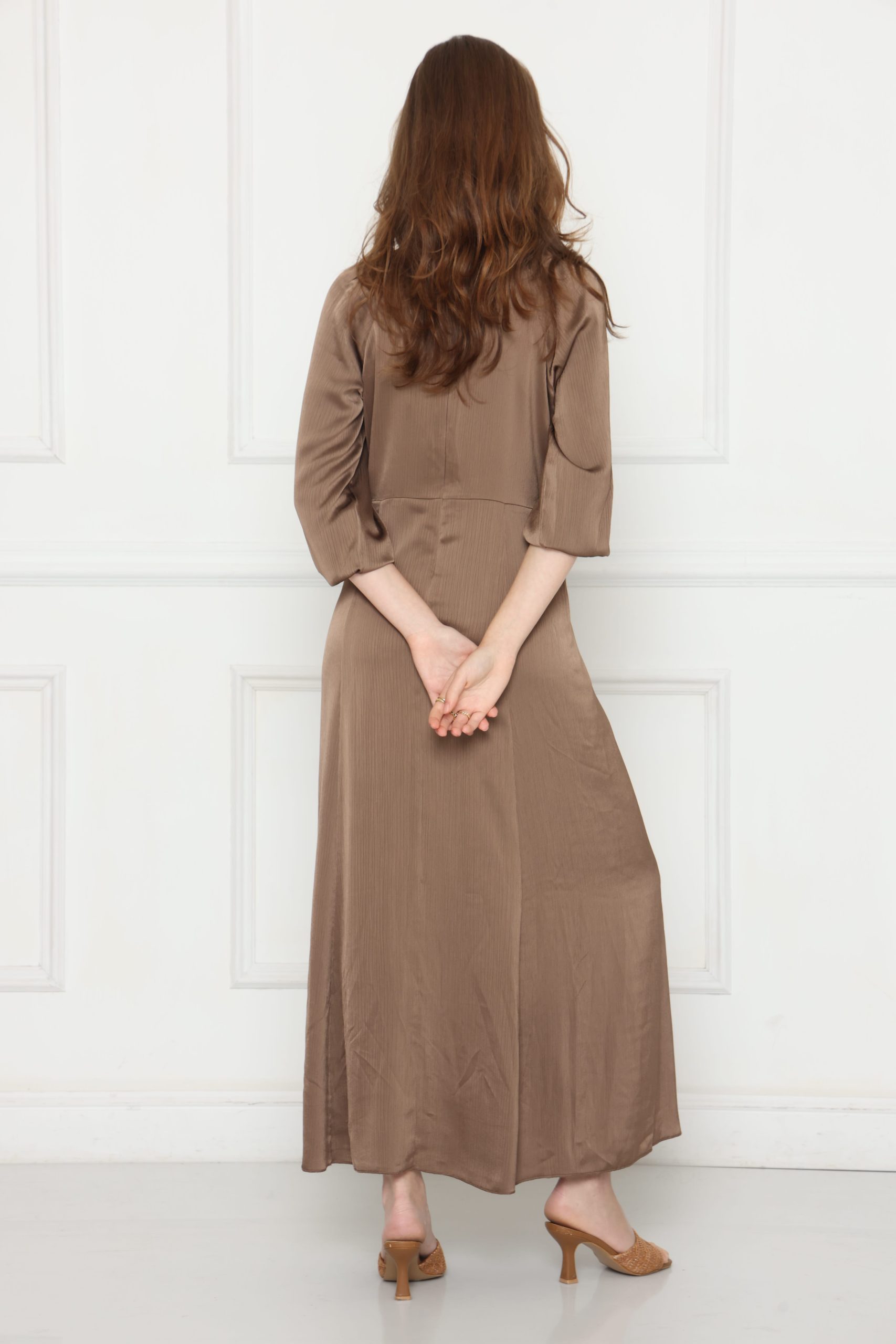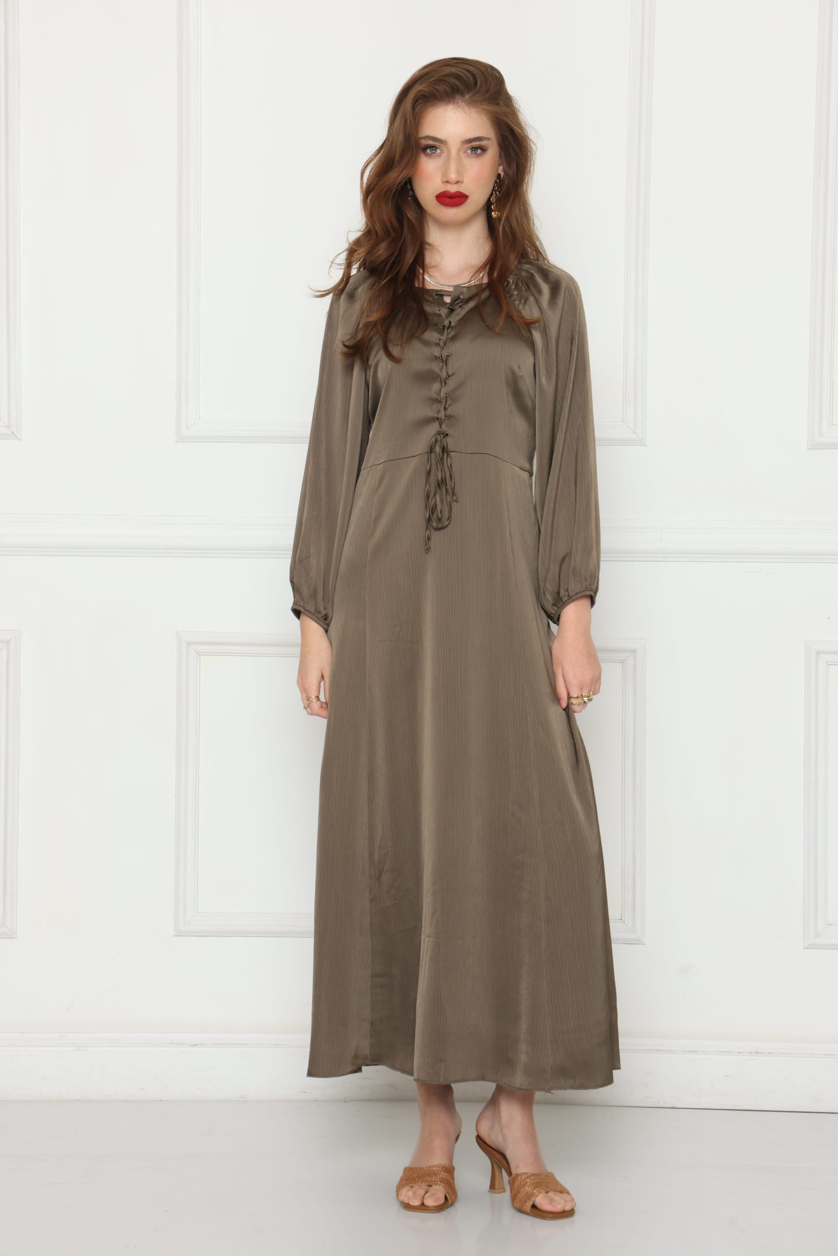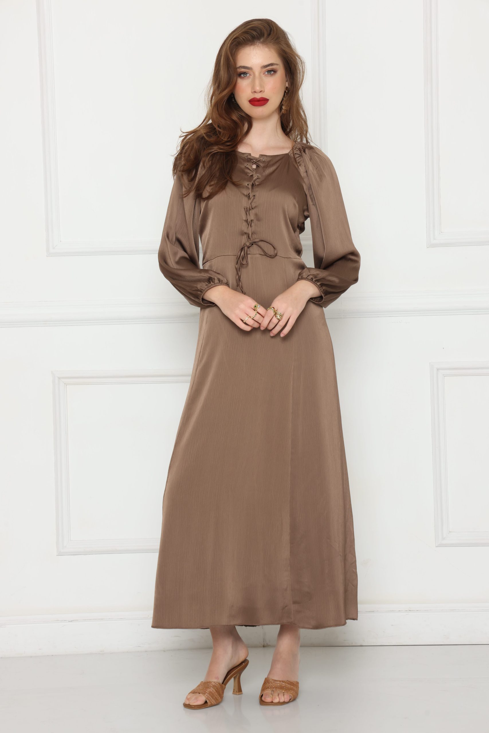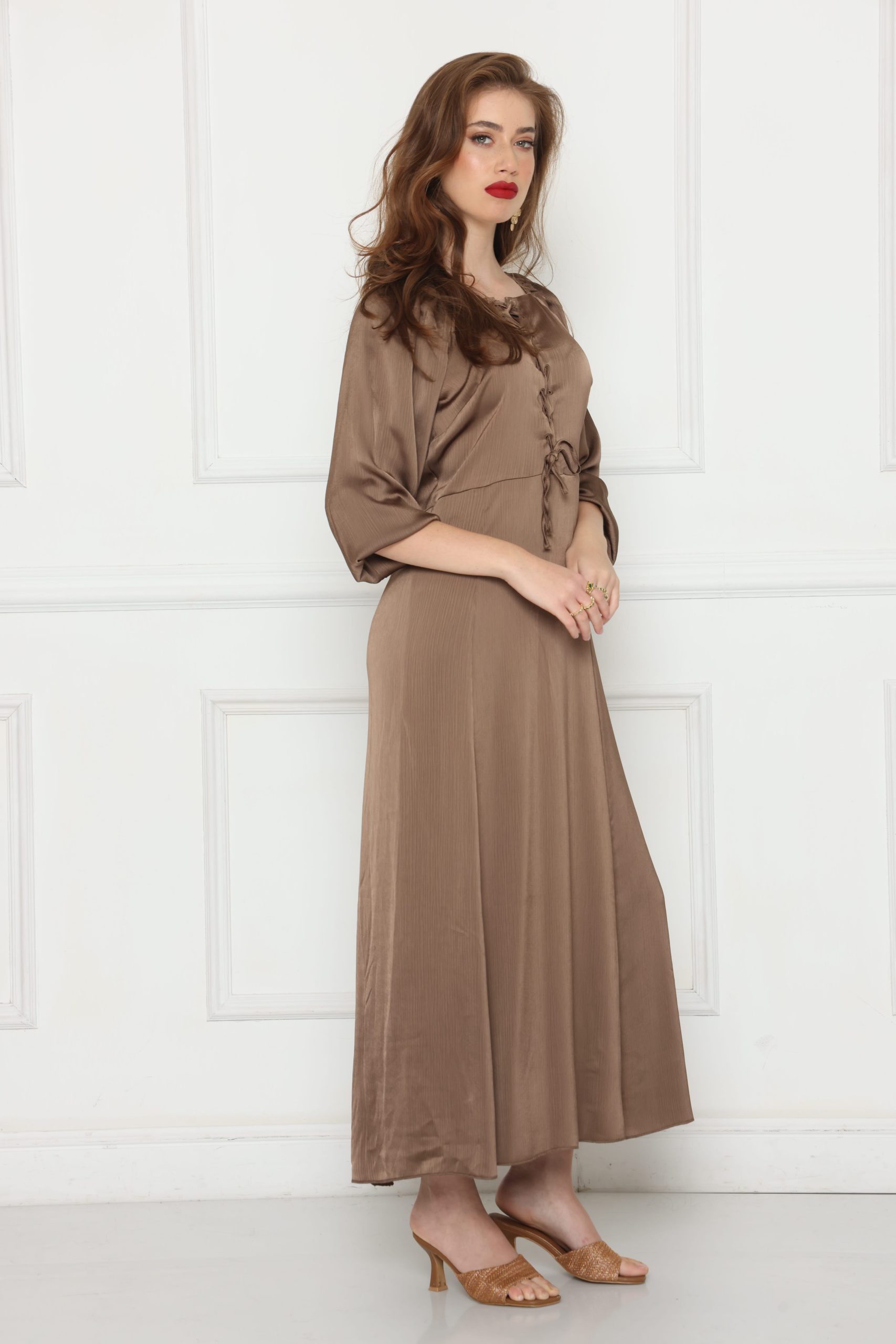 שמלה ארוכה ומרשימה בגזרת מקסי מחמיאה, המשלבת עיצוב פשוט ומודרני. השרוכים במותן מאפשרים התאמה אישית ונוחות, ומדגישים את קווי הגוף בצורה אלגנטית. אידיאלית לאירועים קז’ואליים או למראה יומיומי עם טאצ’ של קלאס.