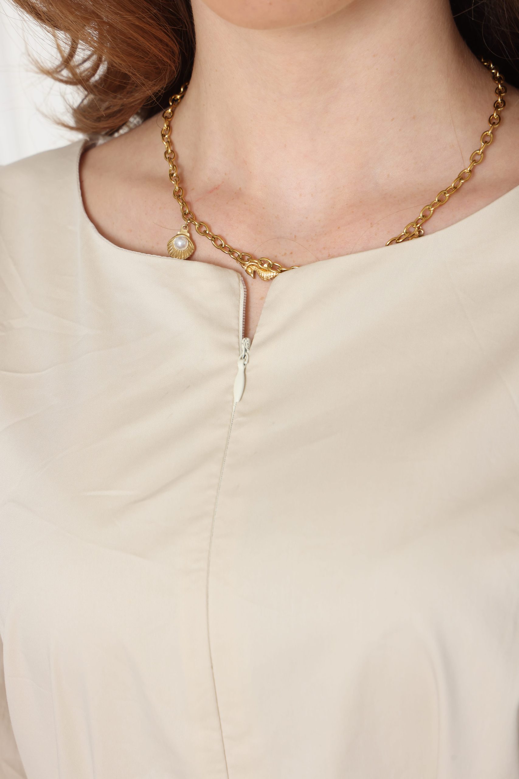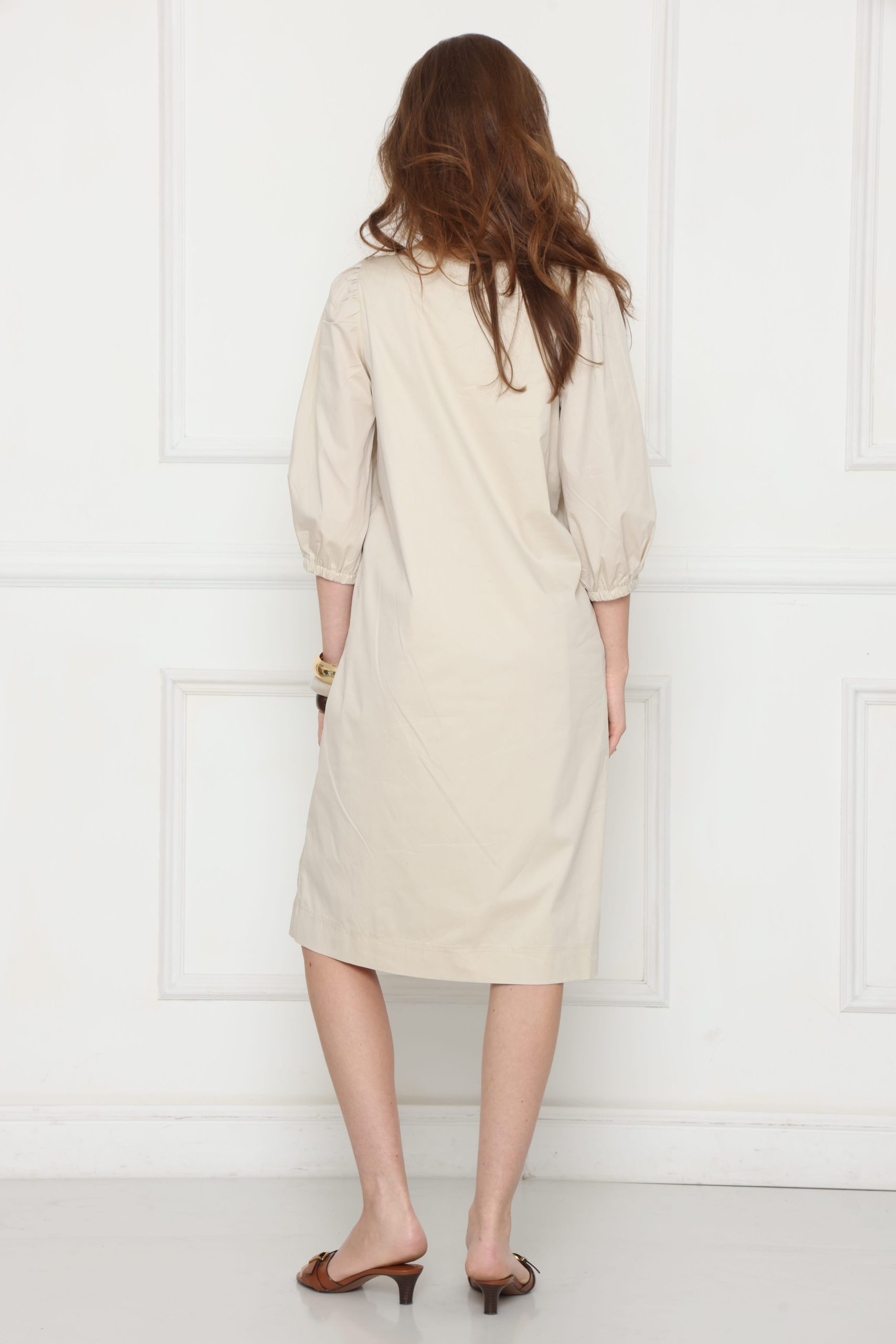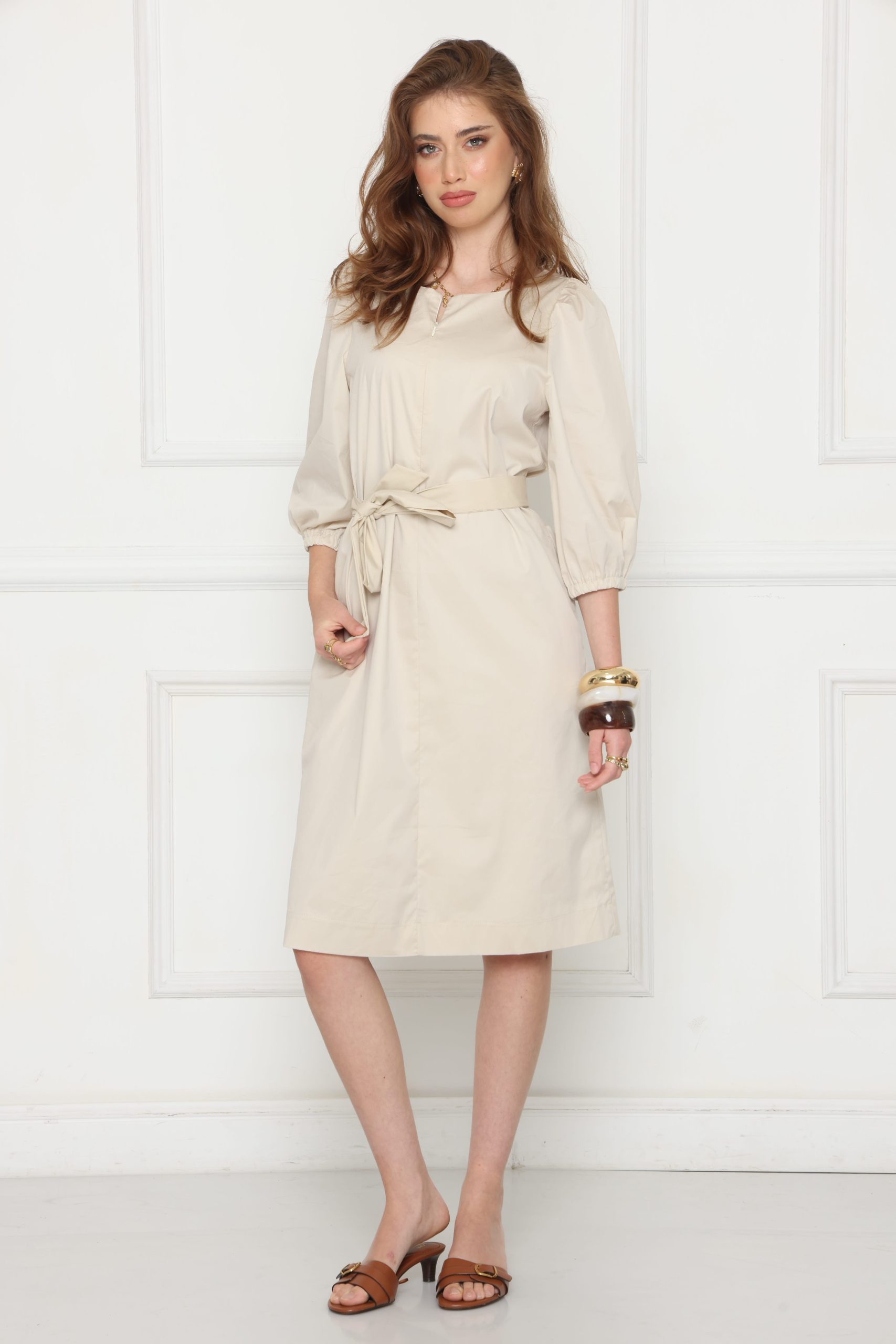 שמלה קלאסית ומינימליסטית בגזרת ברך ישרה, המשלבת עיצוב נקי עם אלמנט קשירה במותן להדגשת קו הגוף. השרוולים הנפוחים באורך ¾ והגוון הבהיר מעניקים מראה אלגנטי ויוקרתי – מושלם למראה יומיומי מוקפד או לאירוע עם סטייל.