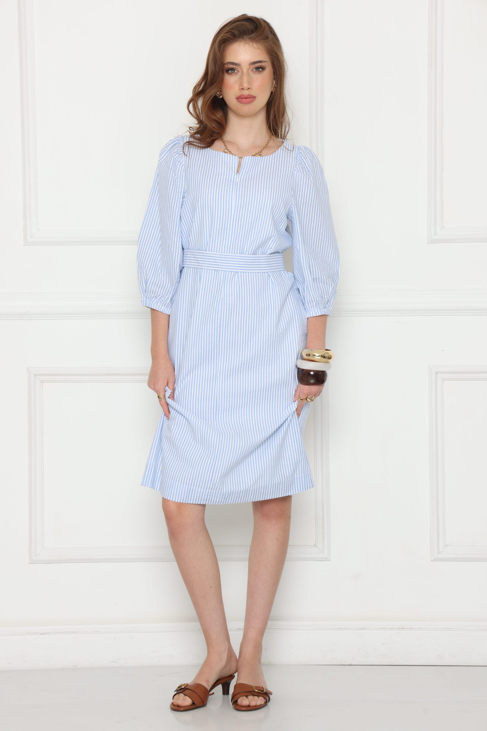 שמלה קלאסית ומעודנת בגזרת ברך מחמיאה, המעוצבת עם דוגמת פסים עדינה בגווני תכלת ולבן. הגזרה המוקפדת עם כיסים פרקטיים וקשירה במותן יוצרת מראה אלגנטי ונשי, מושלם ליום עבודה, פגישות או בילוי קיצי באווירה רעננה.