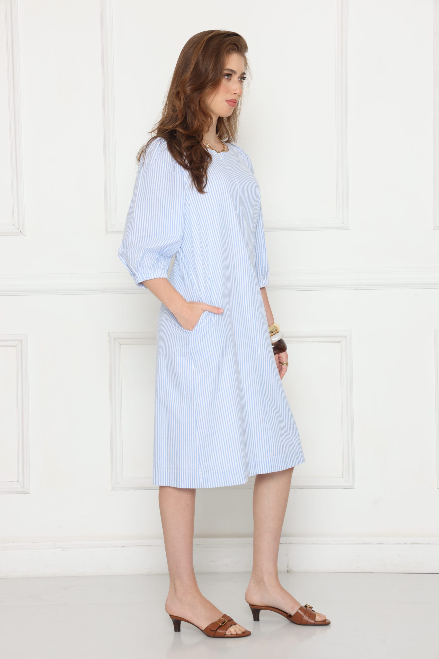 שמלת פרקל פסים עם כיסים בגווני תכלת ולבן