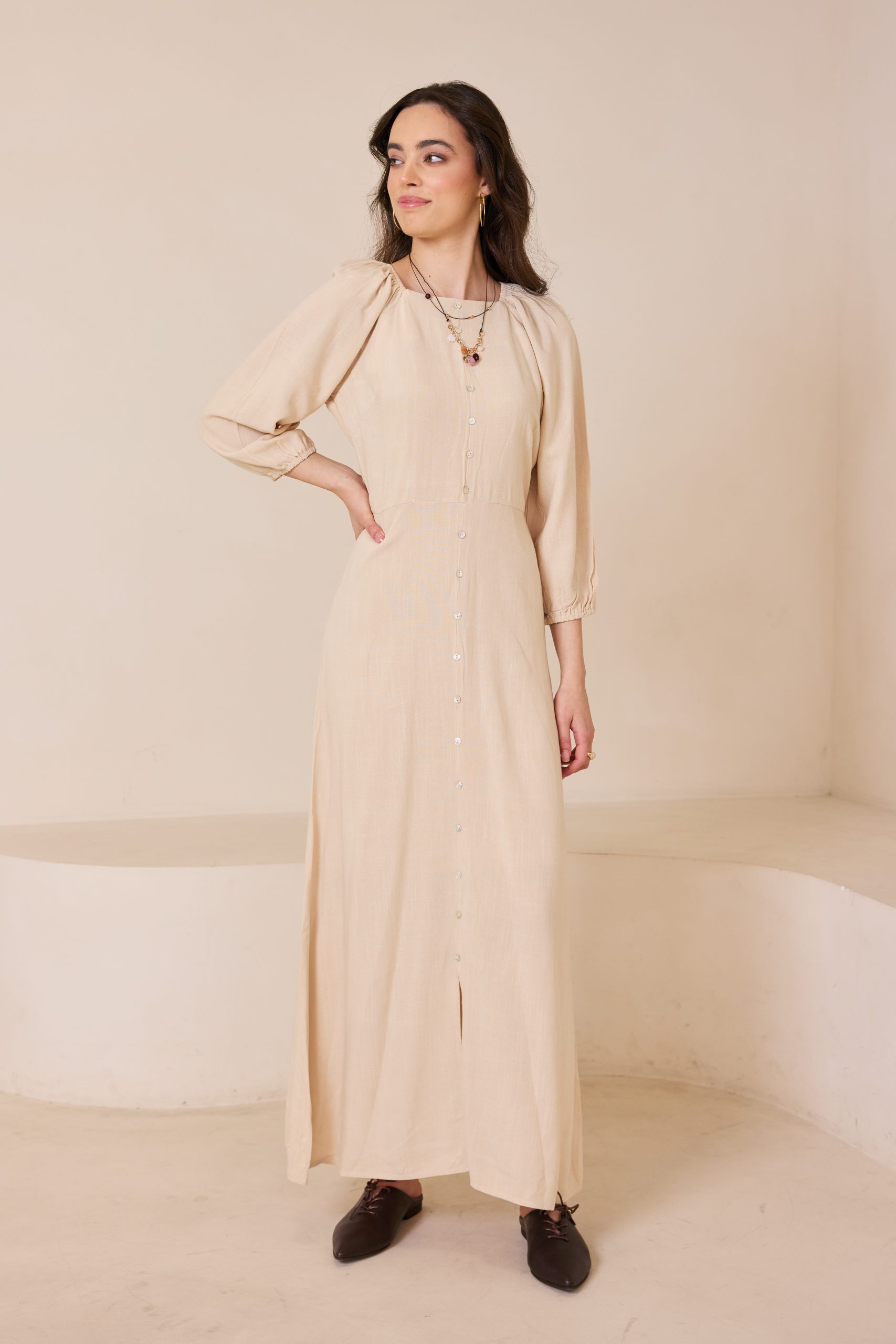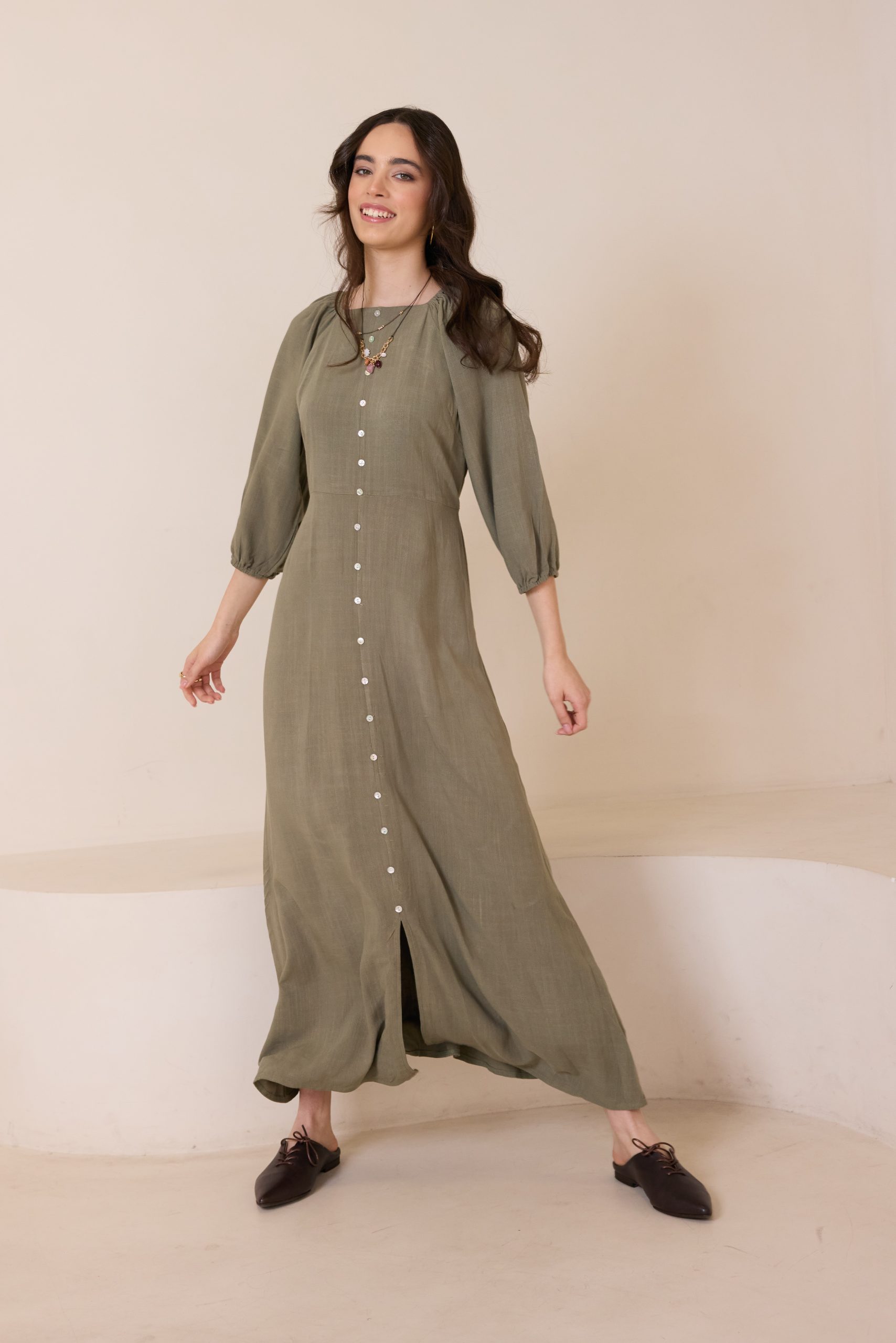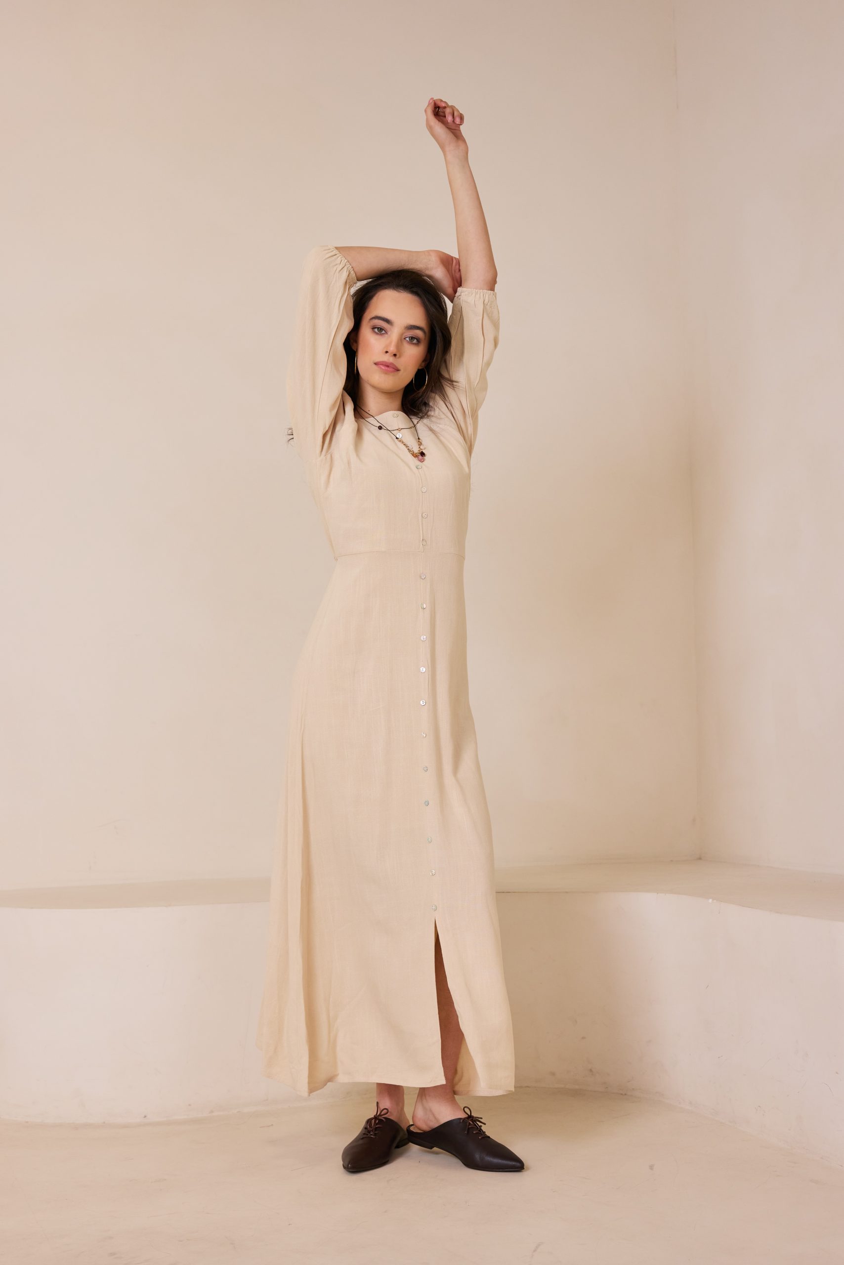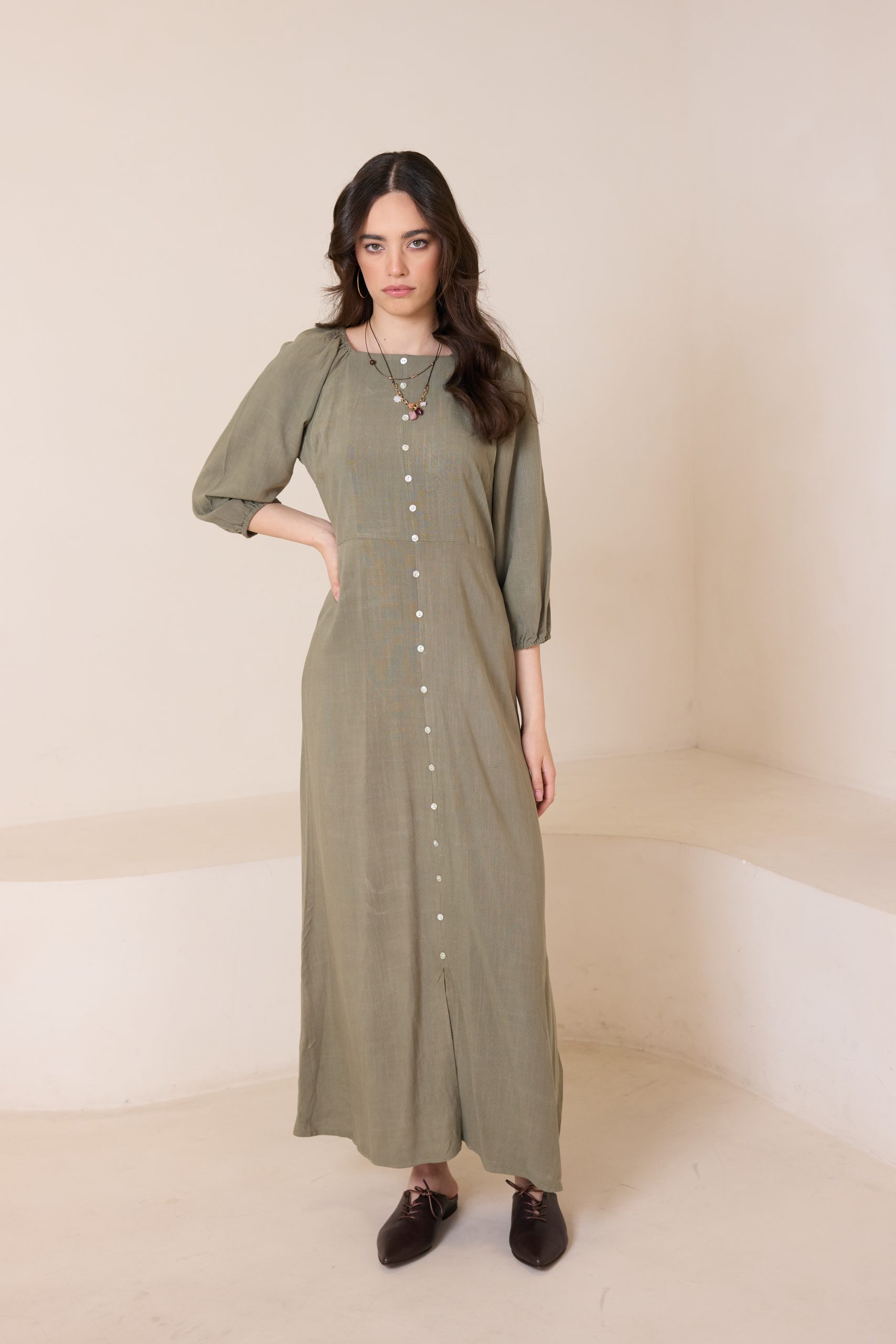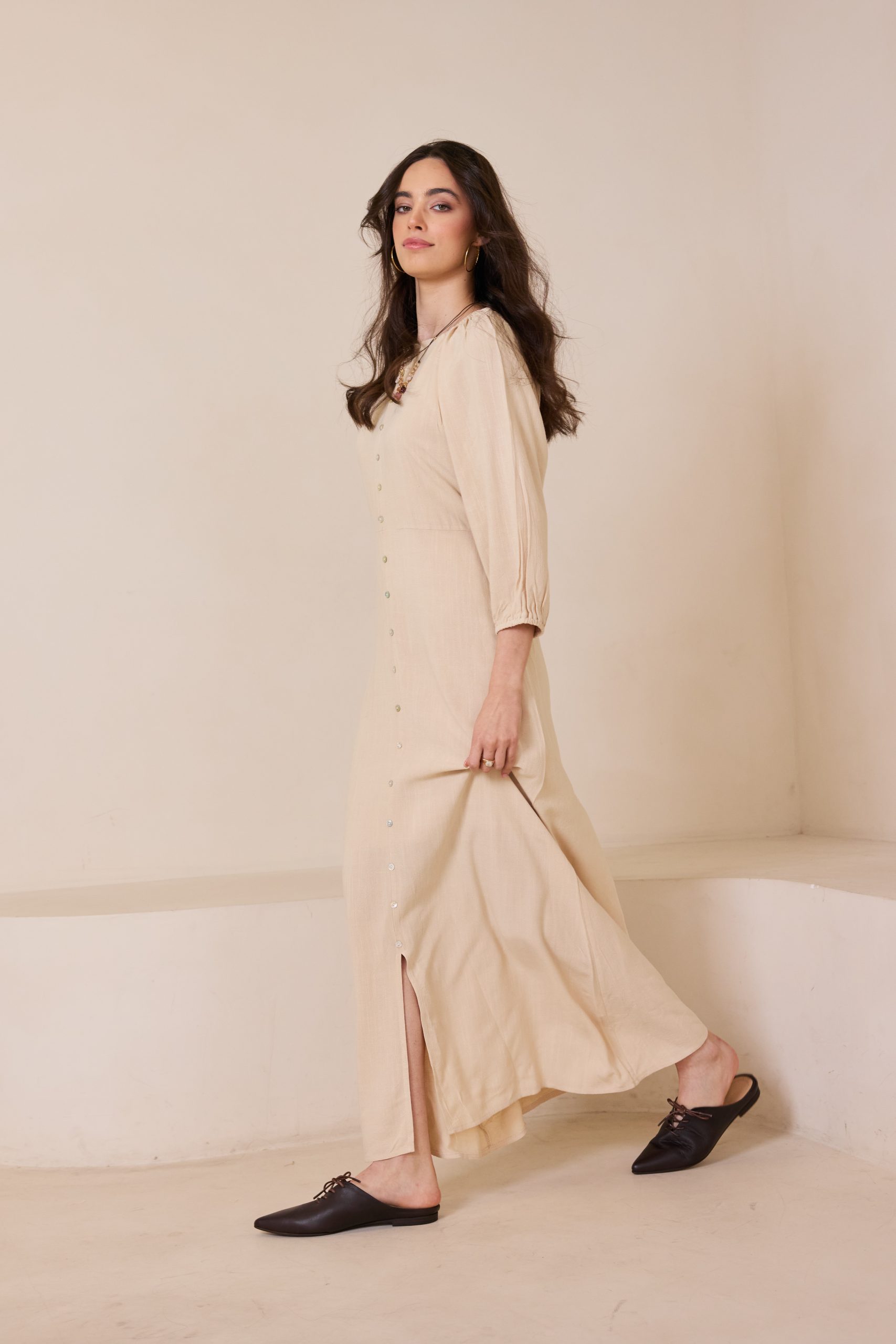 שמלת מקסי קלאסית מבד פשתן איכותי, אוורירי ונעים, המשלבת סגירת דמוי כפתורים אלגנטית לאורכה למראה יוקרתי ובלתי מתאמץ.