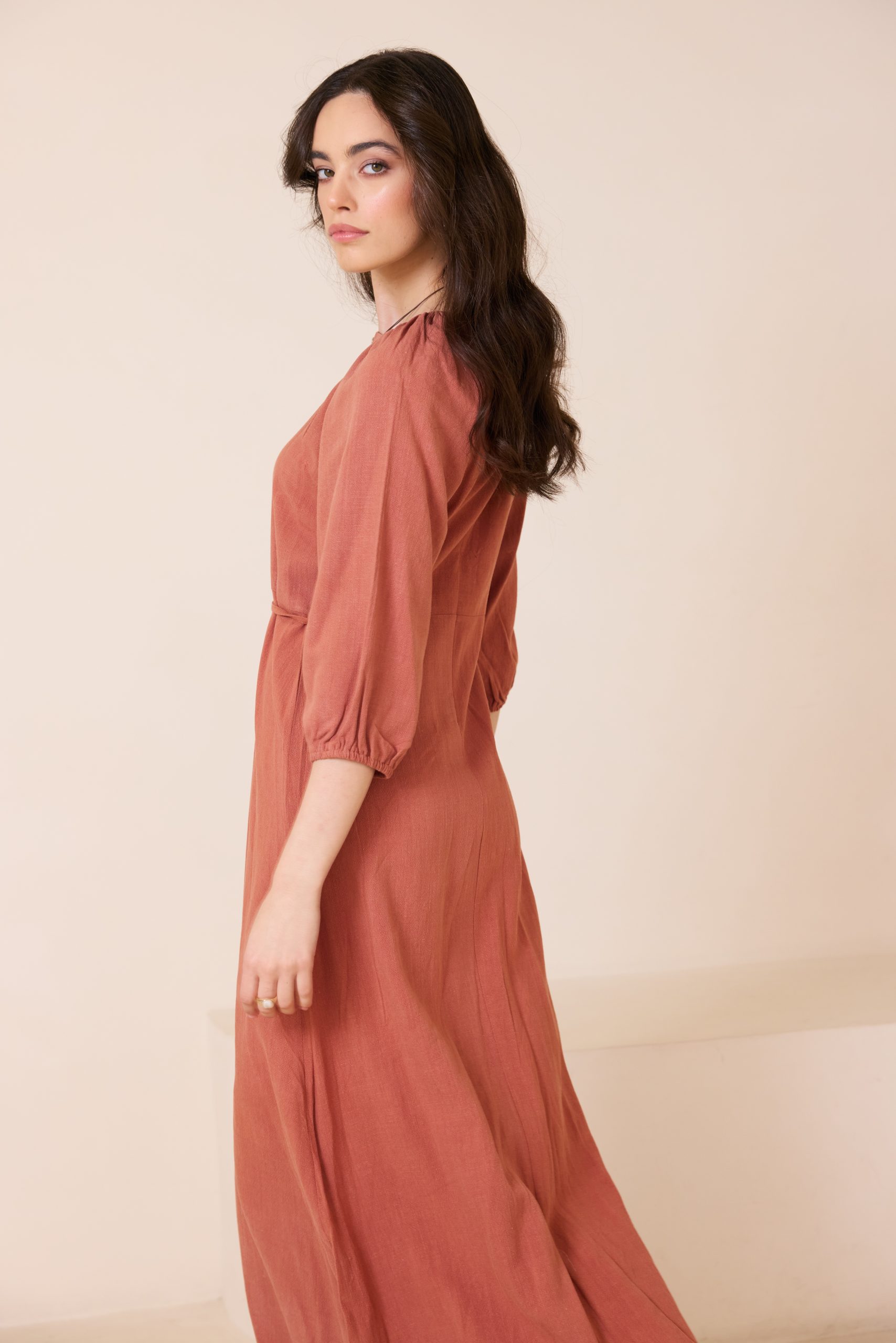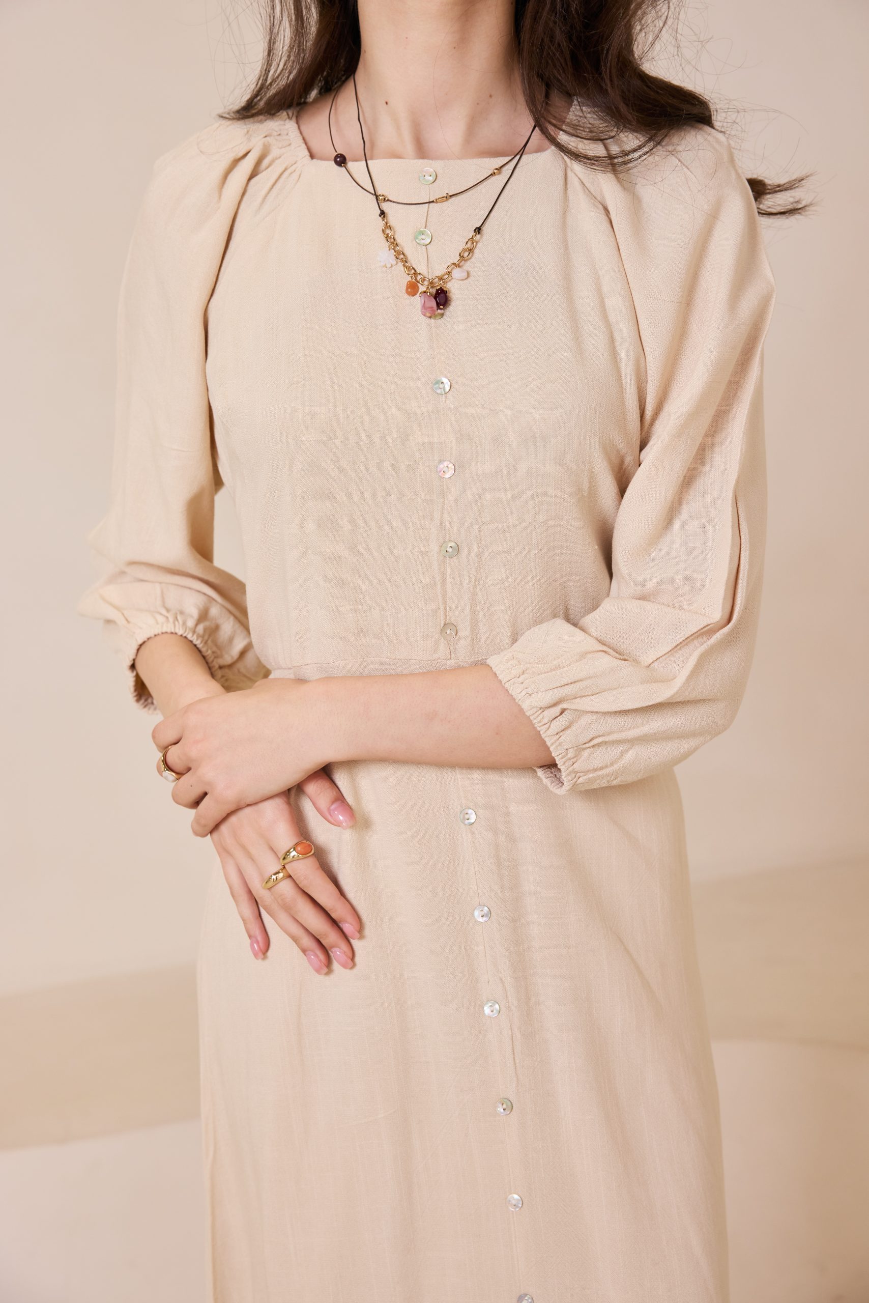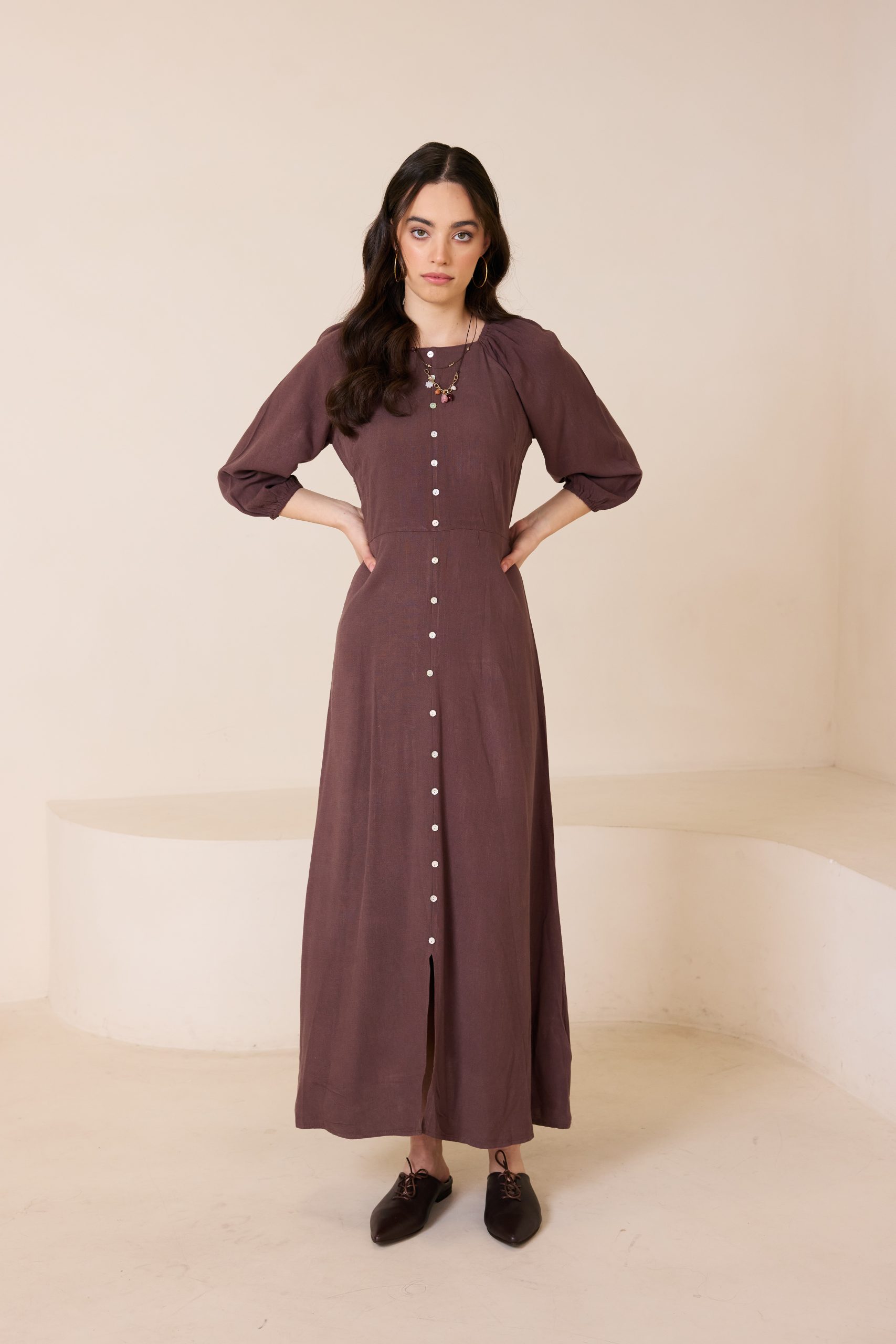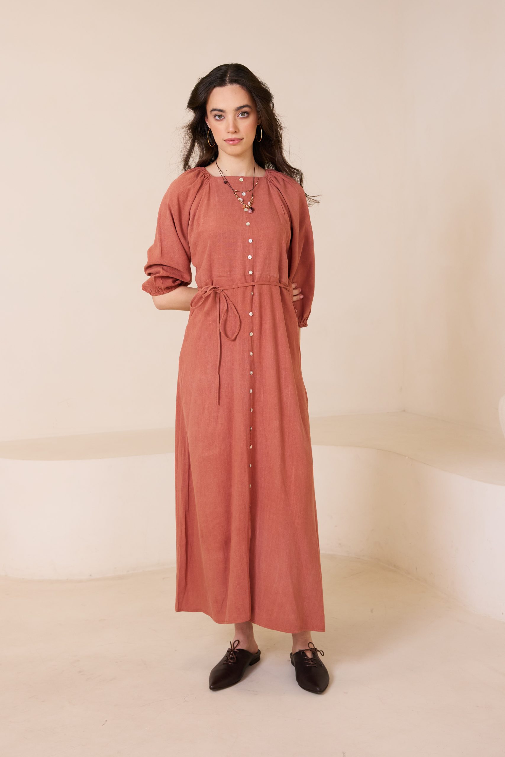 שמלת מקסי קלאסית מבד פשתן איכותי, אוורירי ונעים, המשלבת סגירת דמוי כפתורים אלגנטית לאורכה למראה יוקרתי ובלתי מתאמץ.