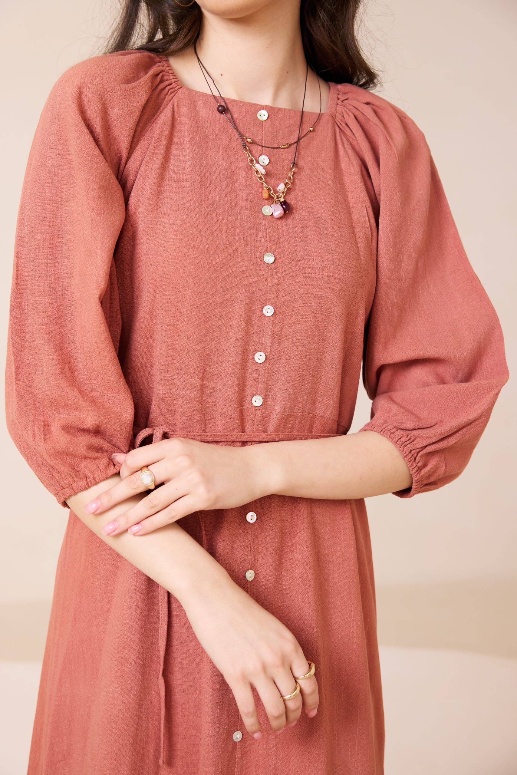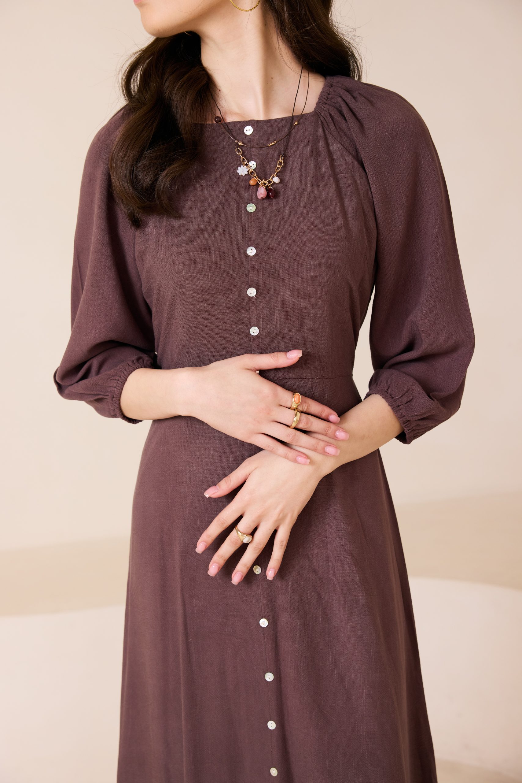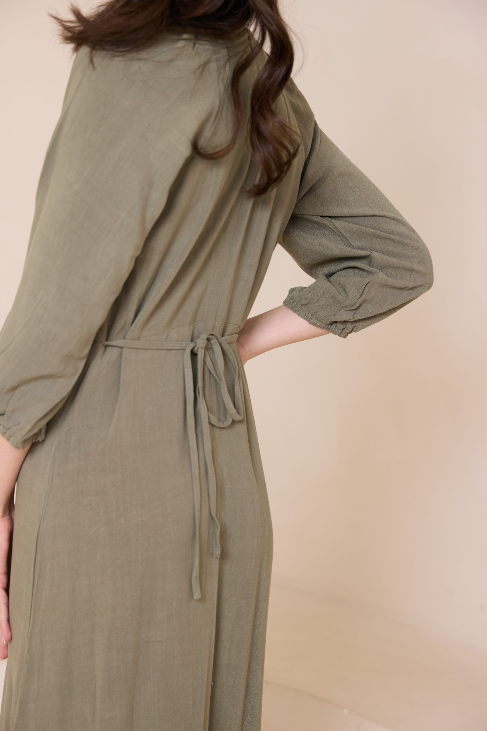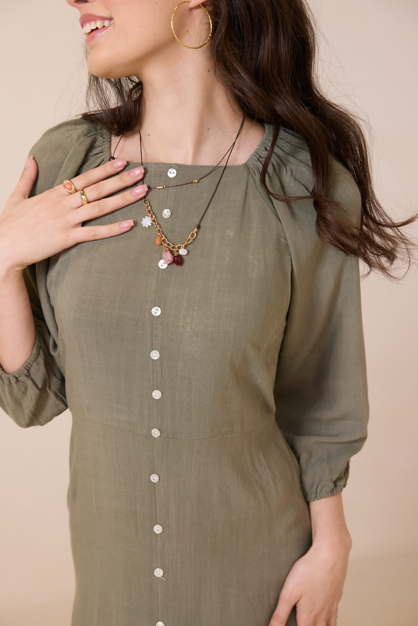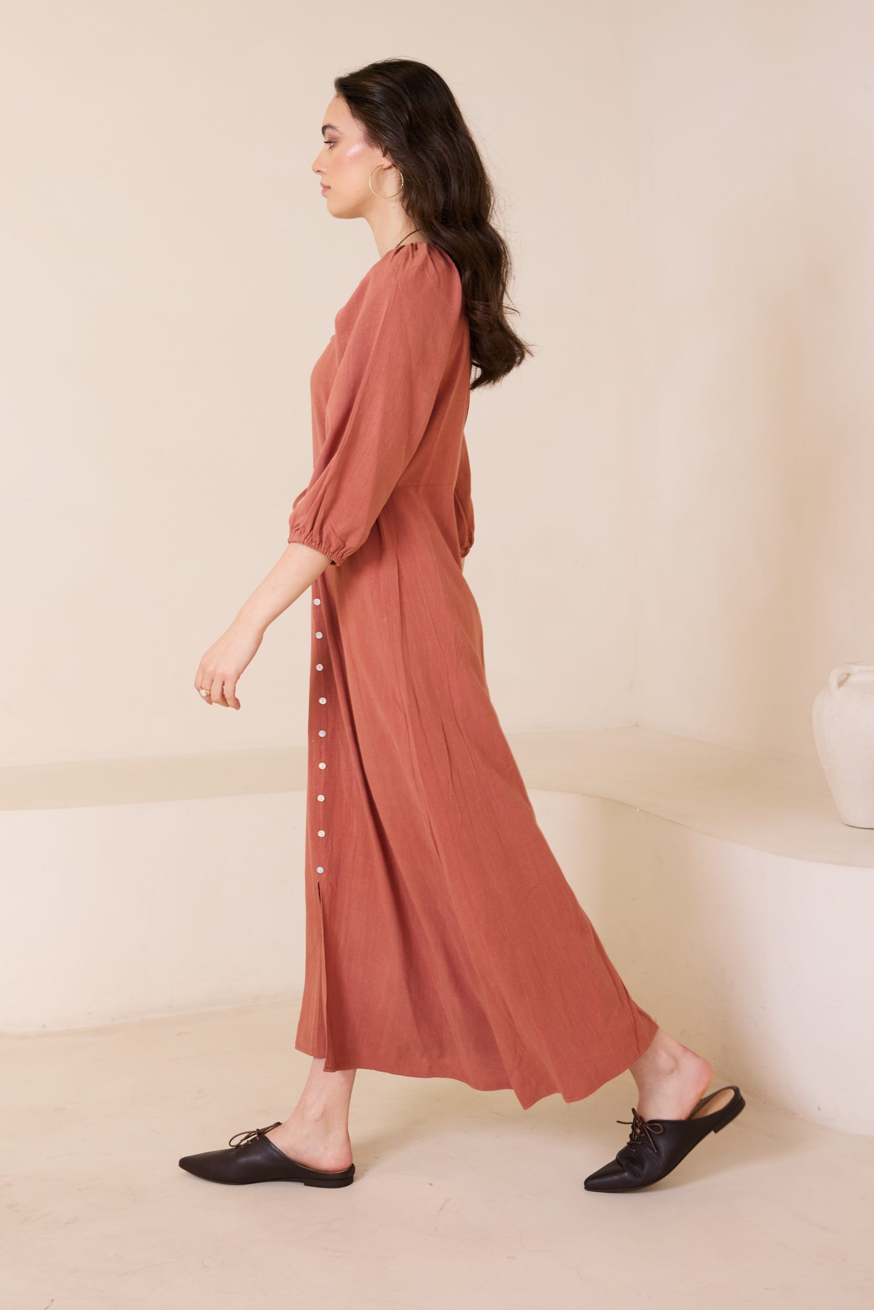 שמלת מקסי קלאסית מבד פשתן איכותי, אוורירי ונעים, המשלבת סגירת דמוי כפתורים אלגנטית לאורכה למראה יוקרתי ובלתי מתאמץ.