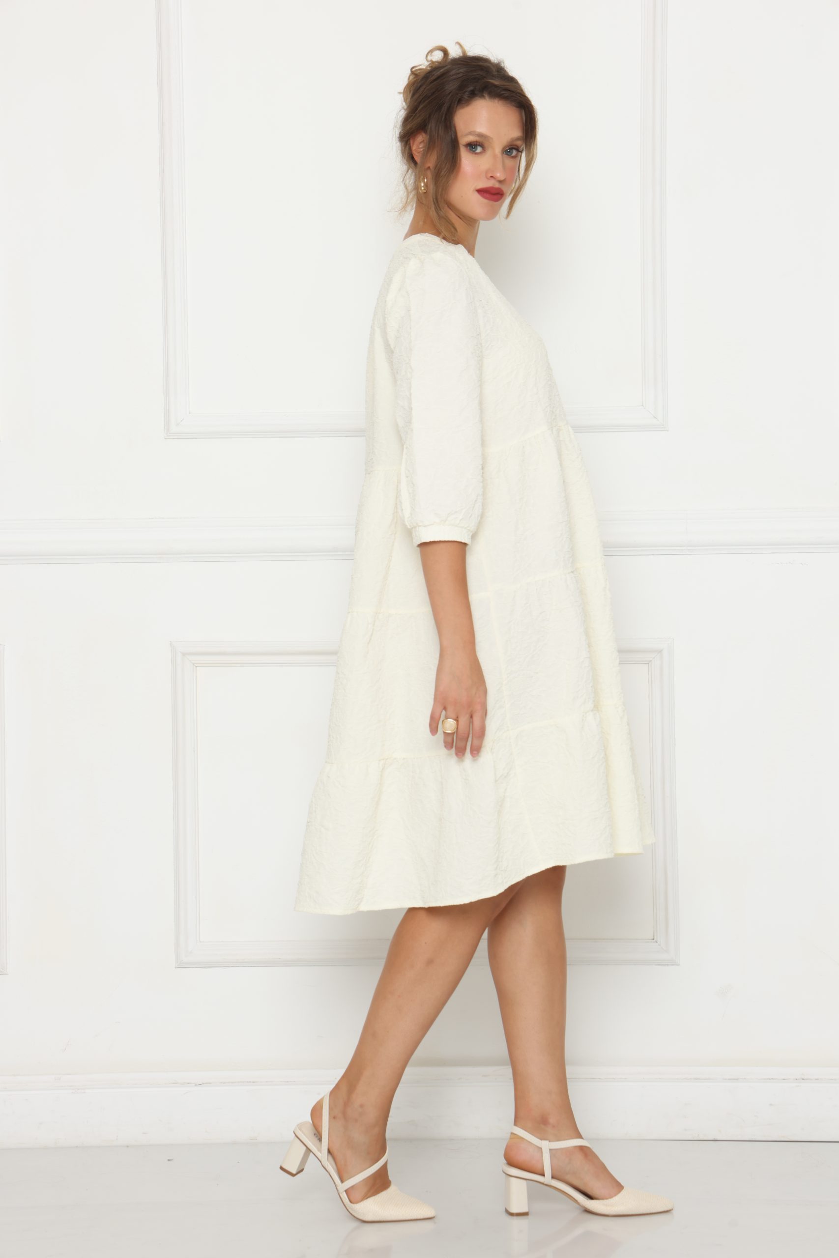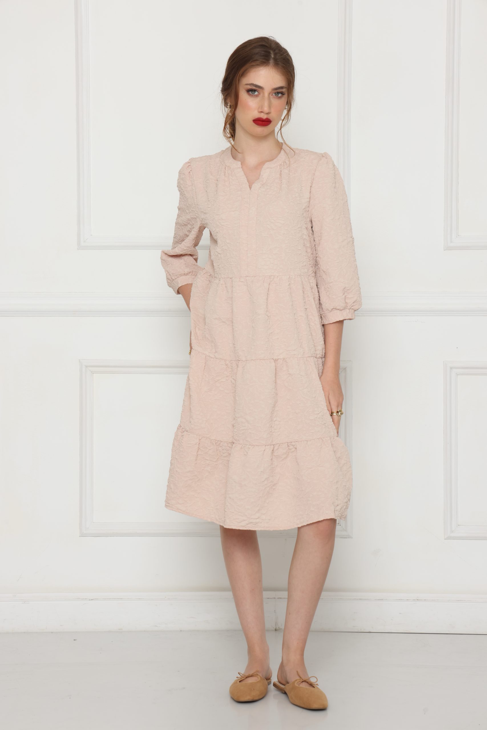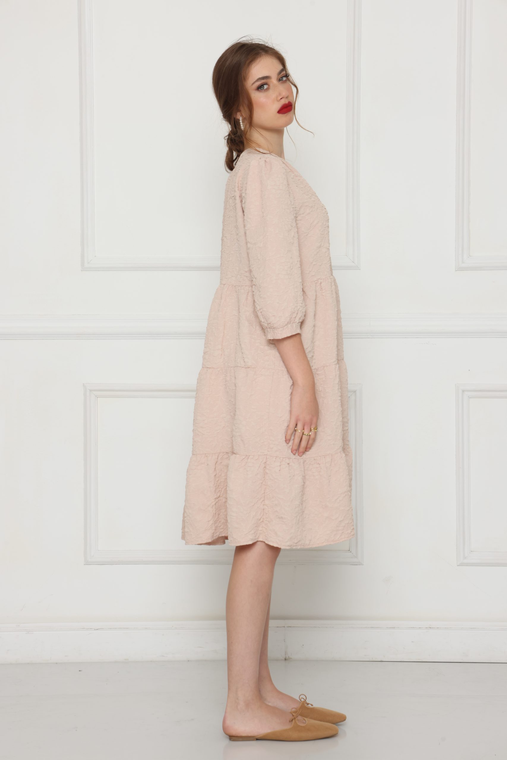 שמלה מרשימה ואלגנטית, בעיצוב קומות עם בד סריג וברוקד יוקרתי, שמעניקה מראה חגיגי ומלא נוכחות לכל אירוע.