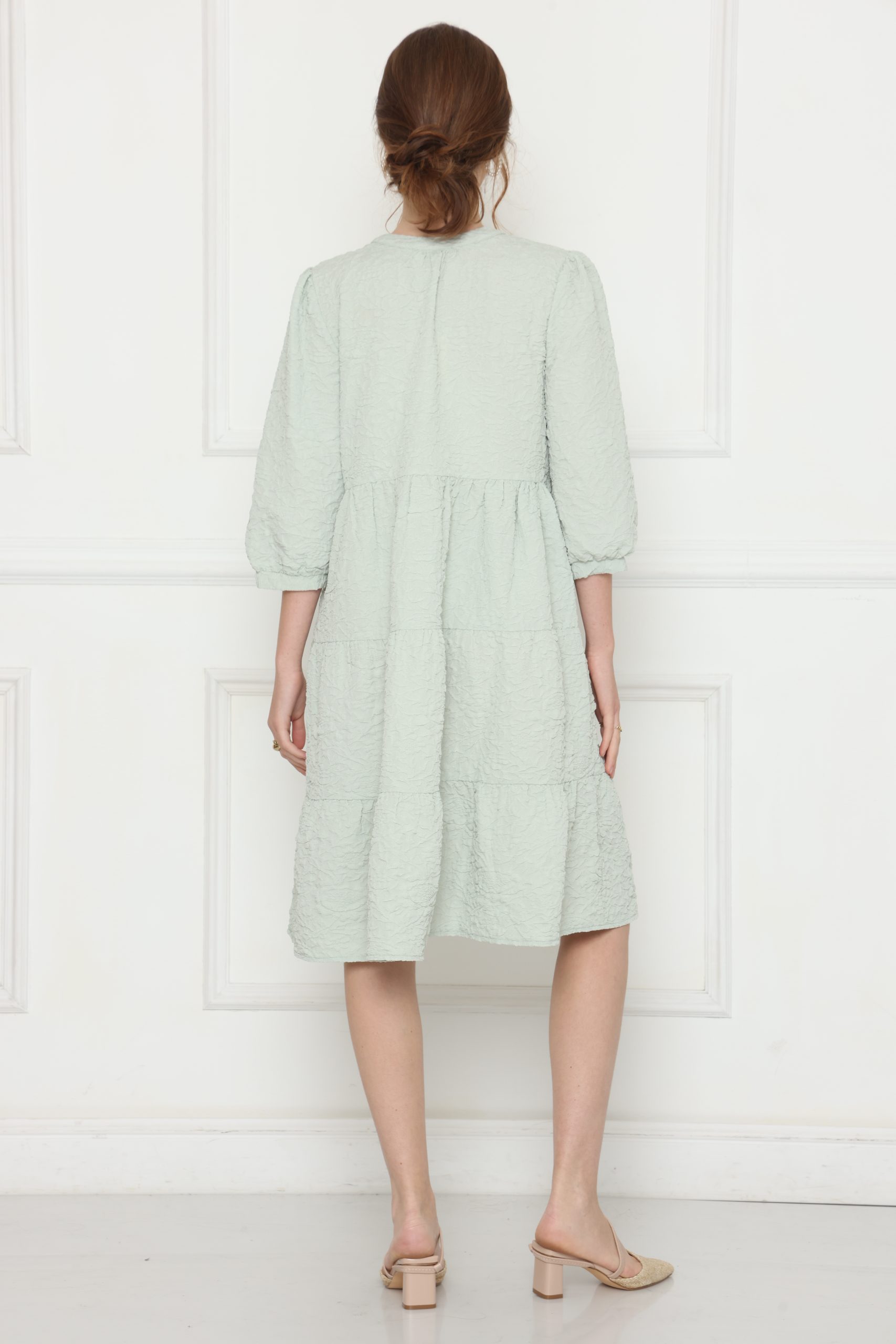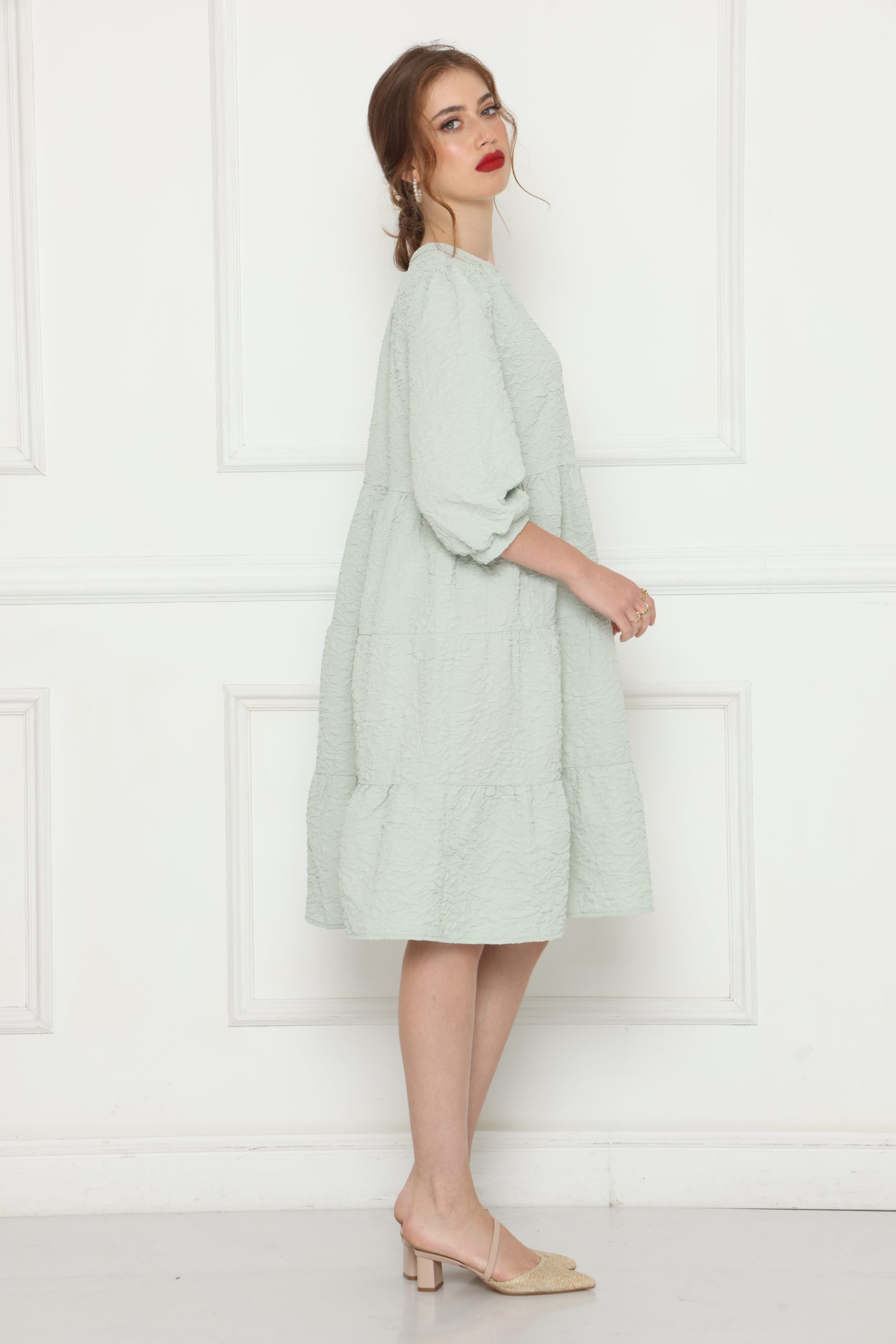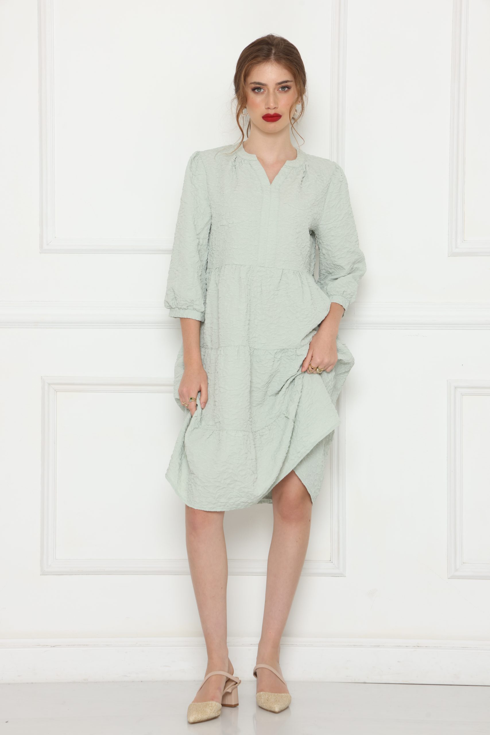 שמלה מרשימה ואלגנטית, בעיצוב קומות עם בד סריג וברוקד יוקרתי, שמעניקה מראה חגיגי ומלא נוכחות לכל אירוע.