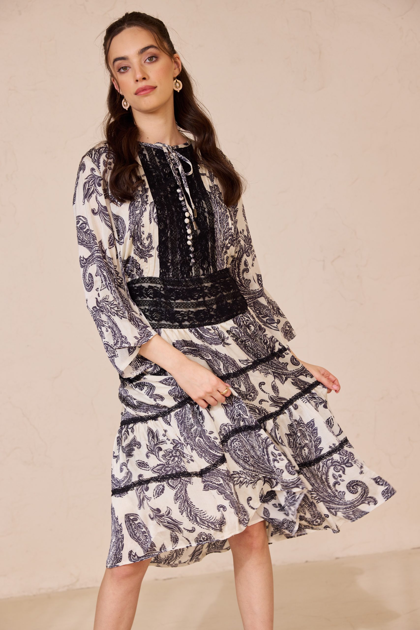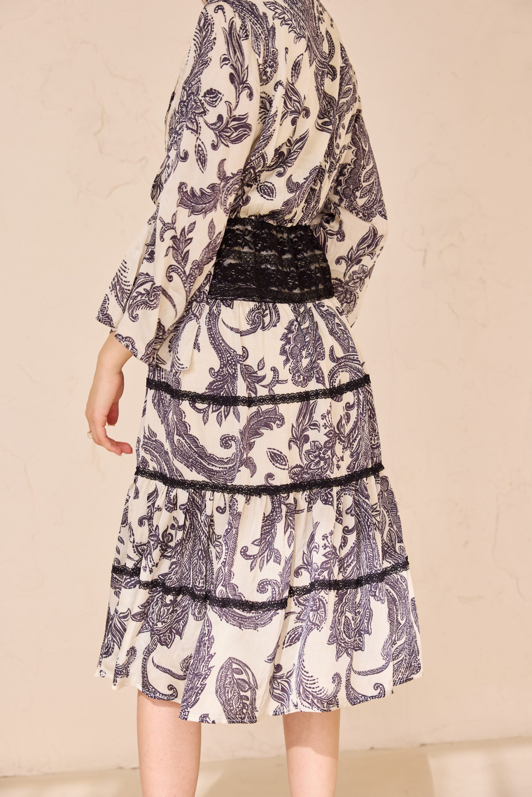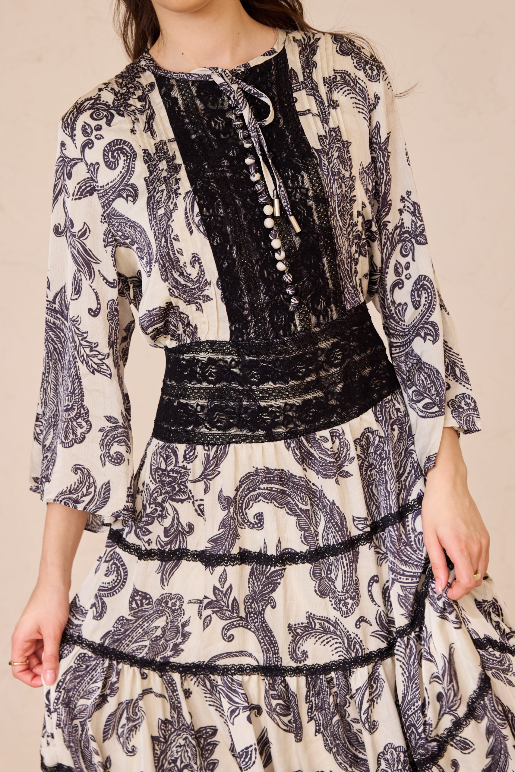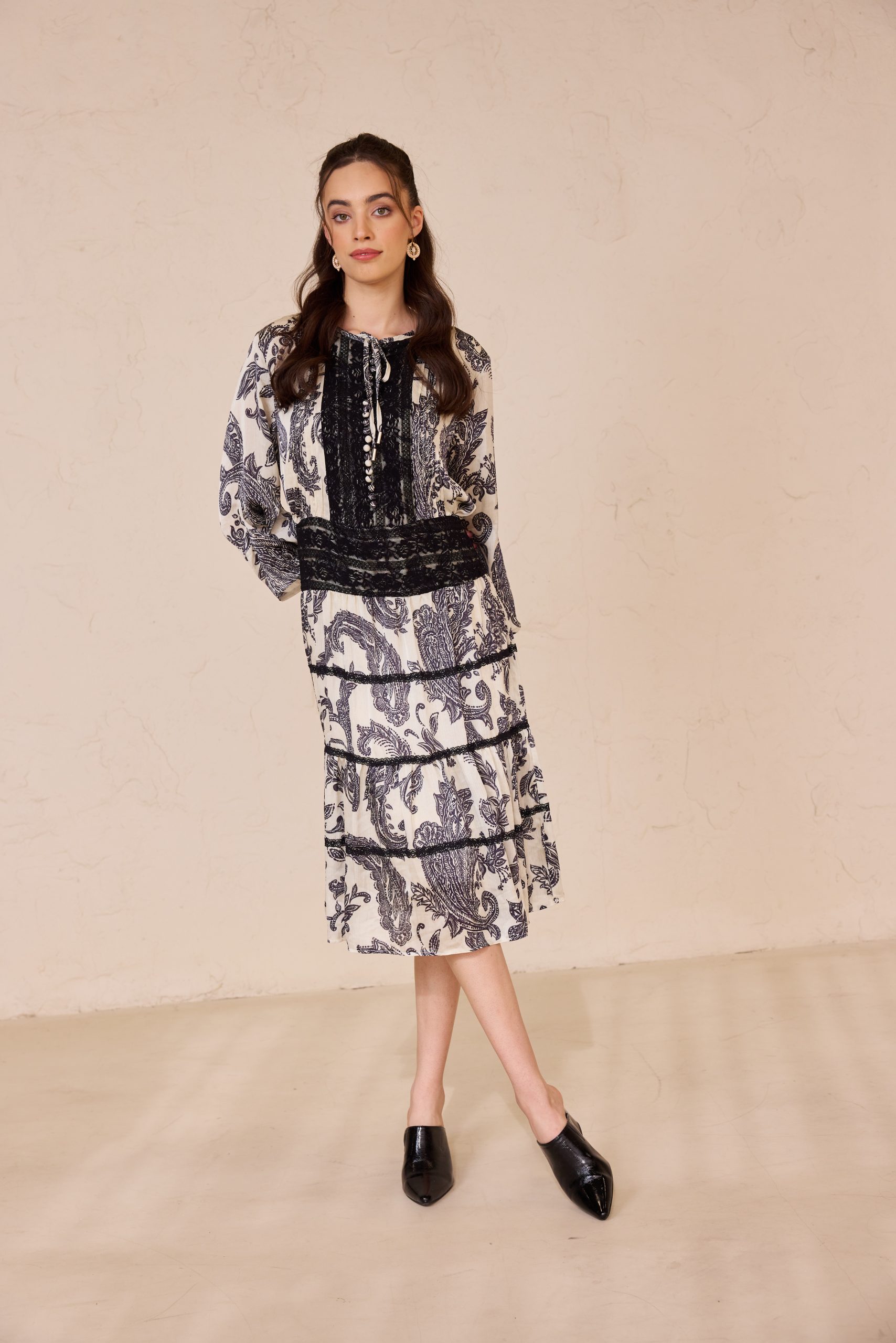 שמלת ערב מרהיבה המשלבת גזרת קומות נשפכת עם שילוב בדים יוקרתי של שיפון קליל ותחרה עדינה.
