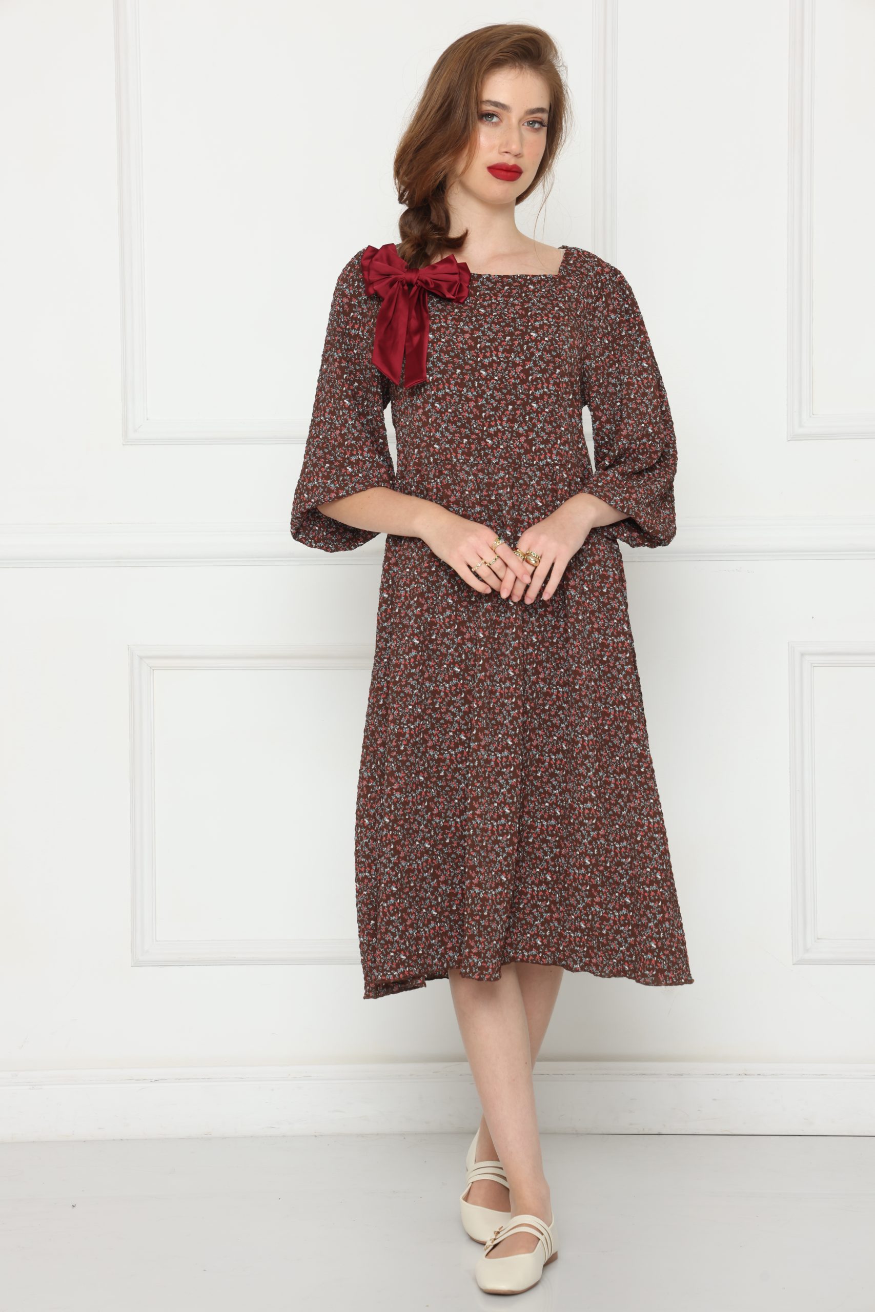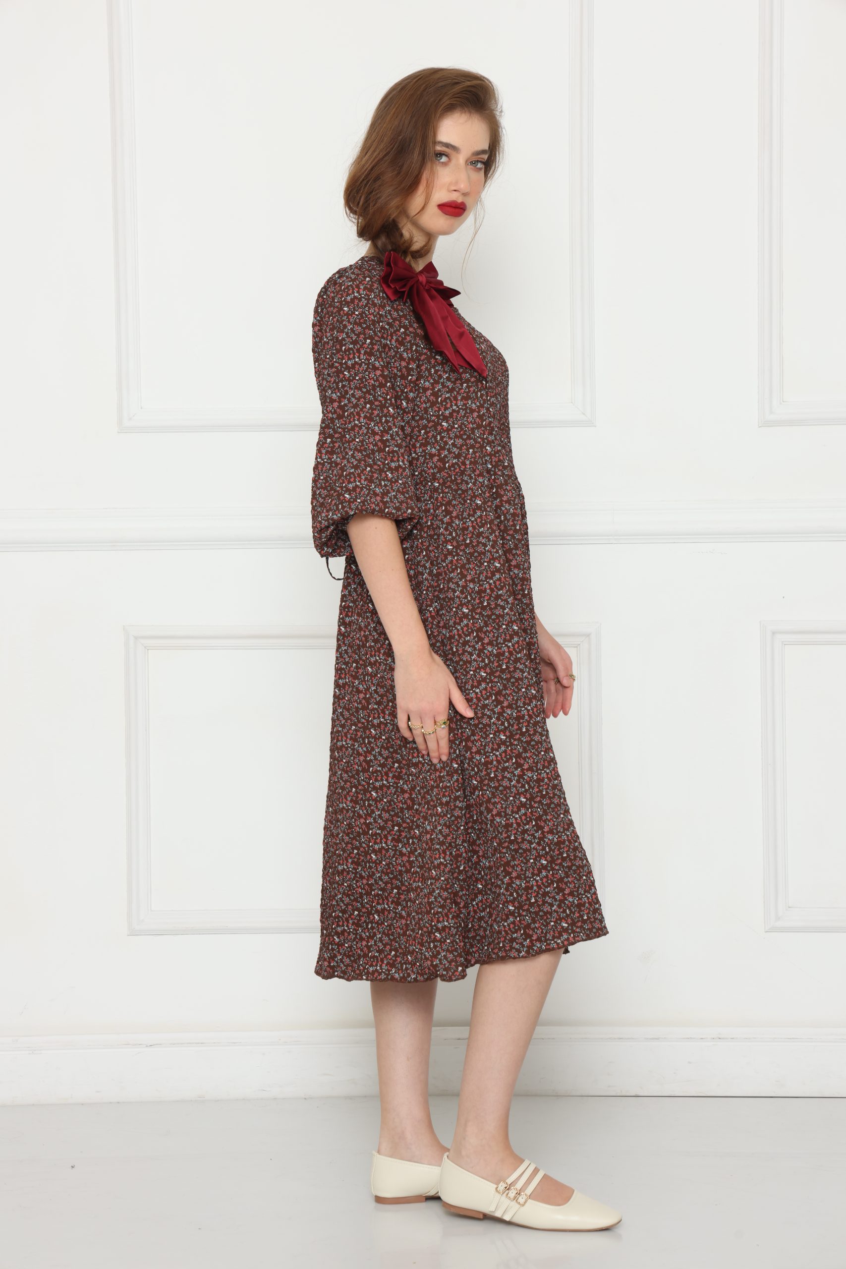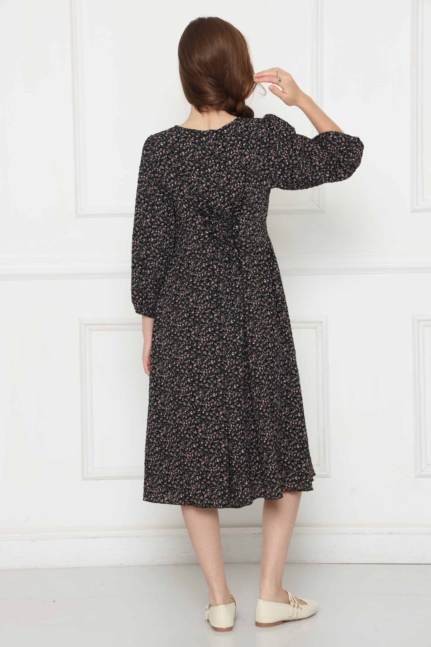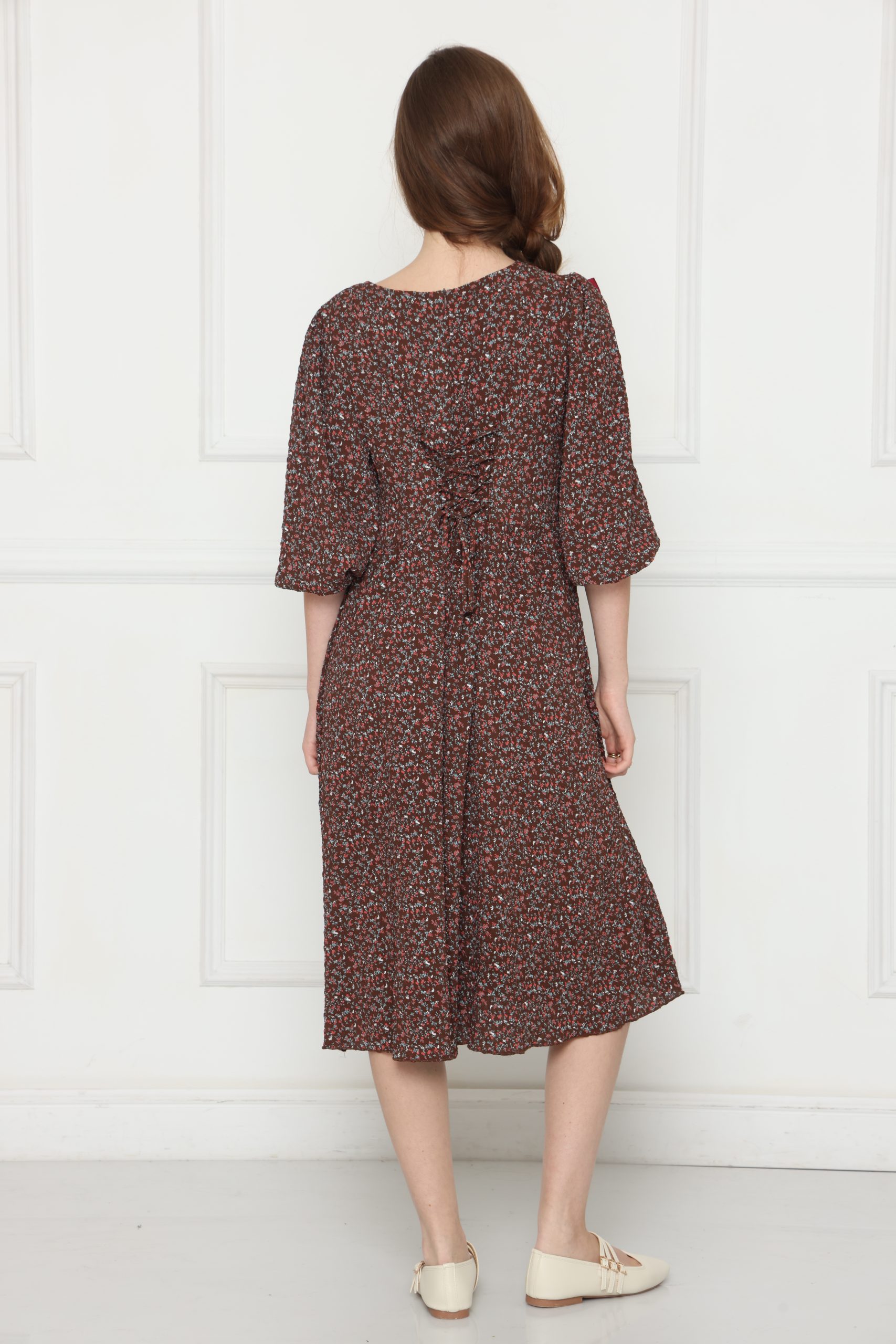 שמלה צנועה ומרשימה עם הדפס ייחודי ועיצוב גב הכולל שרוכים להתאמה אישית, בשילוב בד מקומט שמעניק תנועה זורמת ונוכחות אלגנטית.
