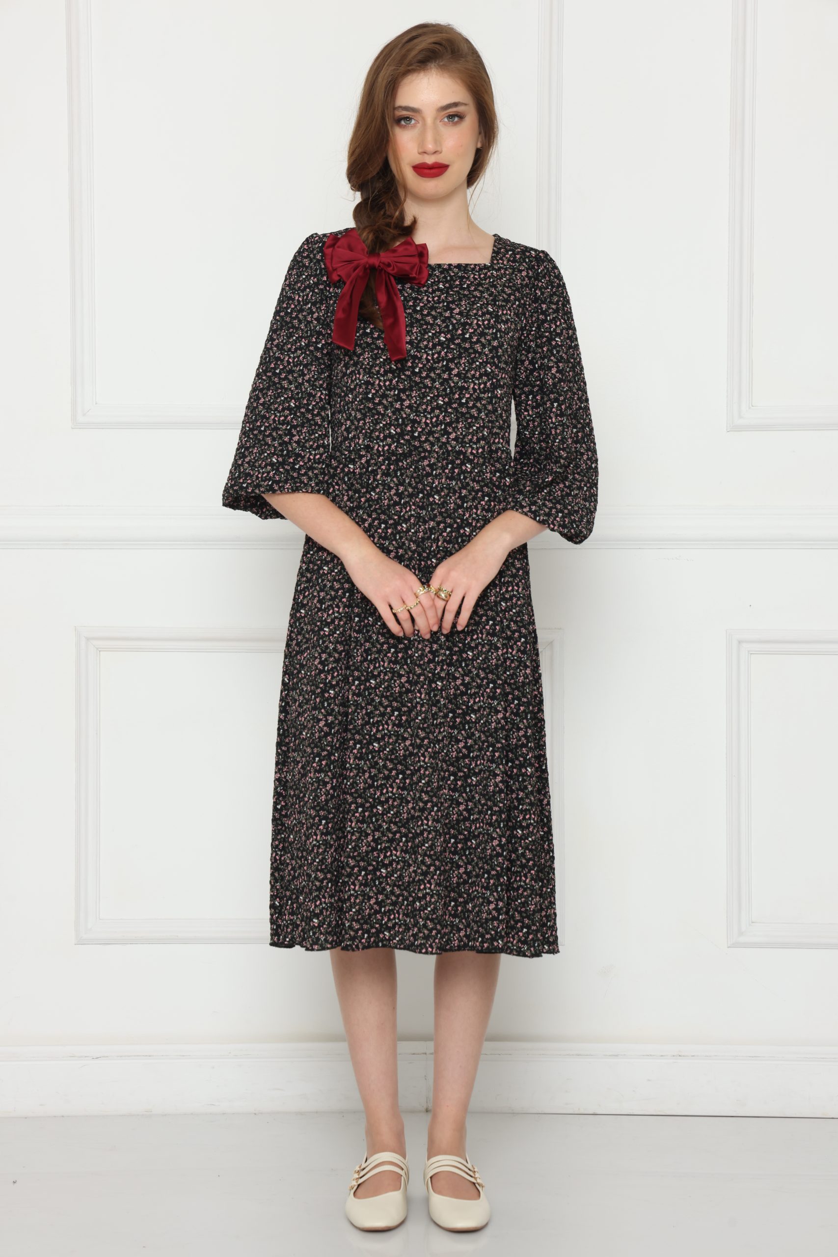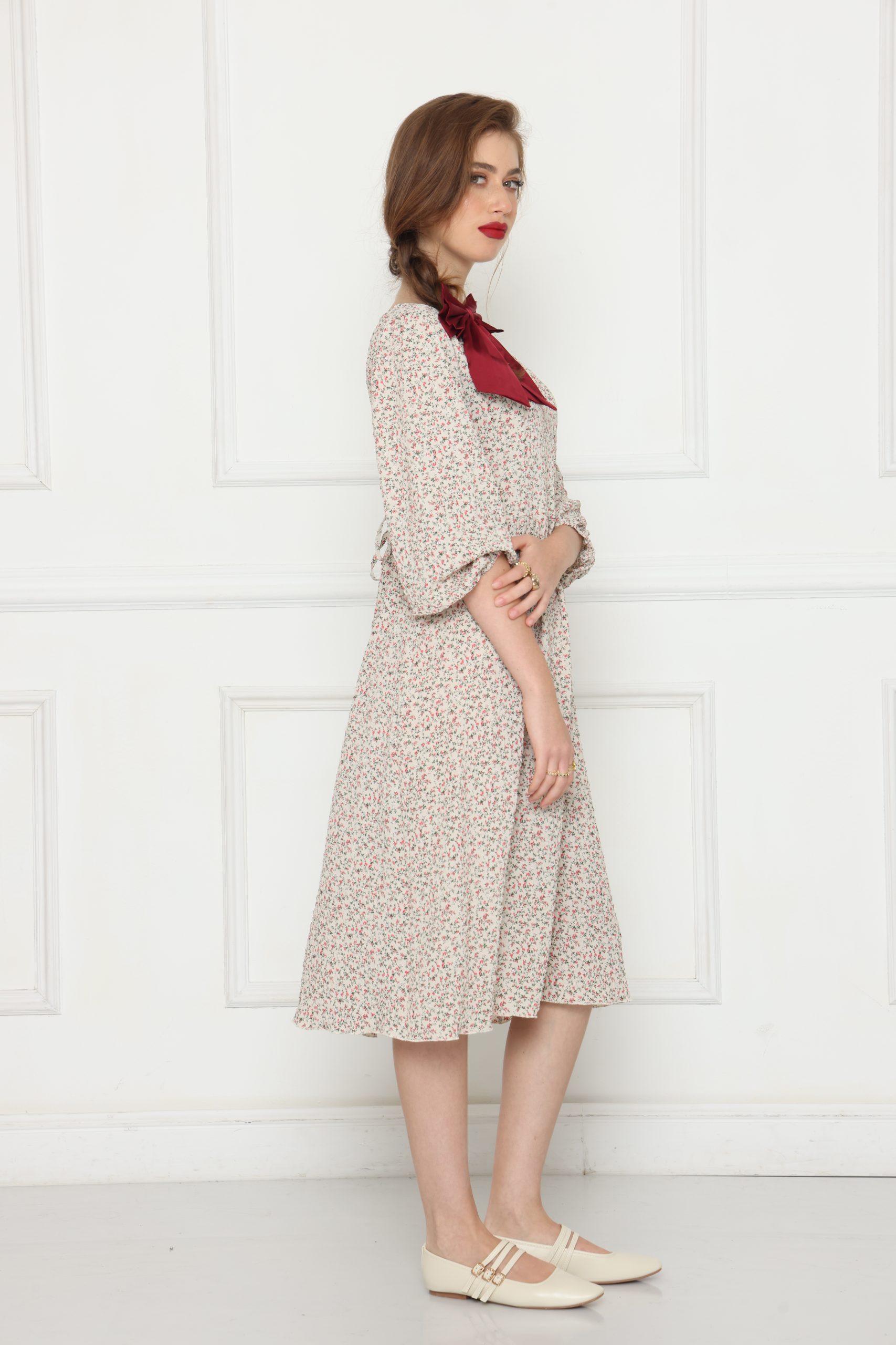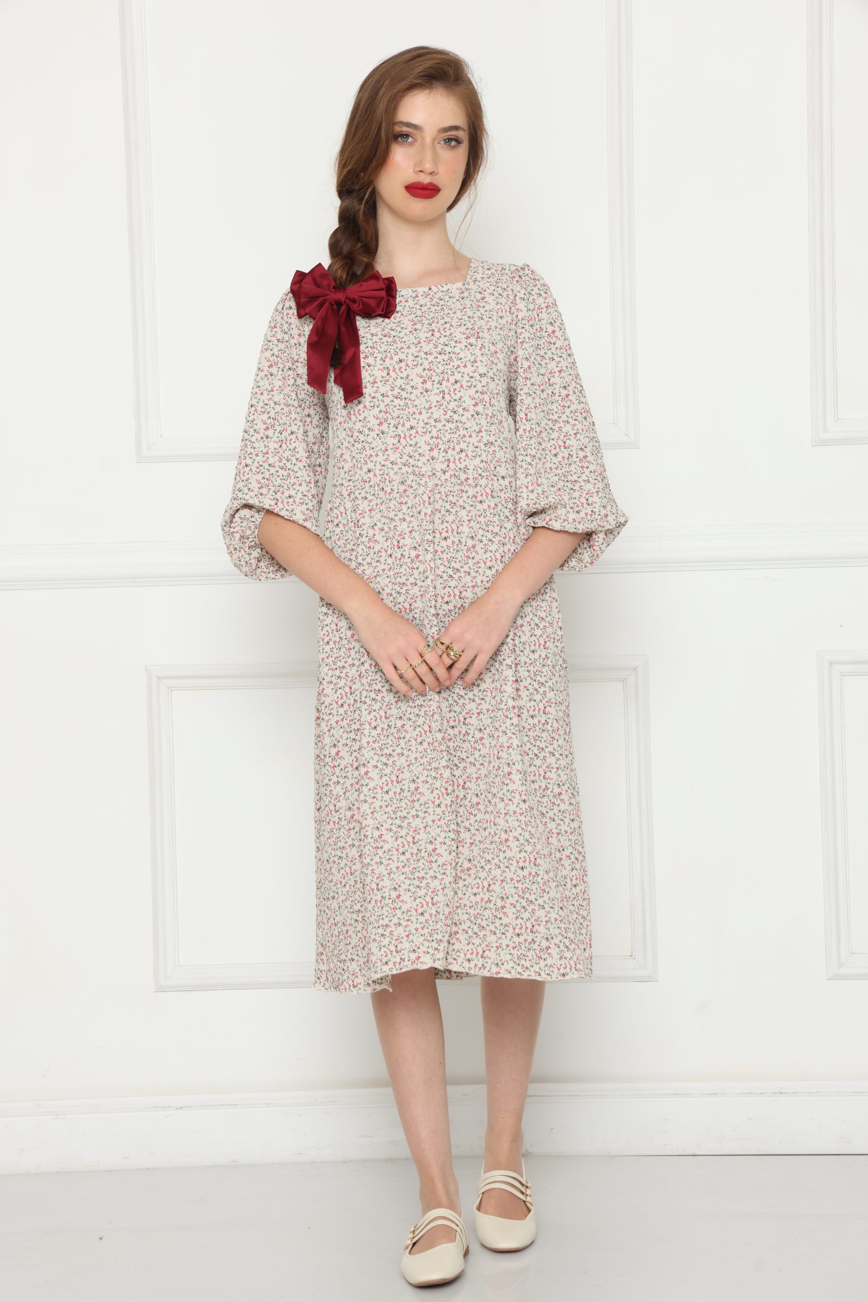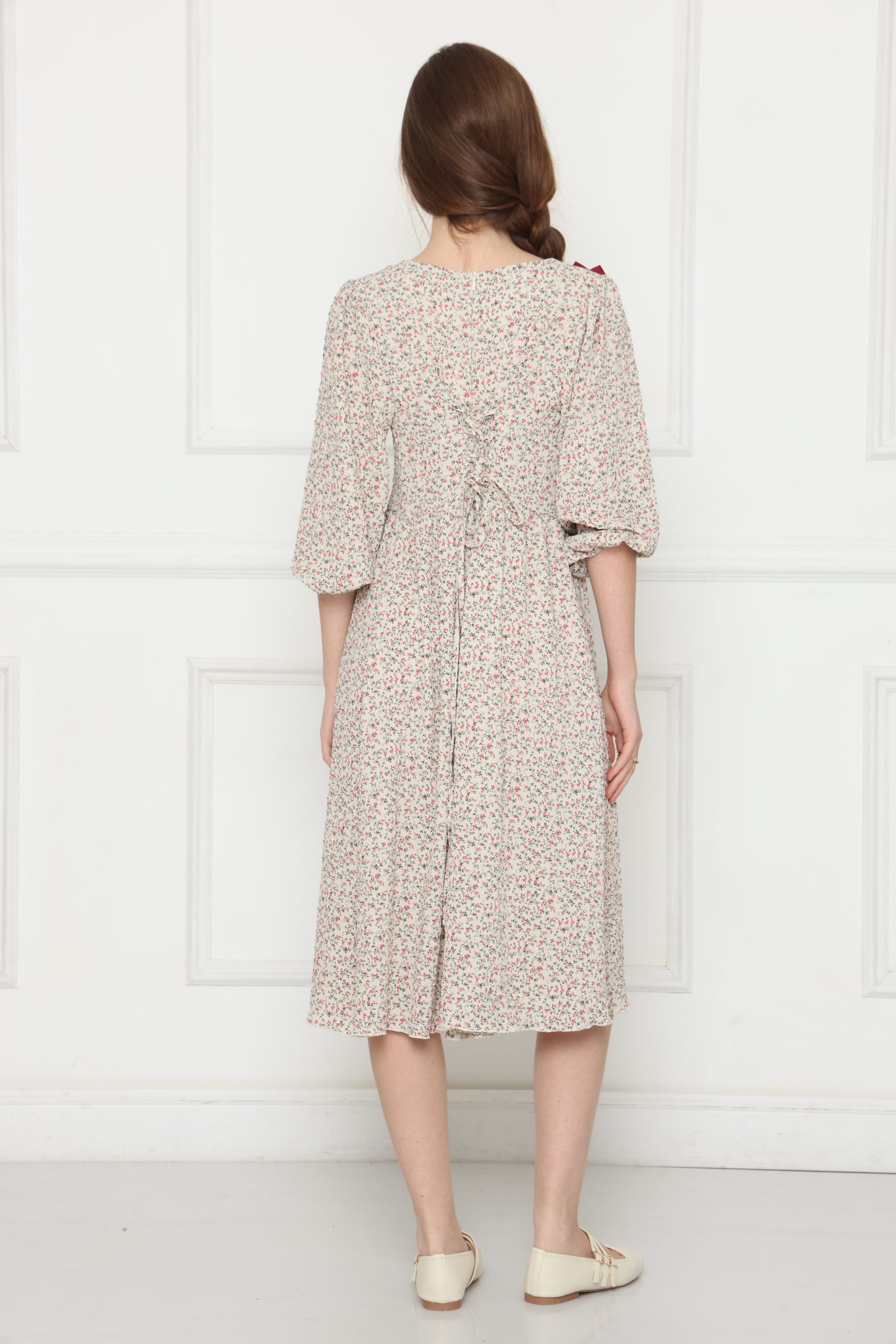 שמלה צנועה ומרשימה עם הדפס ייחודי ועיצוב גב הכולל שרוכים להתאמה אישית, בשילוב בד מקומט שמעניק תנועה זורמת ונוכחות אלגנטית.