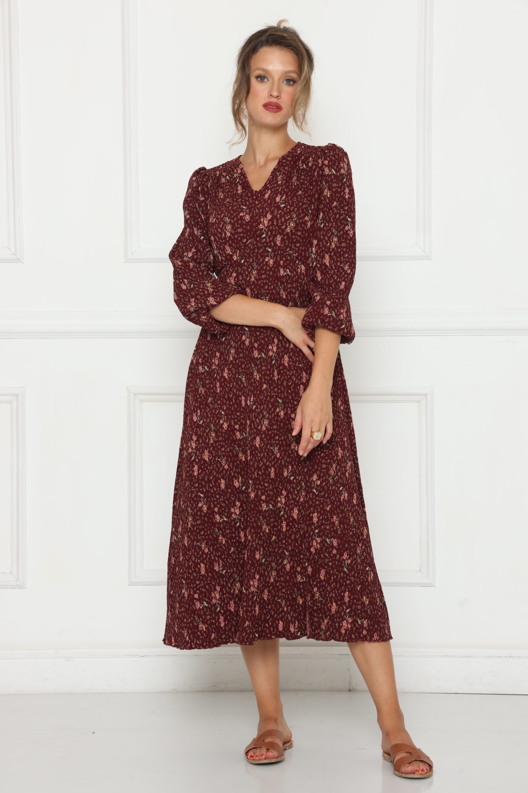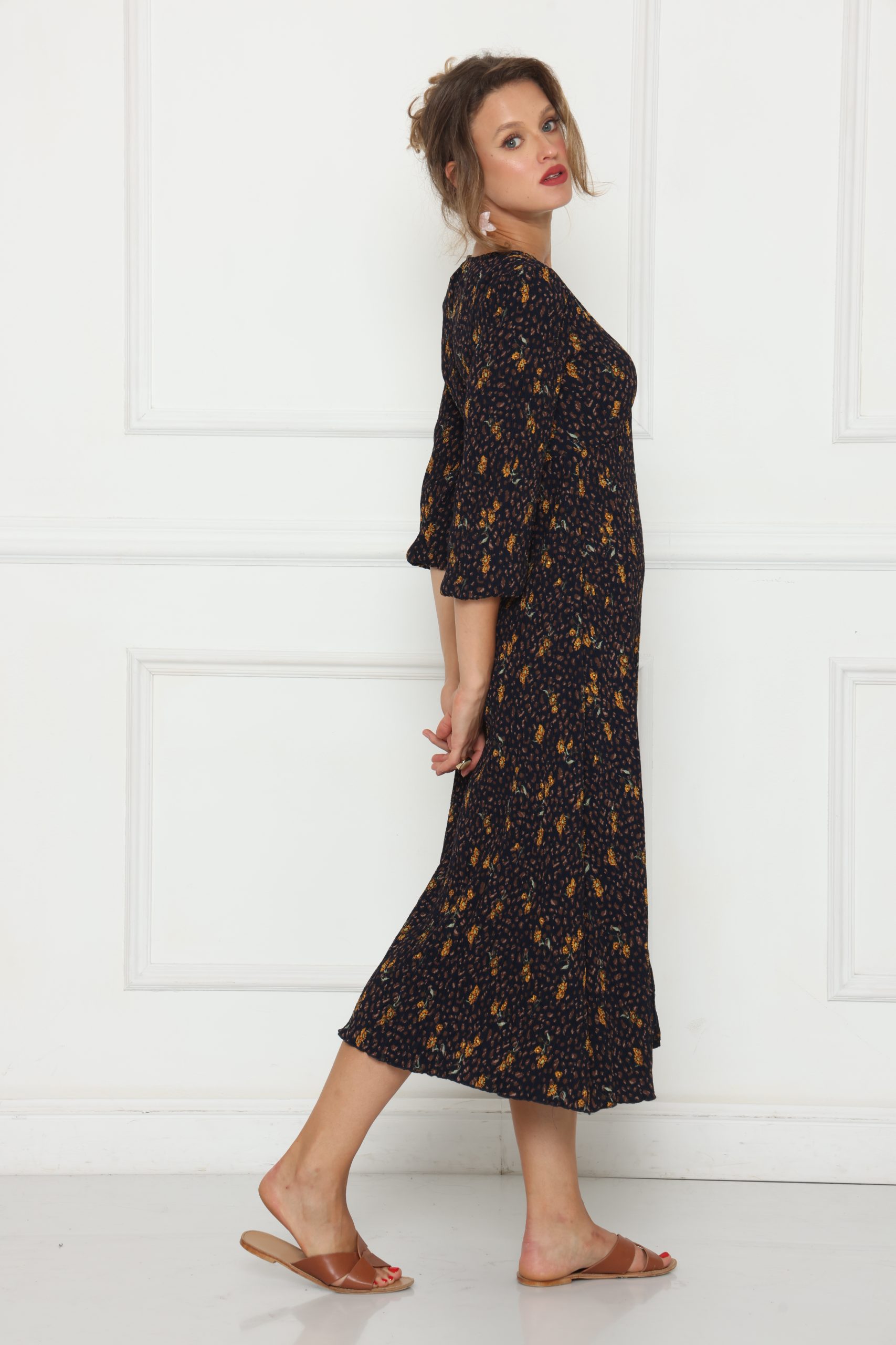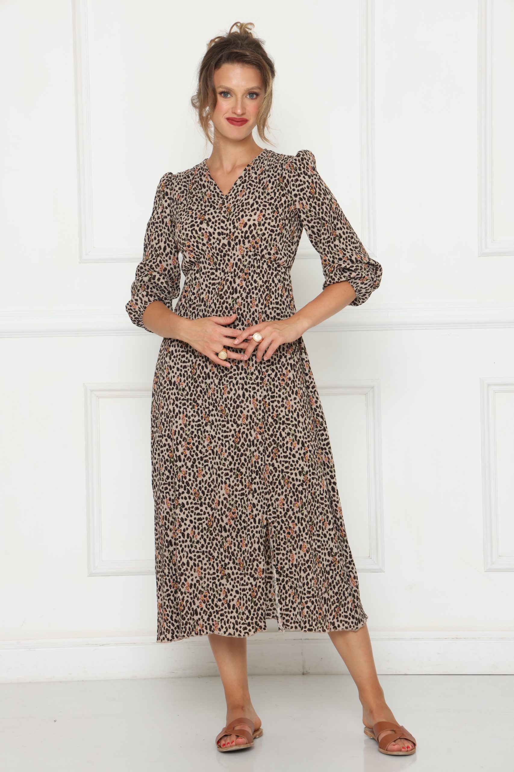 שמלה מודפסת המשלבת נוחות עם מראה עכשווי ואלגנטי. מפתח ה־V עם כיווץ עדין יוצר מראה נשי מחמיא תוך שמירה על צניעות, והבד המקומט מעניק טאץ’ קליל ואוורירי. הגזרה המשוחררת מתאימה לכל מבנה גוף ומאפשרת תחושת נוחות לאורך כל היום, בעוד השסע הקטן בחזית מוסיף רמז של תנועה וסטייל מודרני.