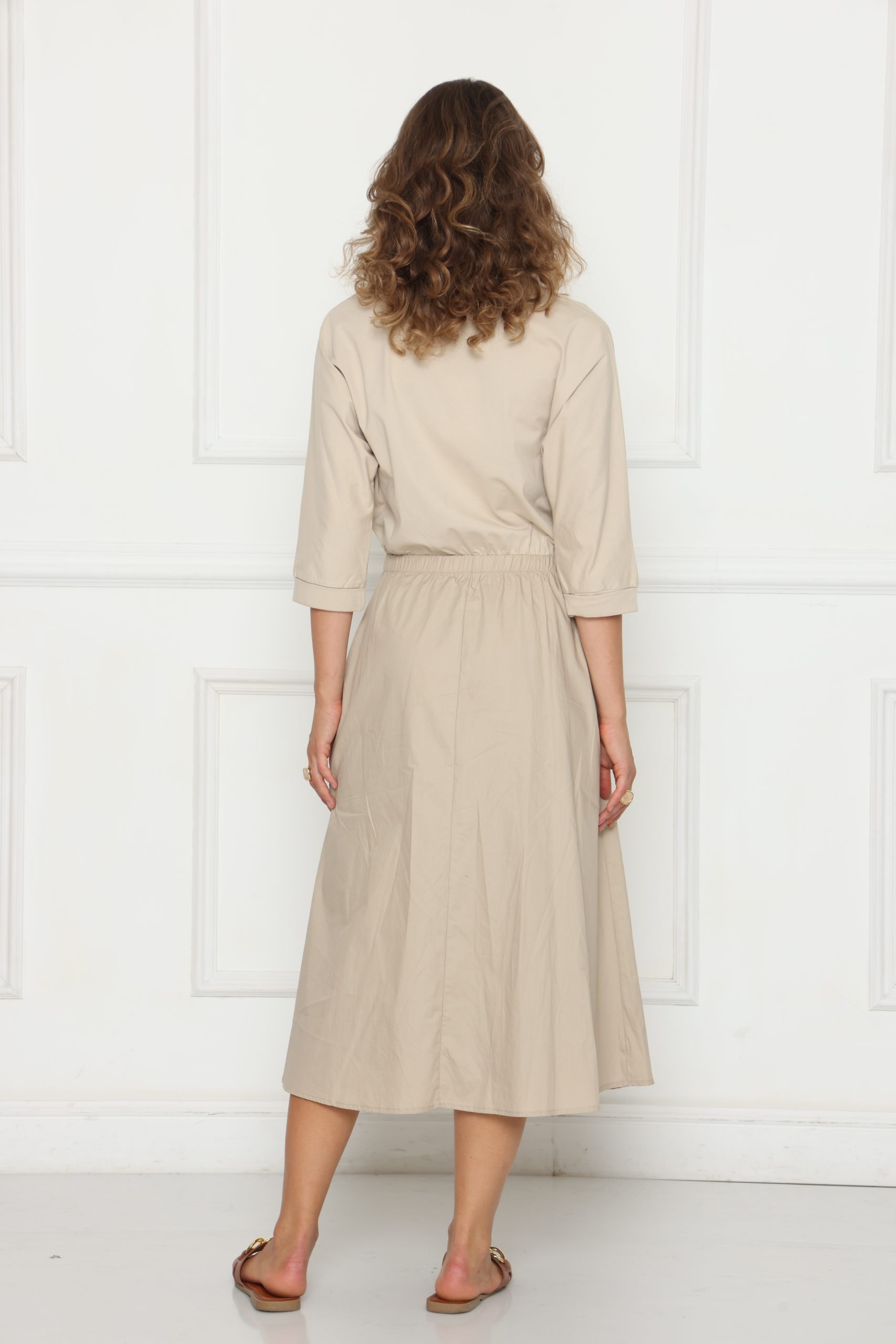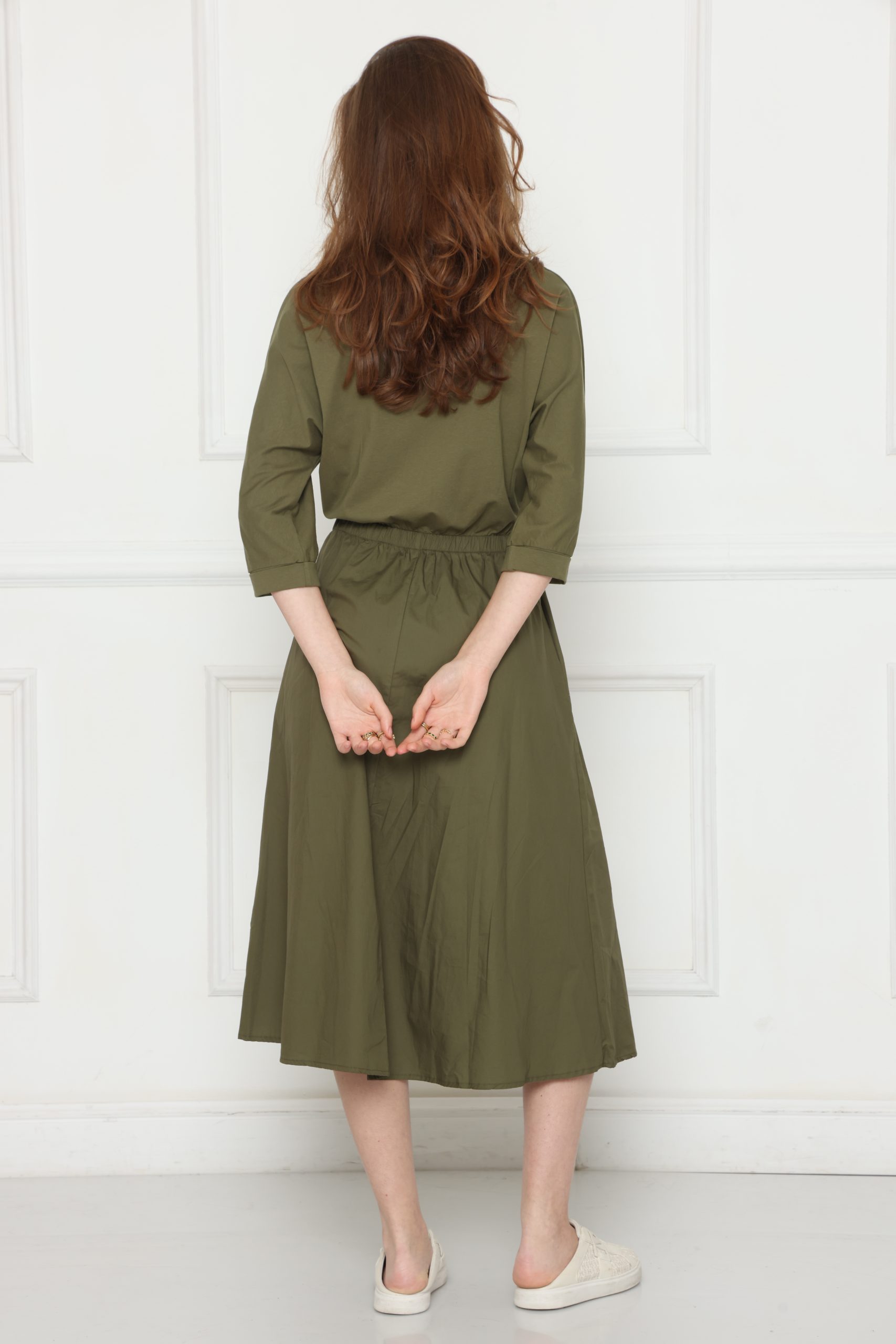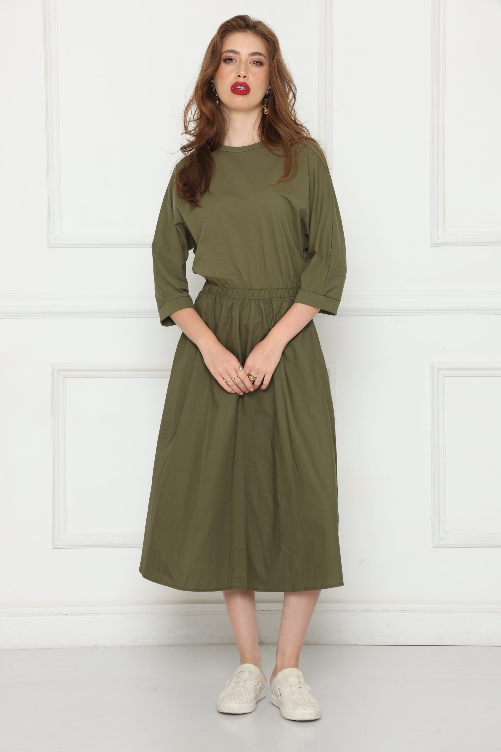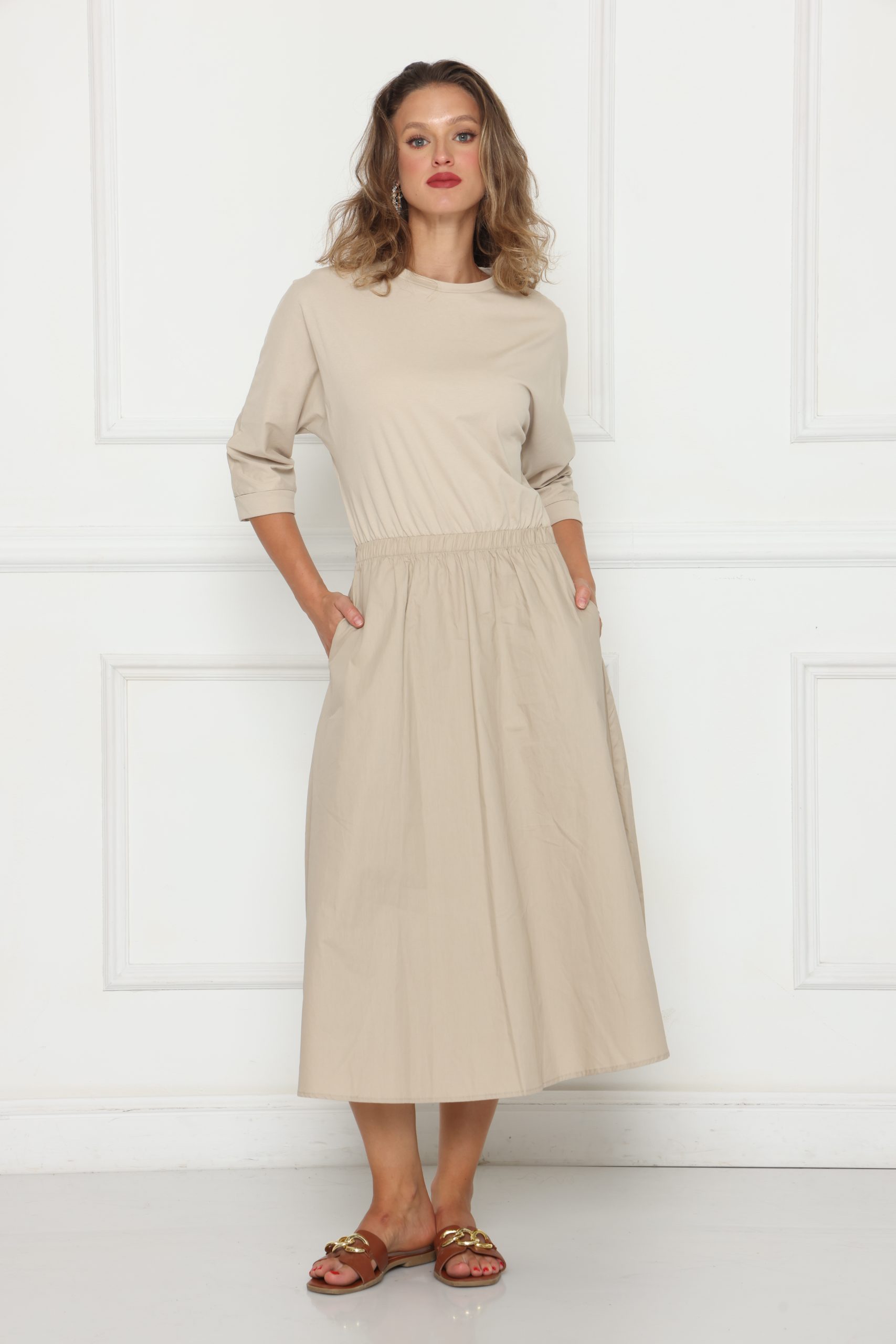 שמלה אלגנטית וצנועה בעיצוב ייחודי של שילוב בדים המעניק עומק ועניין למראה. מצורפת חגורה תואמת להדגשת קו המותן וליצירת גזרה נשית ומחמיאה.