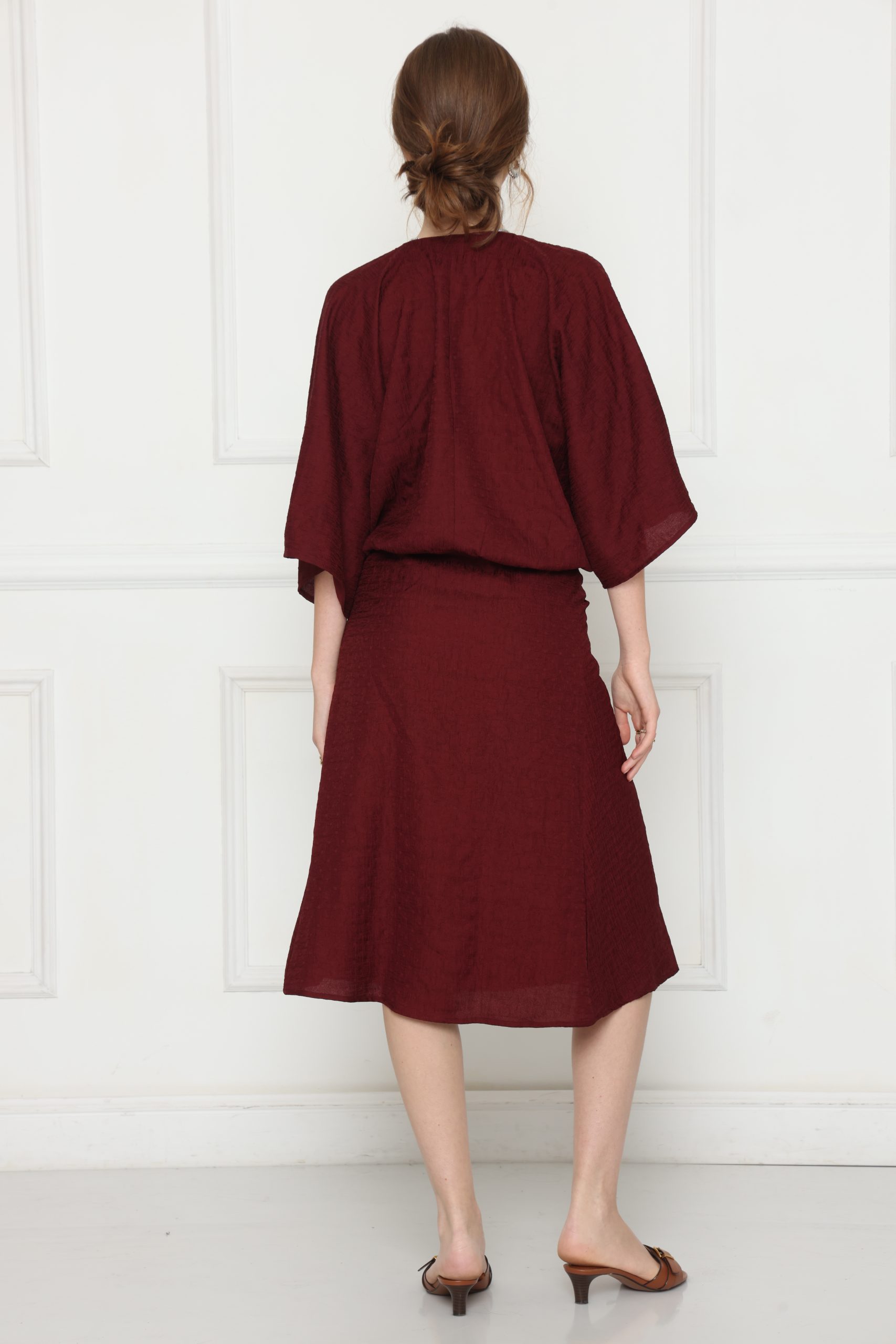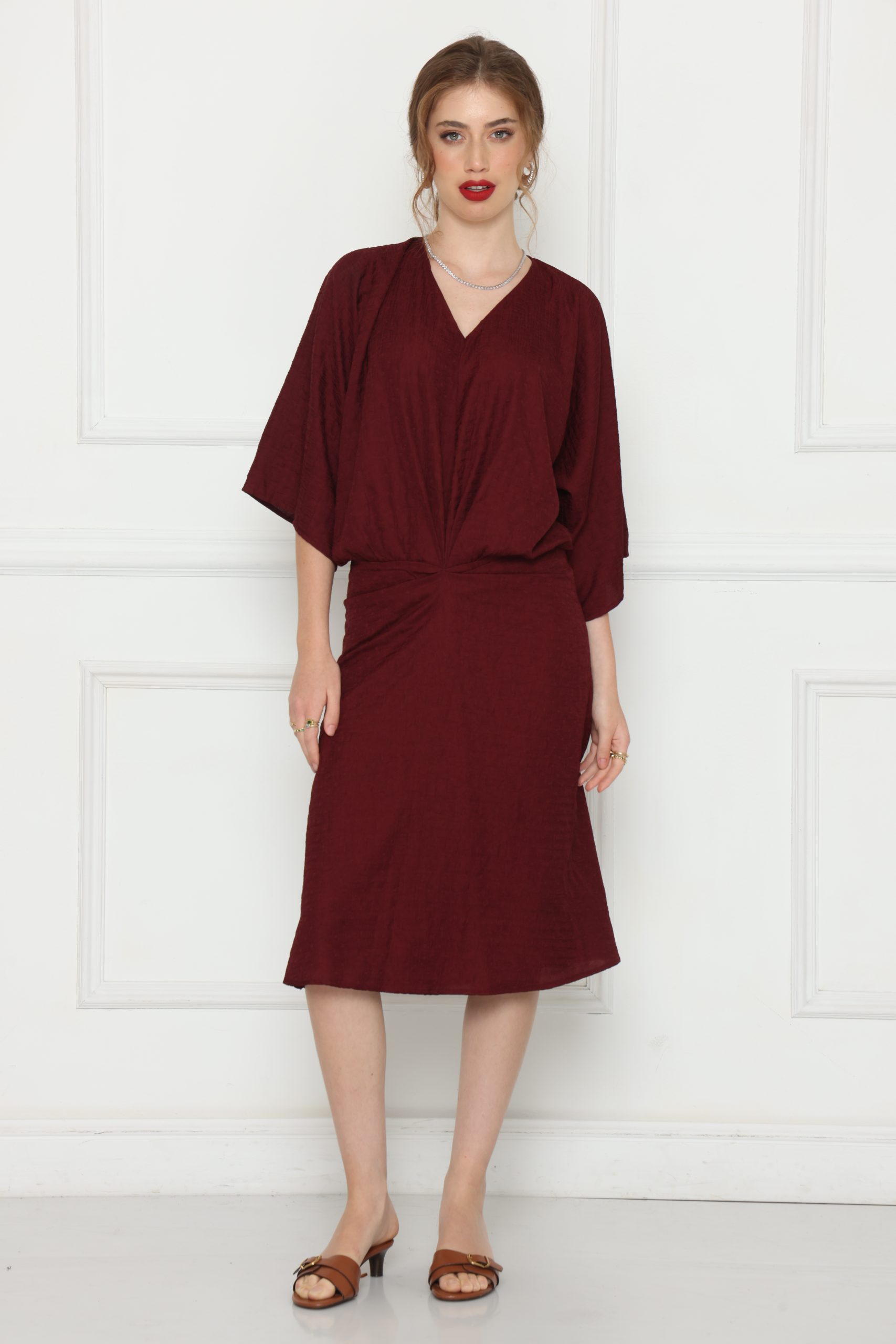 שמלת ערב בצבע בורדו עז, בעיצוב קלאסי עם קו V ונותנת תחושת אורך ואלגנטיות. החיתוך המיוחד במותן המתקפלת מוסיף לשמלה מראה נשי ומחמיא.